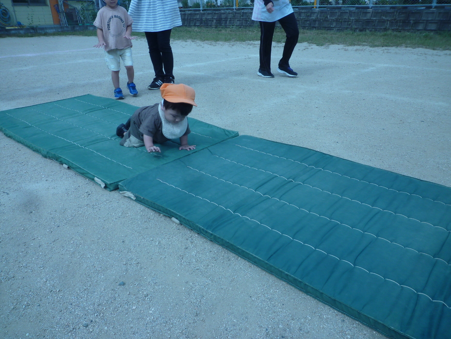 ハイハイでゴールを目指しています。 | ||