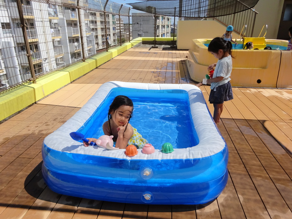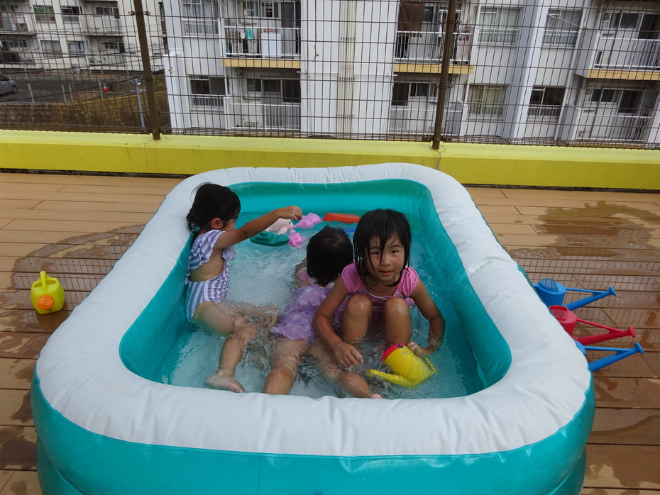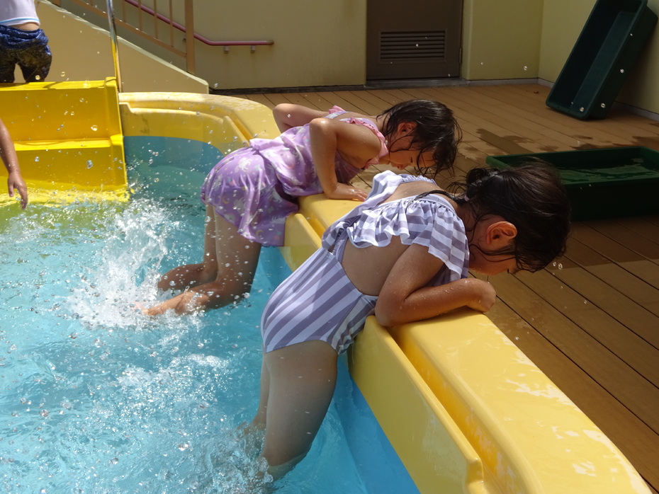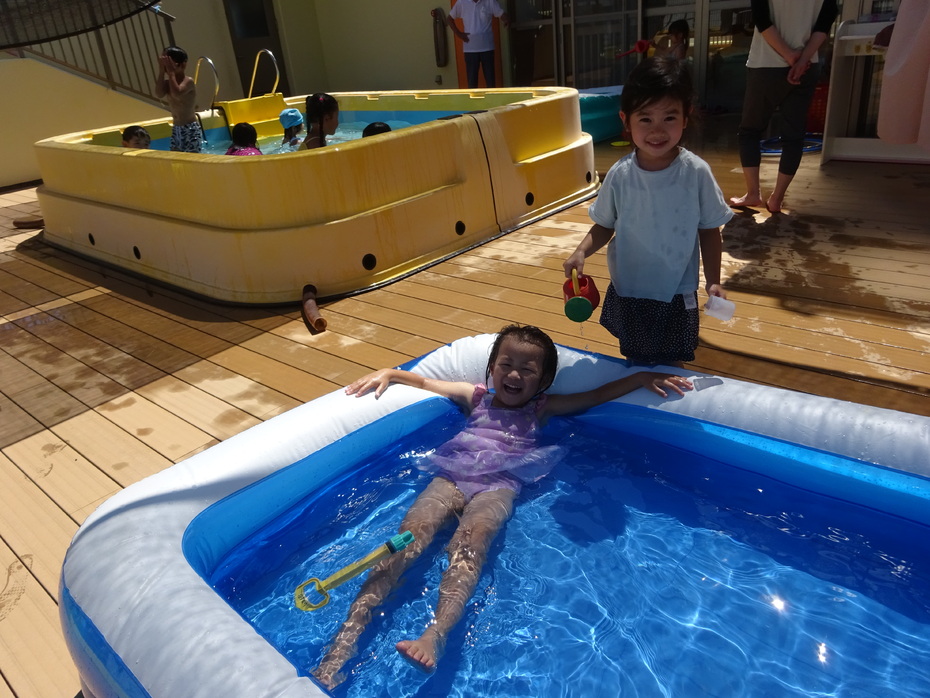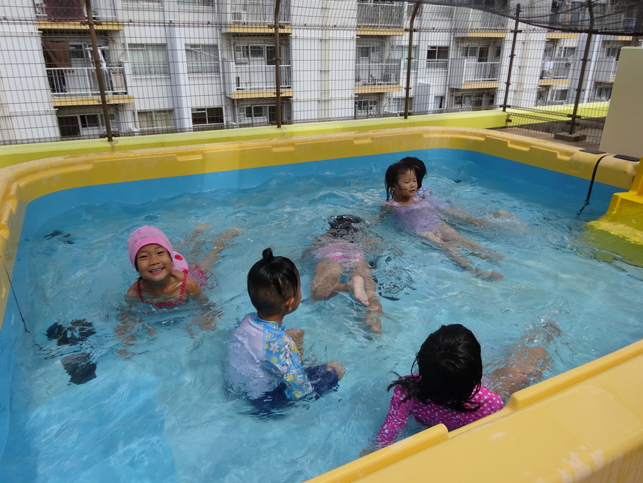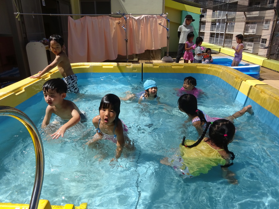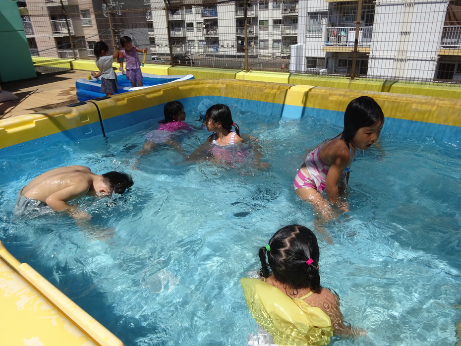 7月、8月でプール、水遊びを楽しみました。7月は水に顔をつけることができなかった子どもも今ではつけたりもぐったりできるようになりました。