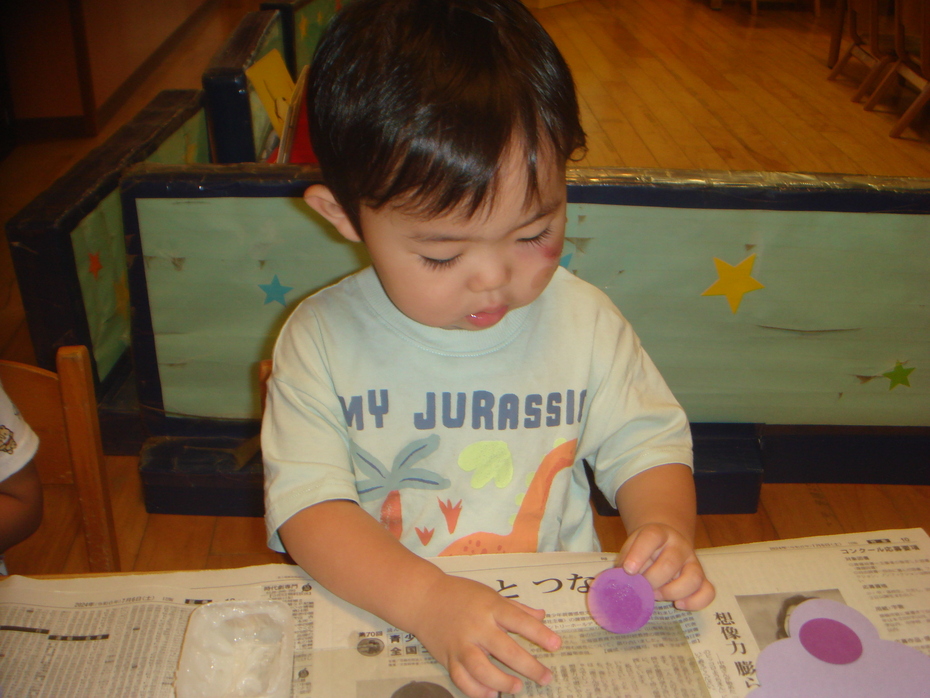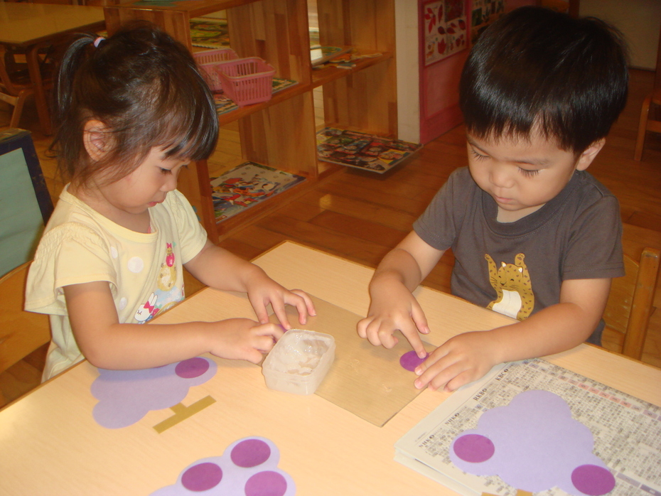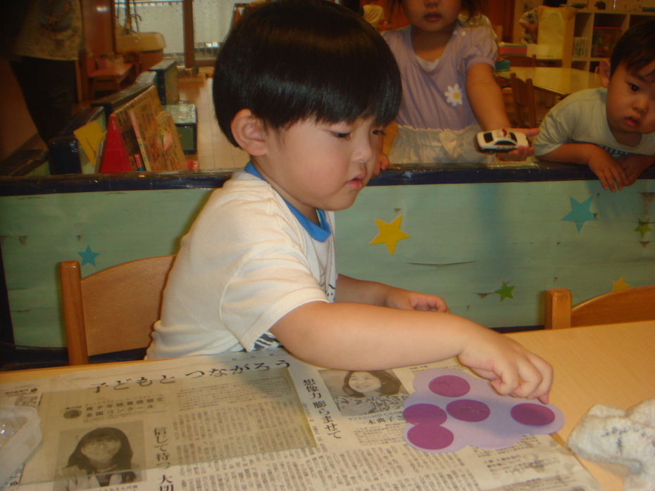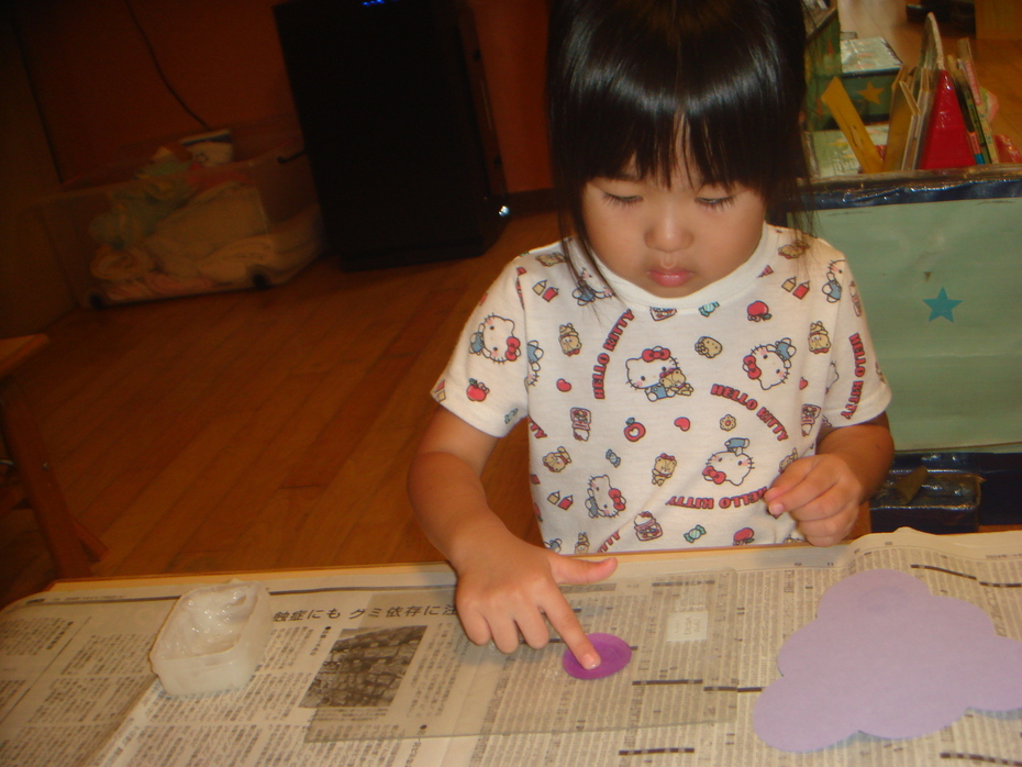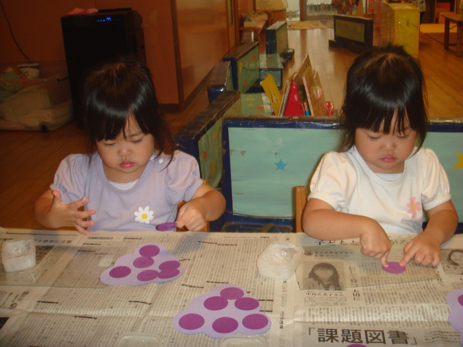 はじめてののり、一本指でぬりぬり。ぶどうのつぶを貼りました。 | ||
