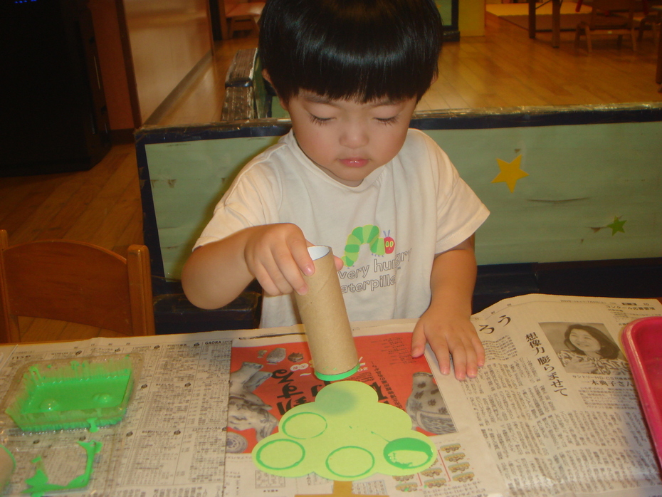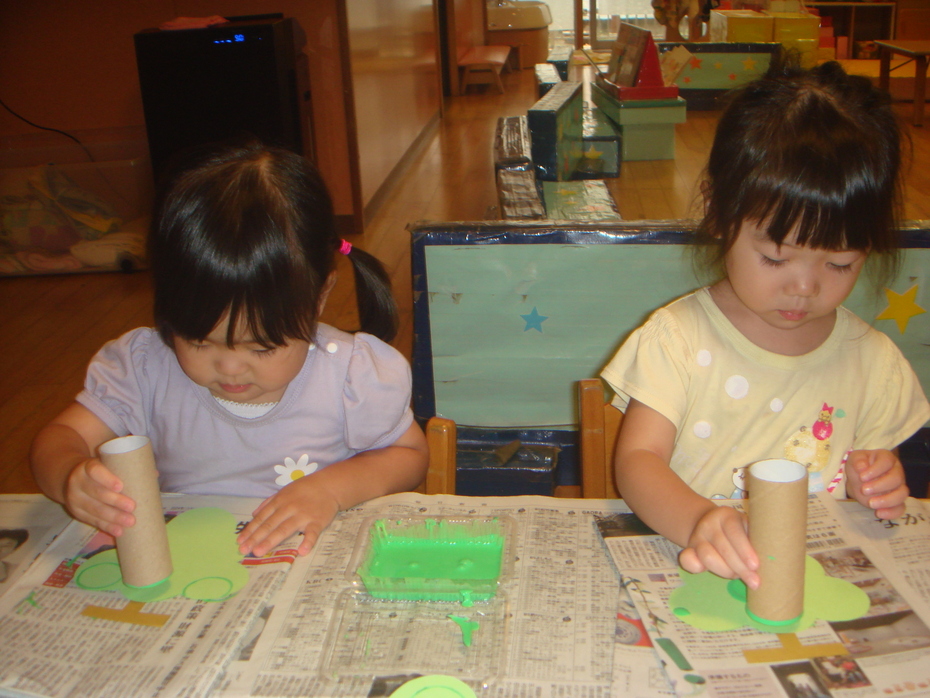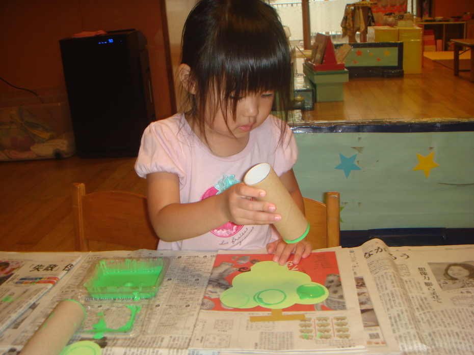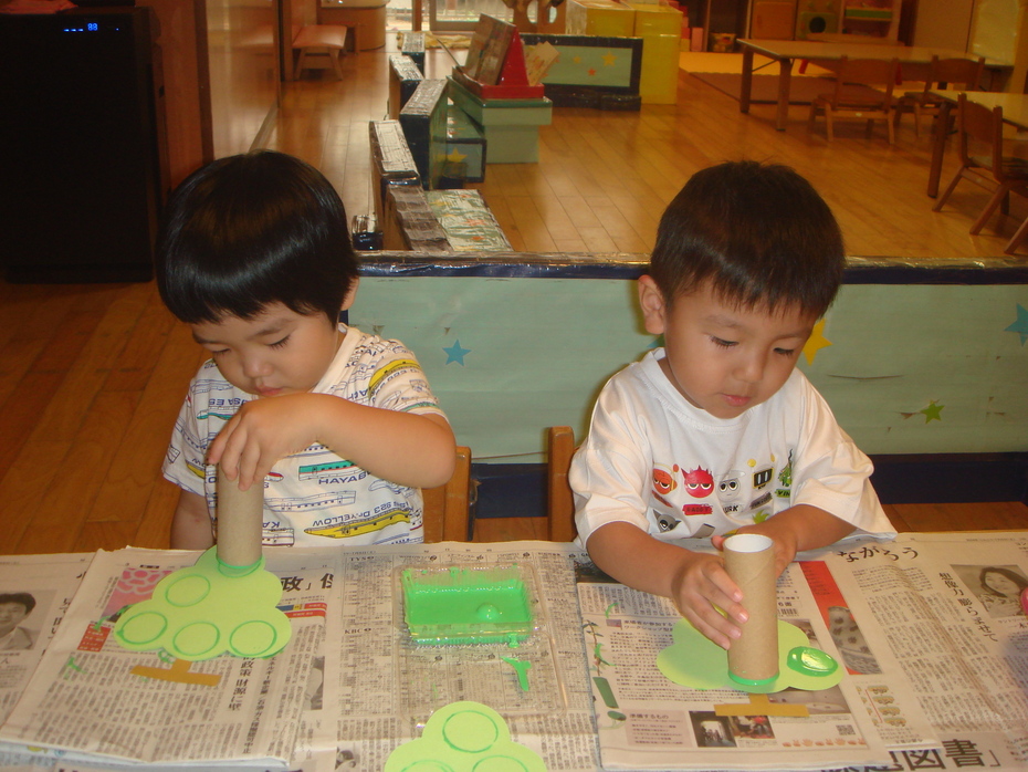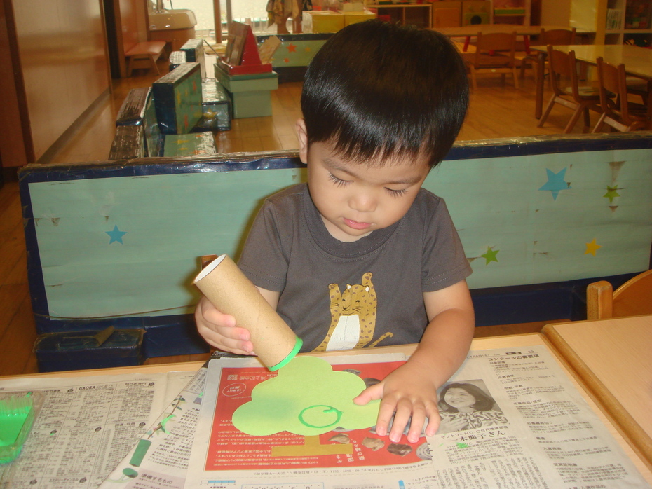 トイレットペーパーの芯を使って、マスカットのつぶをスタンプで作りました。 | ||