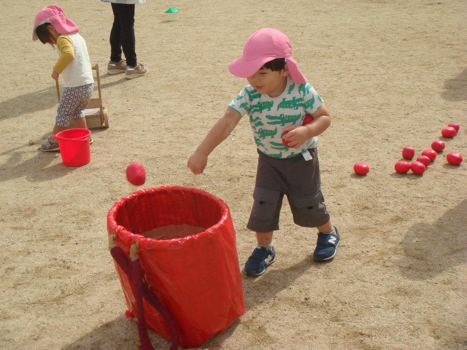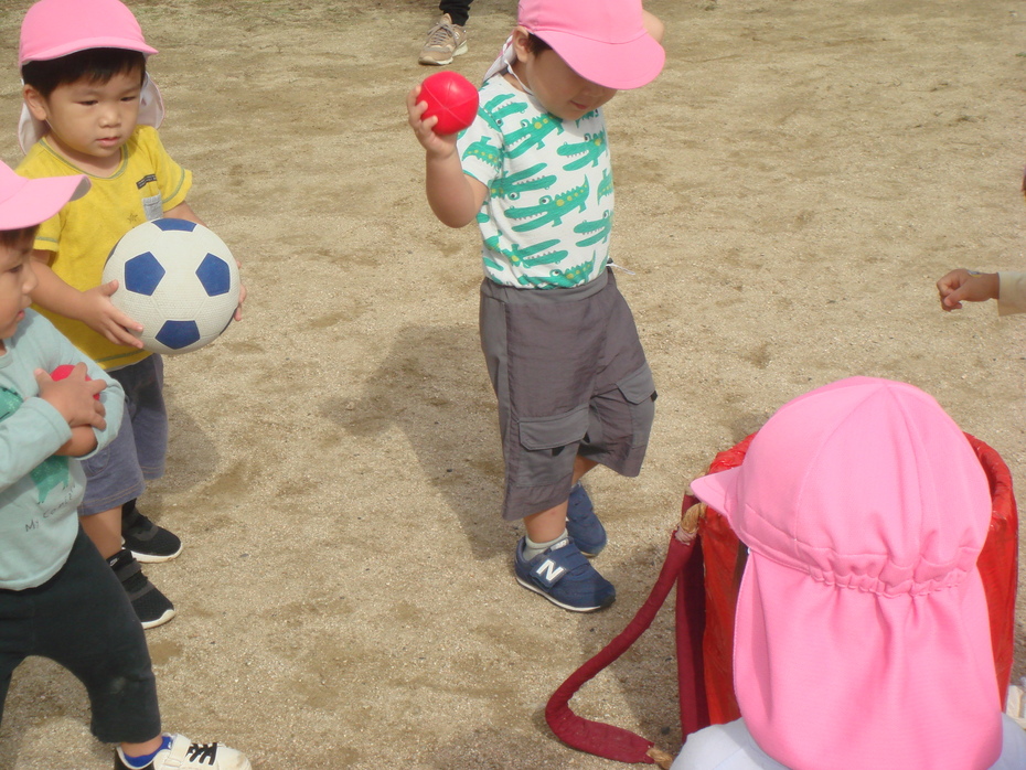 お兄さんたちの真似をして、玉入れに挑戦! | ||