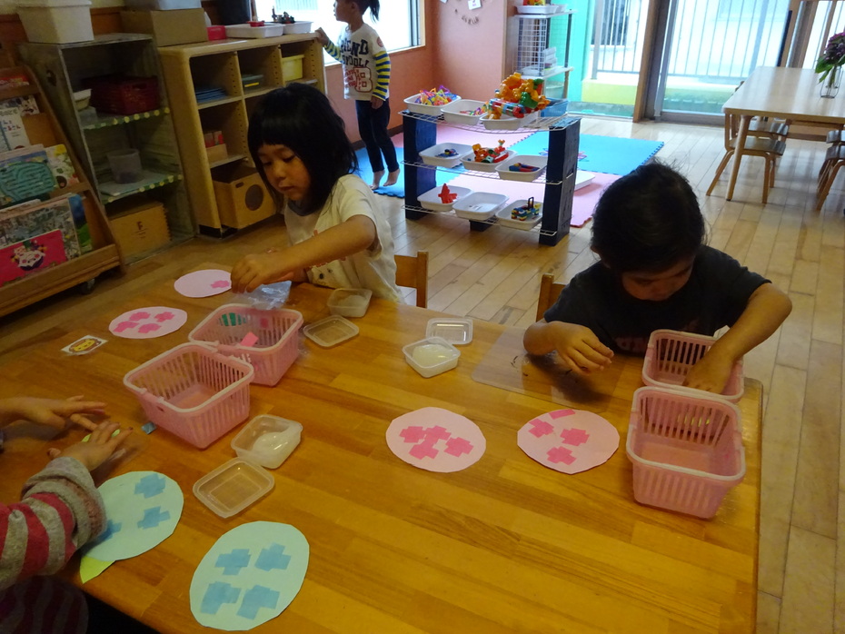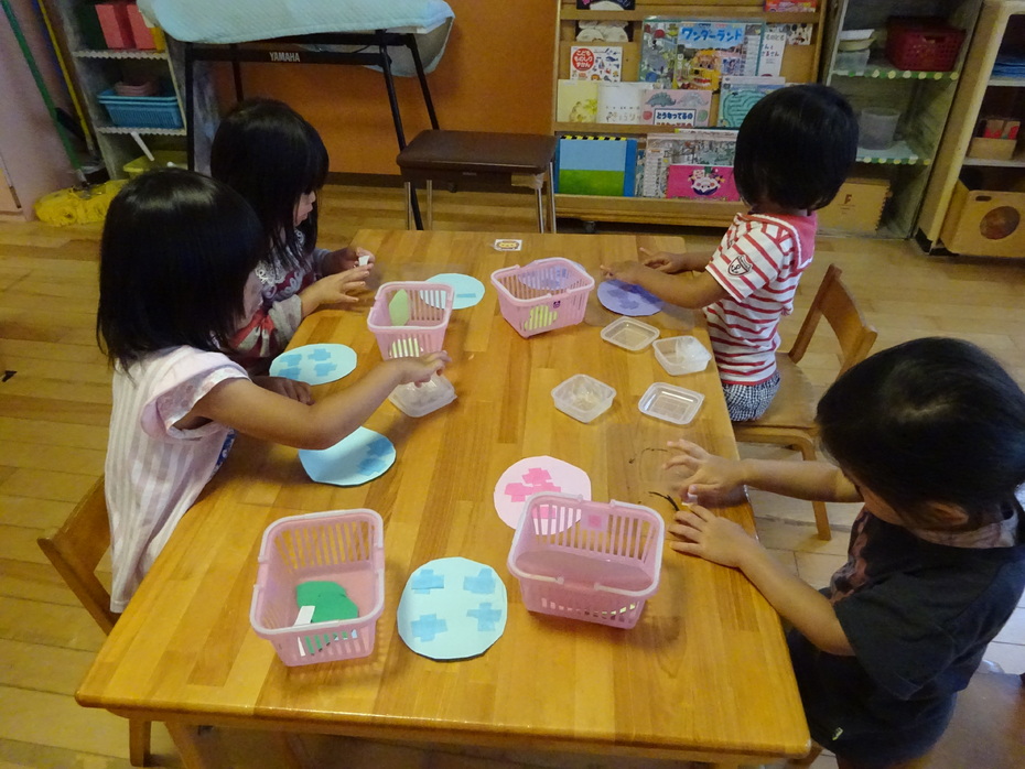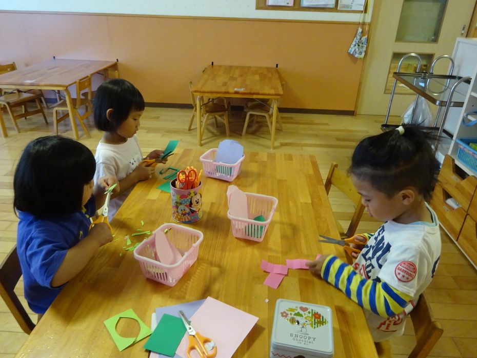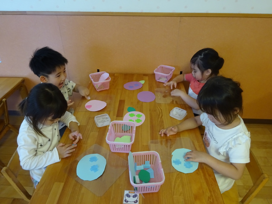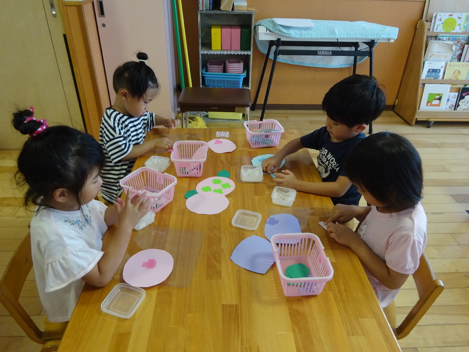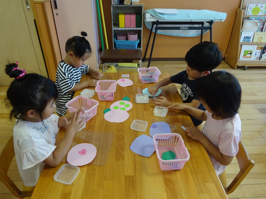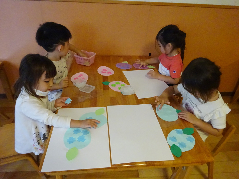 先週あじさいを作りました。色紙や画用紙を切りそれぞれのパーツをのりで貼り合わせて作り上げていきました。ハサミ使いは上手になりましたが、のりを塗る際どうしてもつけすぎる子どもがいて・・・