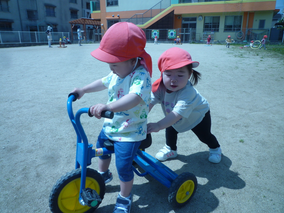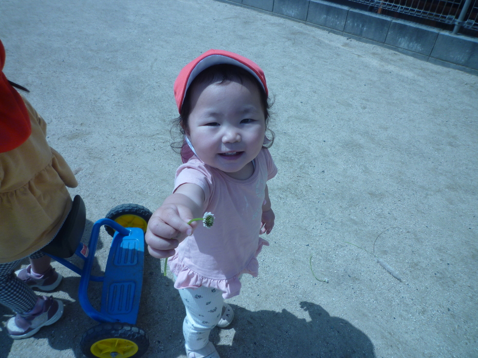 | お天気の良い日はお外で遊ぶことが大好きな子ども達です。草花に触れたり乗り物に乗ったり…好きな遊びを楽しんでいますよ! | ||