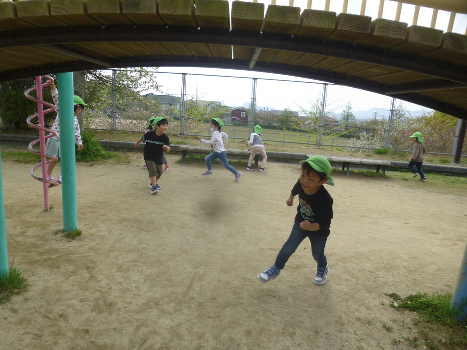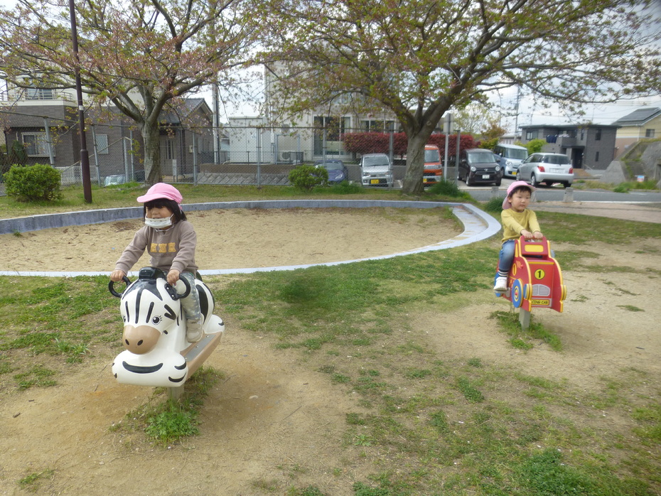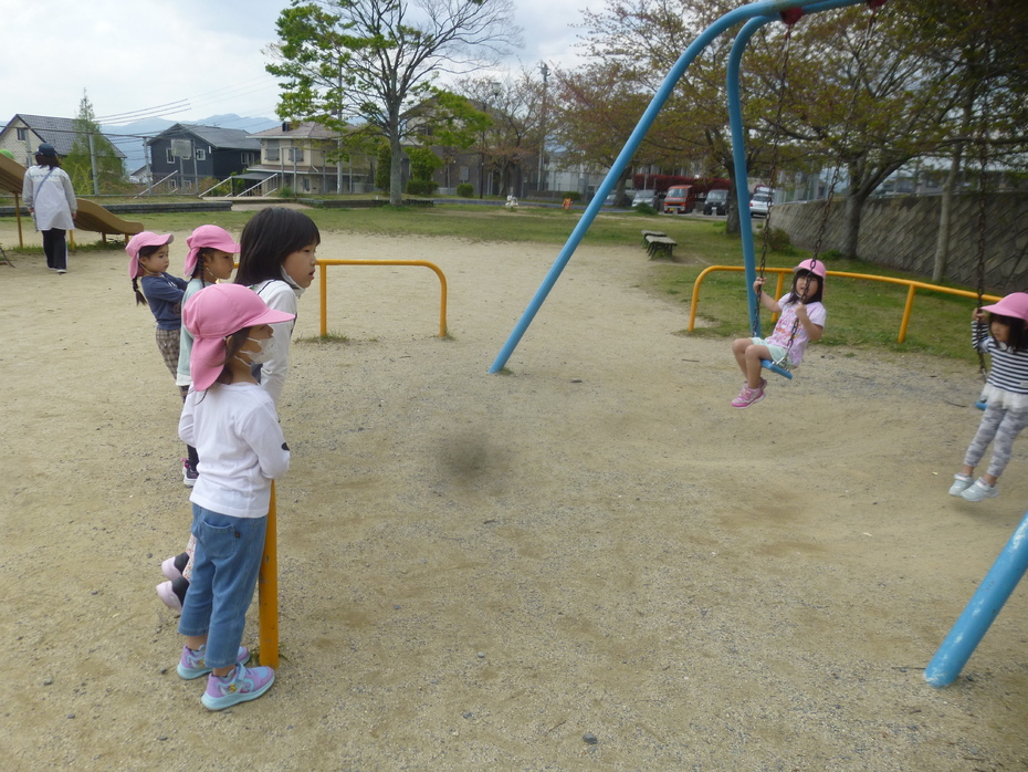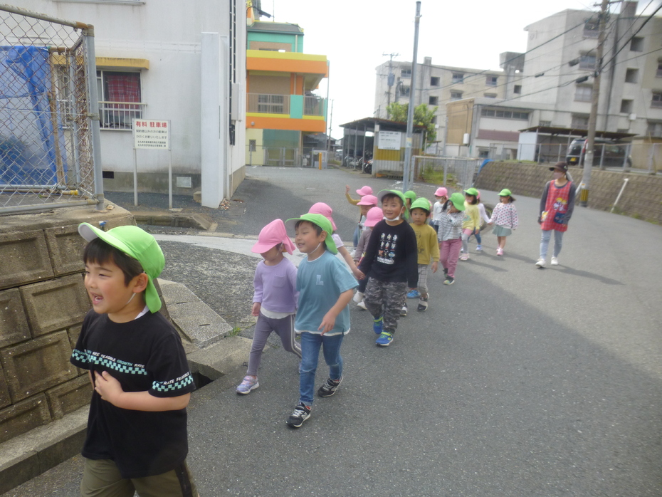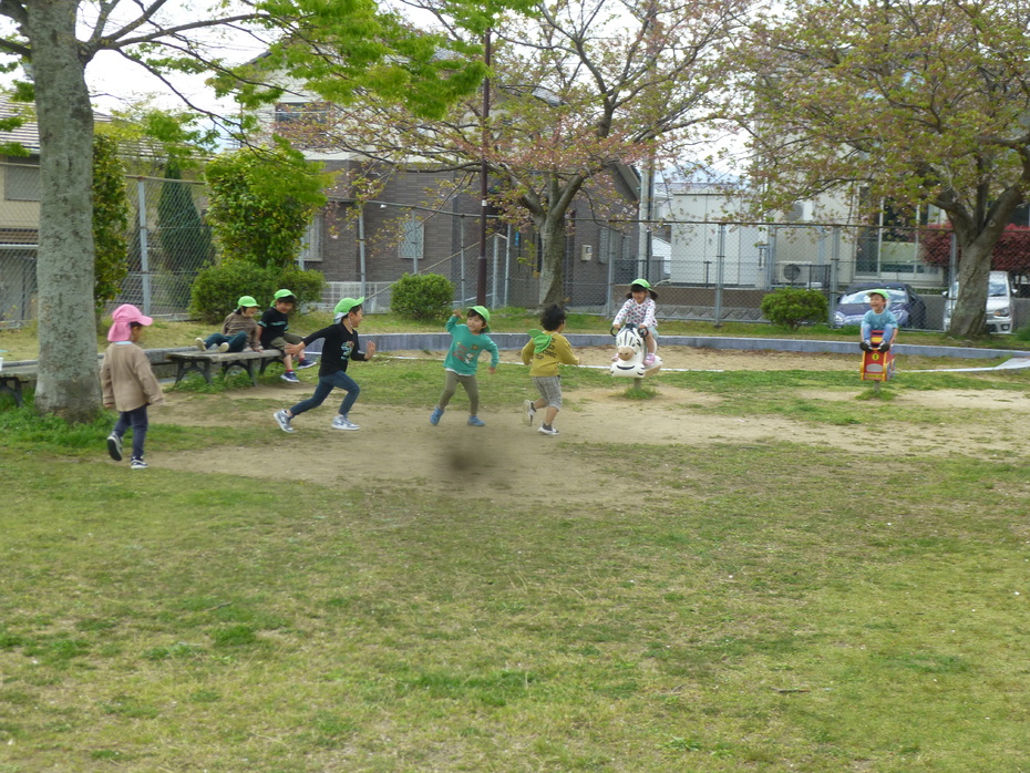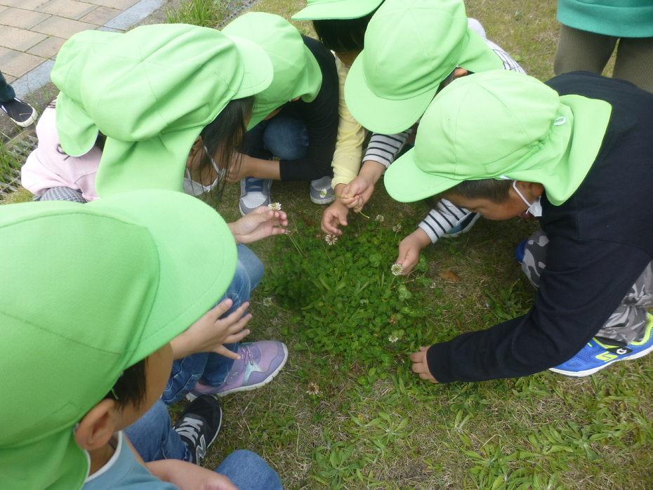 進級して初めてのお散歩です。桜はほとんど散っていましたが、シロツメクサやタンポポなど可愛いお花がたくさんありました。 公園ではたくさん体を動かして遊びましたよ。