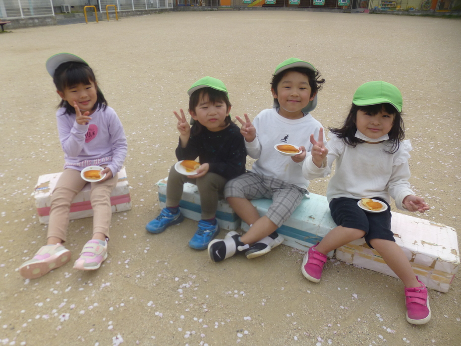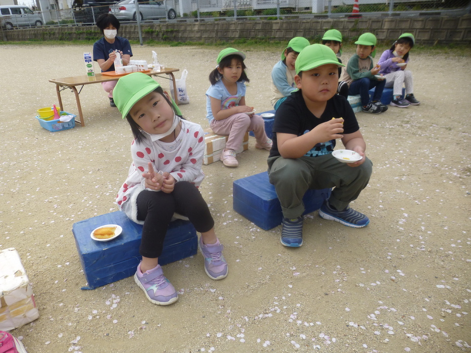 調理の先生にお願いして午睡後、おやつもお外で食べました。