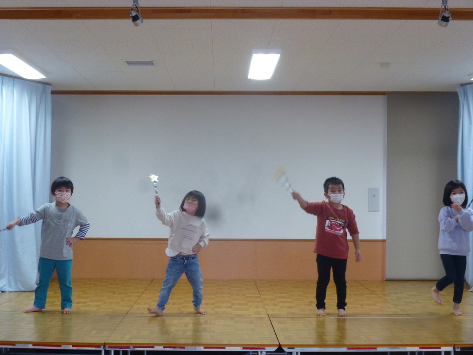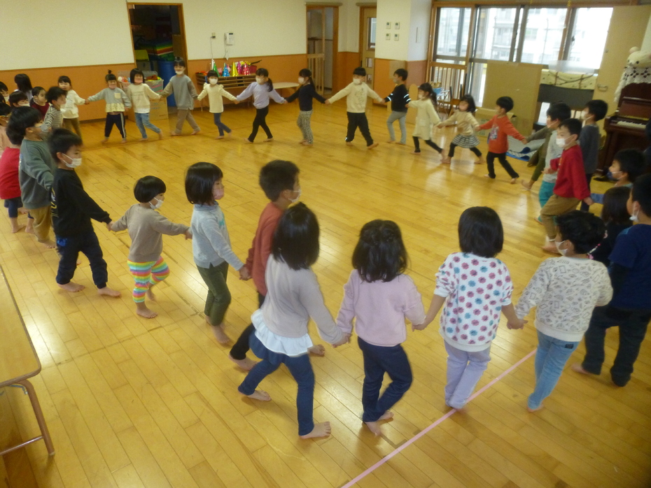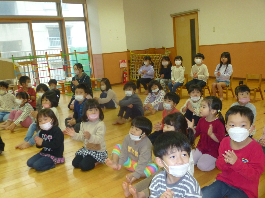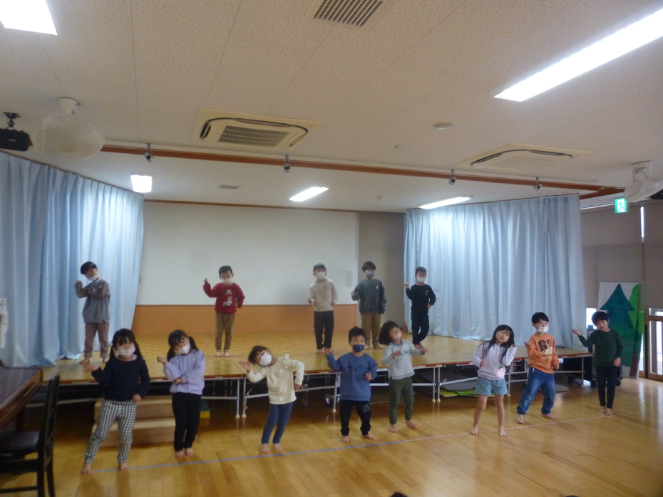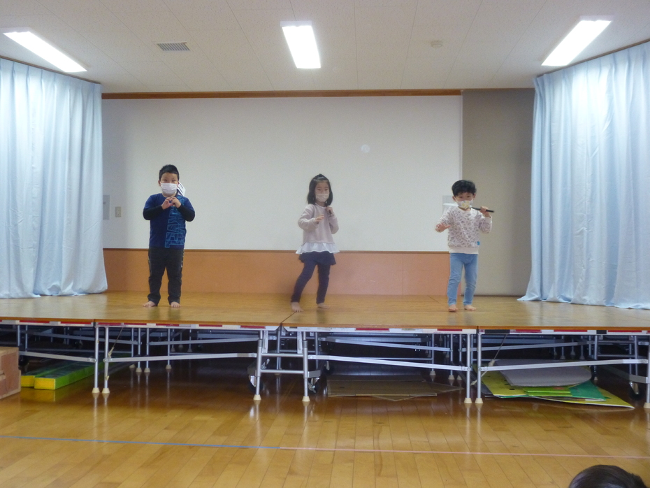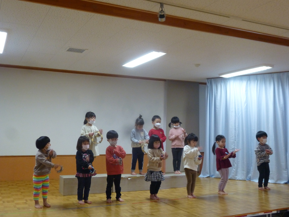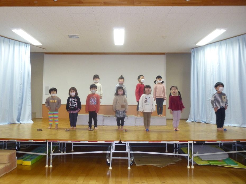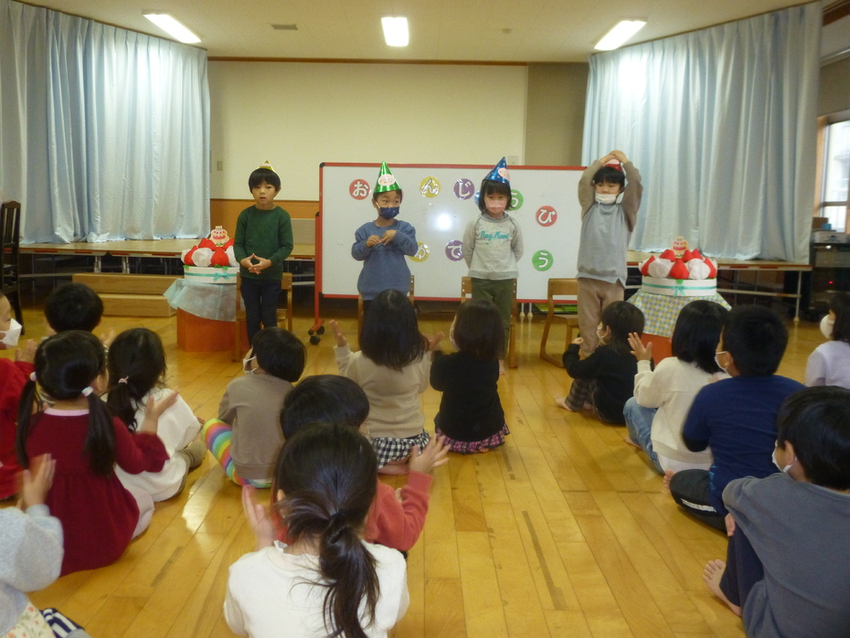 1月の誕生会の様子を紹介します。誕生者のお祝いをした後、生活発表会が間近に迫っていることもあり、各クラスの演目を見せ合いました。