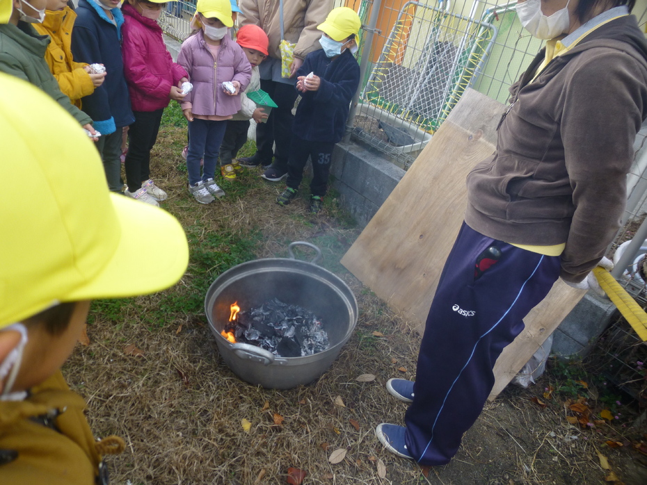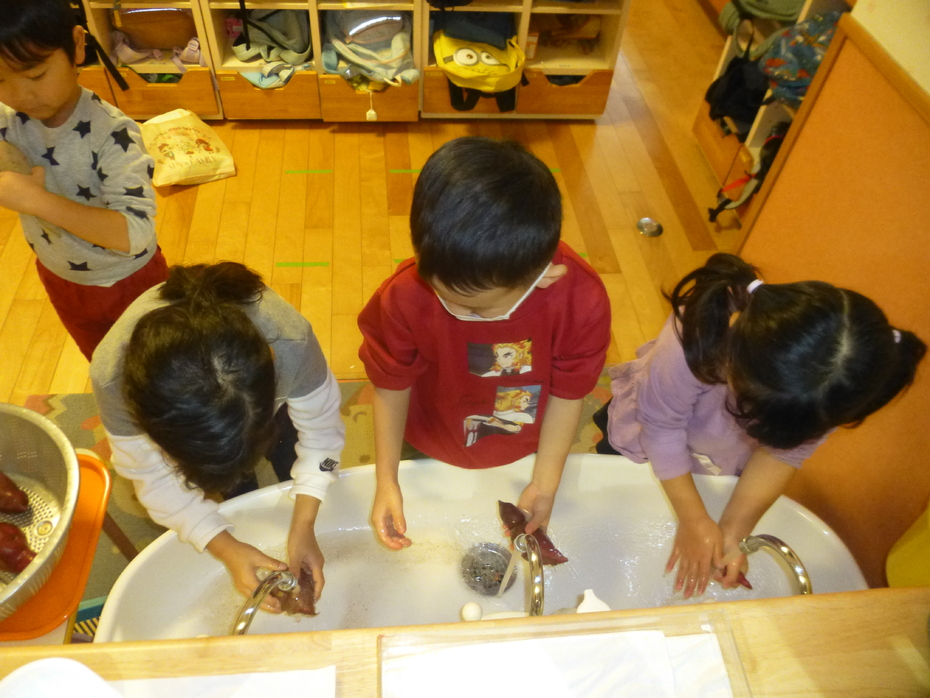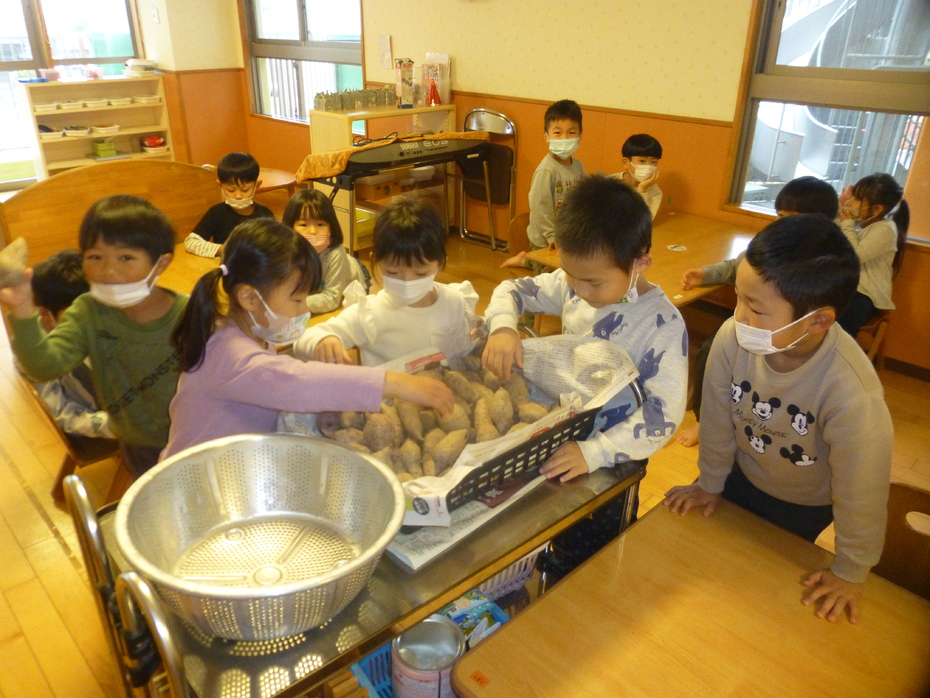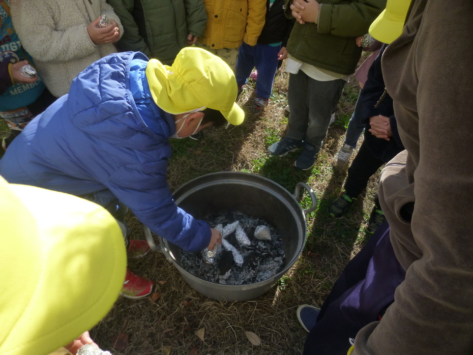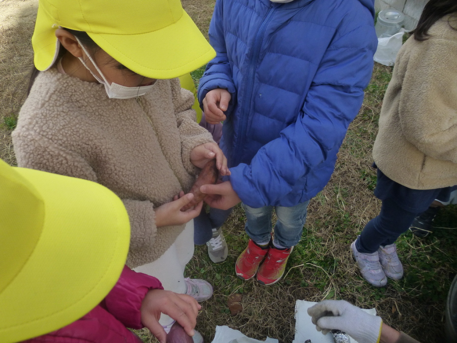 子ども達と焼きいも作りをしました。「おいしくな~れ」と呪文のように言っては出来上がるのをすごく楽しみにしていました。