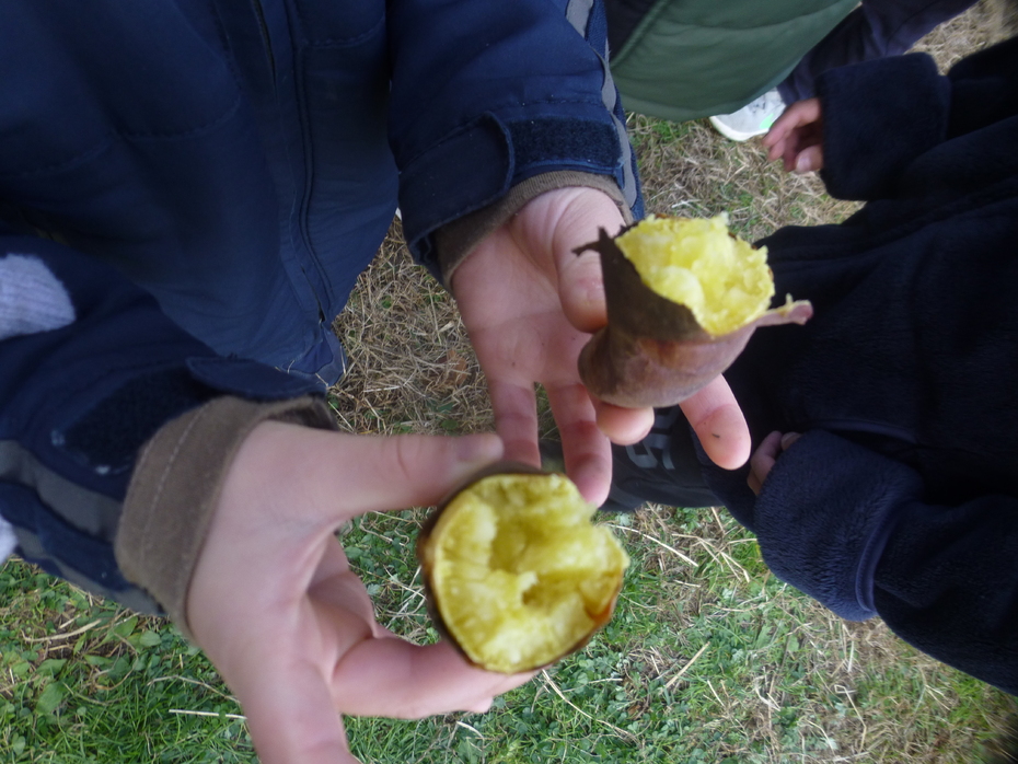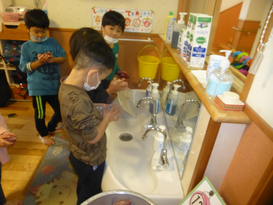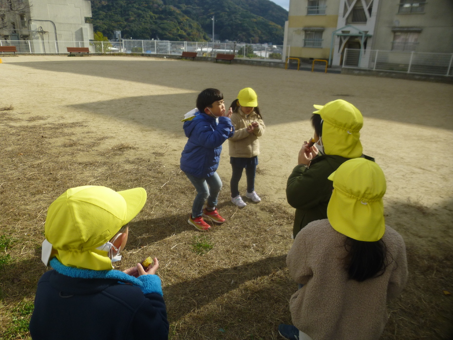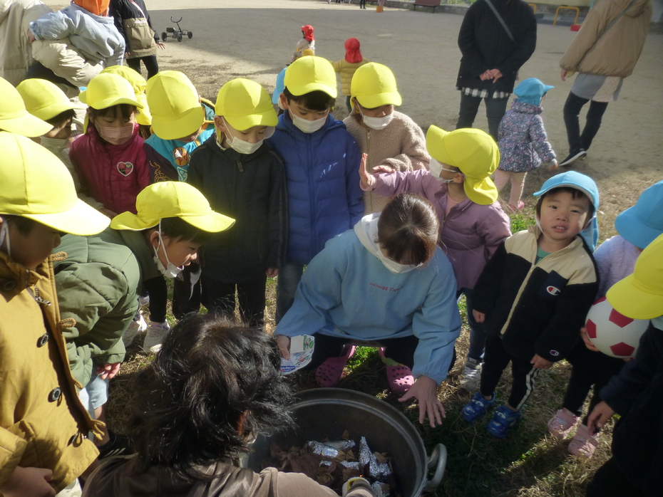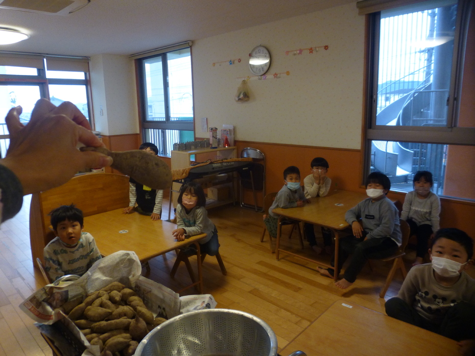 子ども達と焼きいも作りをしました。「おいしくな~れ」と呪文のように言っては出来上がるのをすごく楽しみにしていました。