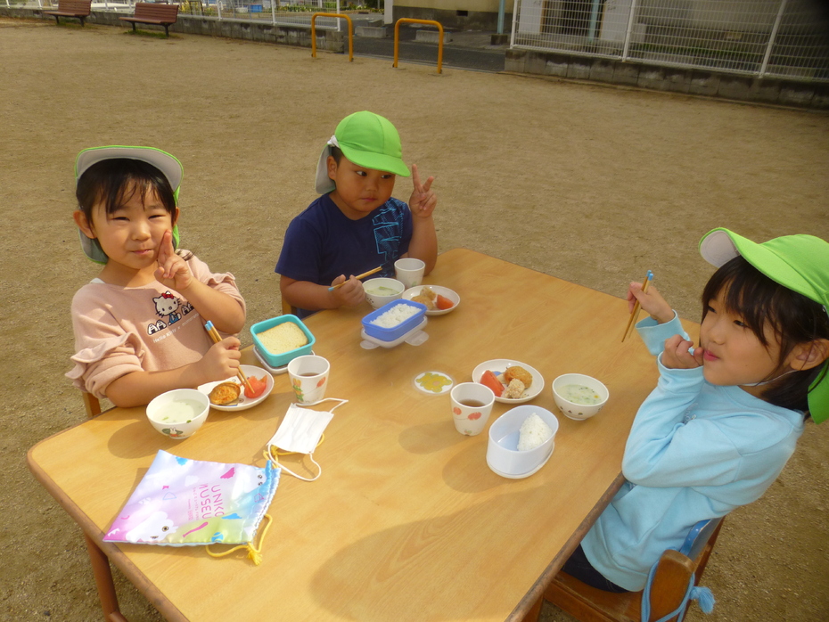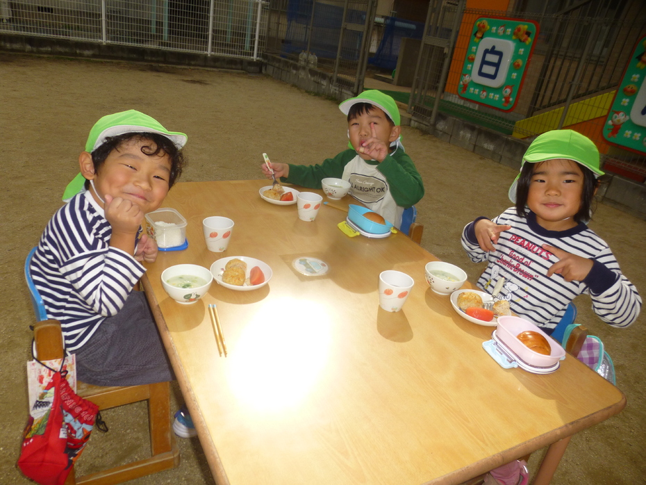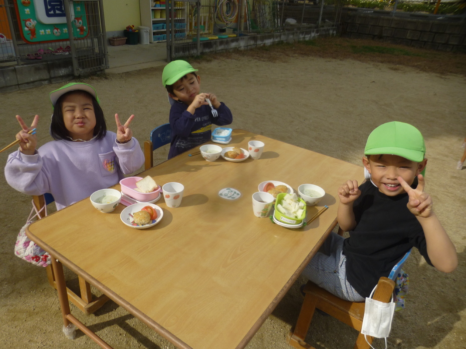 天候も良く、今日は戸外でランチをしました!!以前、天候が悪くできなかったので、子ども達は大喜びでした!お友達と一緒に食事を楽しみましたよ。とっても美味しかったようで、おかわりの催促をする子が多かったです。