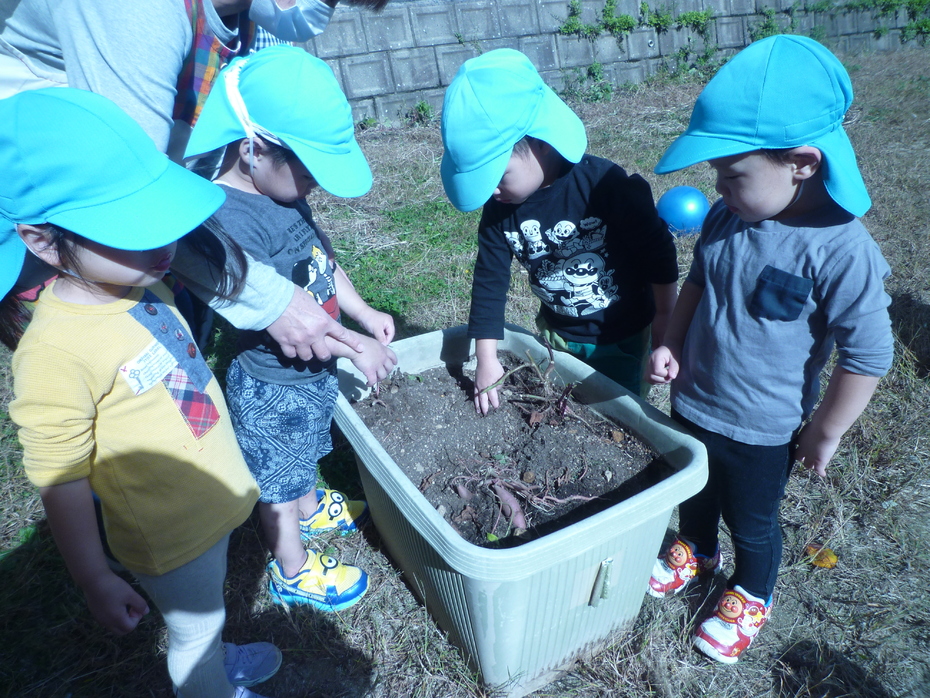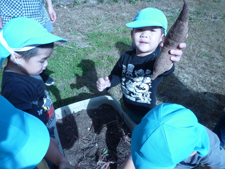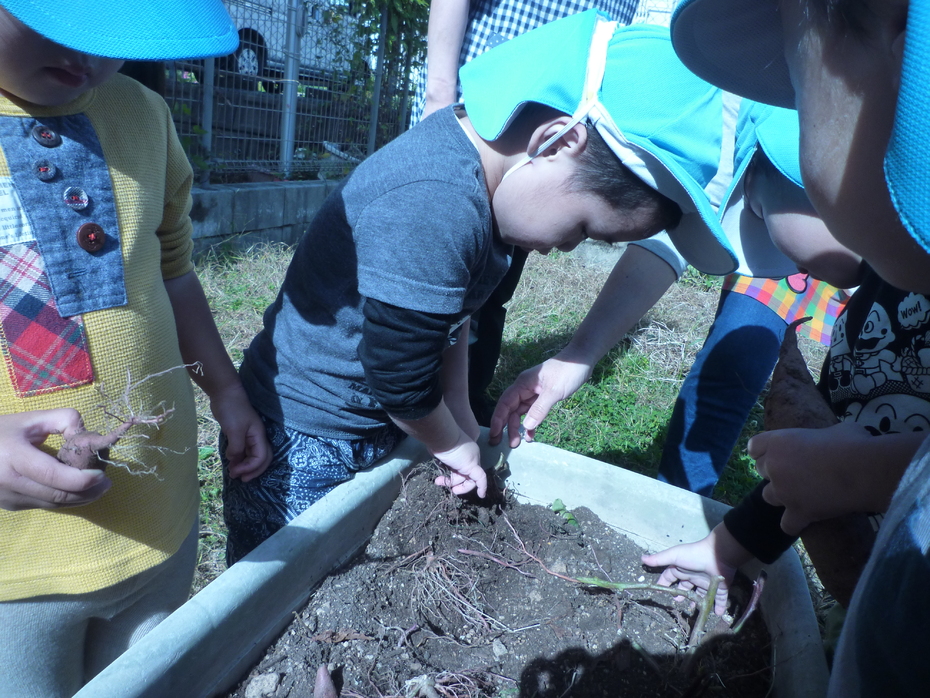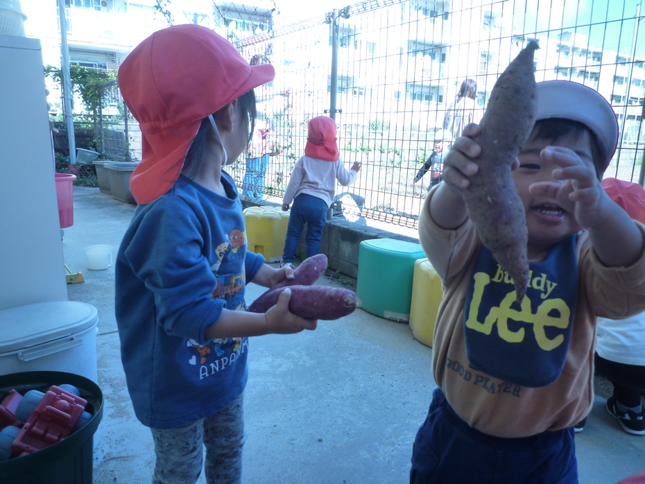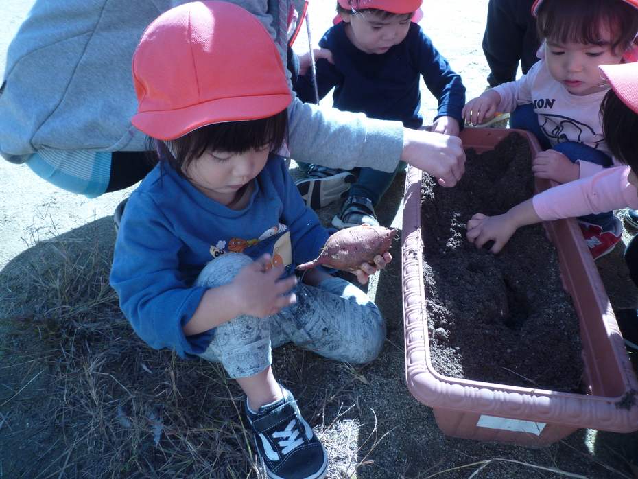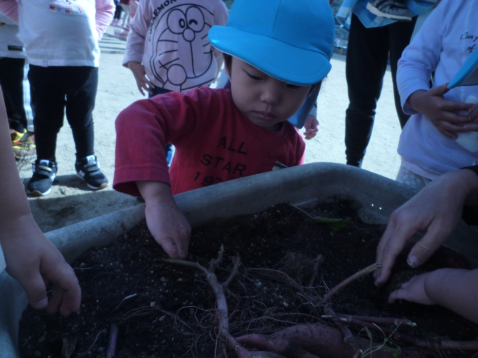 | プランターに植えたさつまいもを収穫しました!始めはそ~っと土の中に手を入れていましたが、さつまいもに気付くといもほり体験を楽しんだ子ども達です♪ | ||