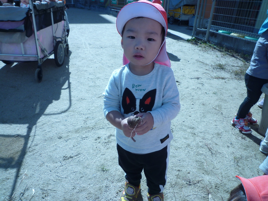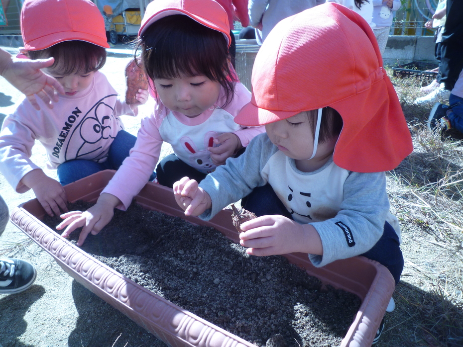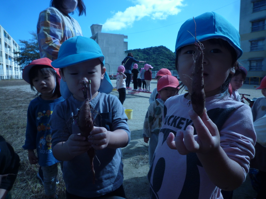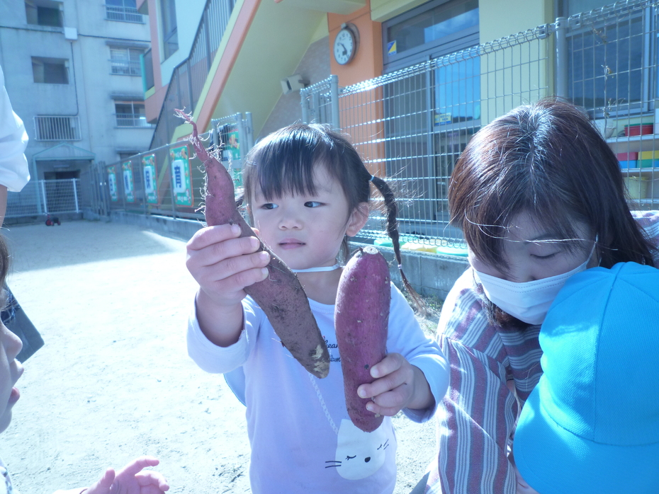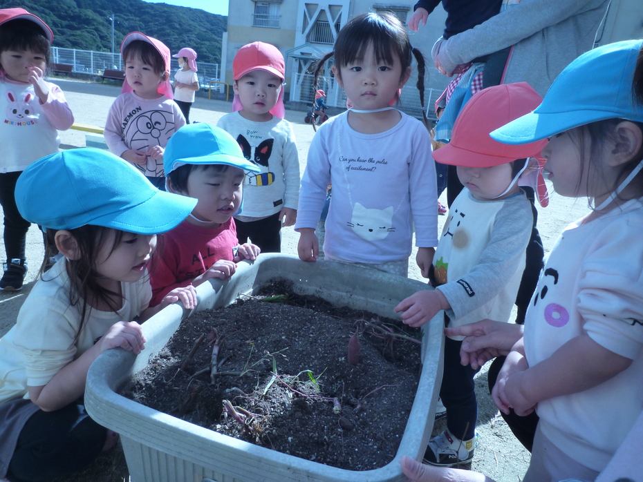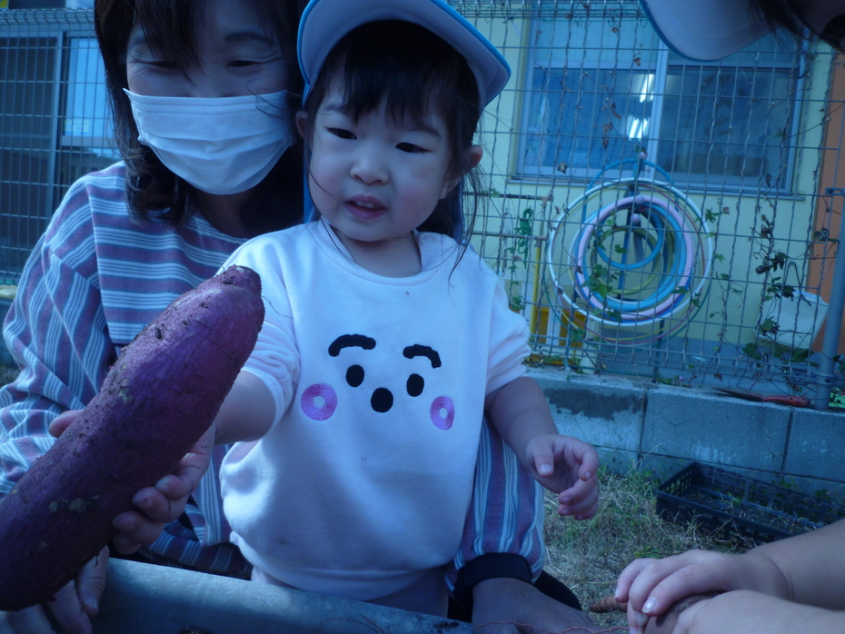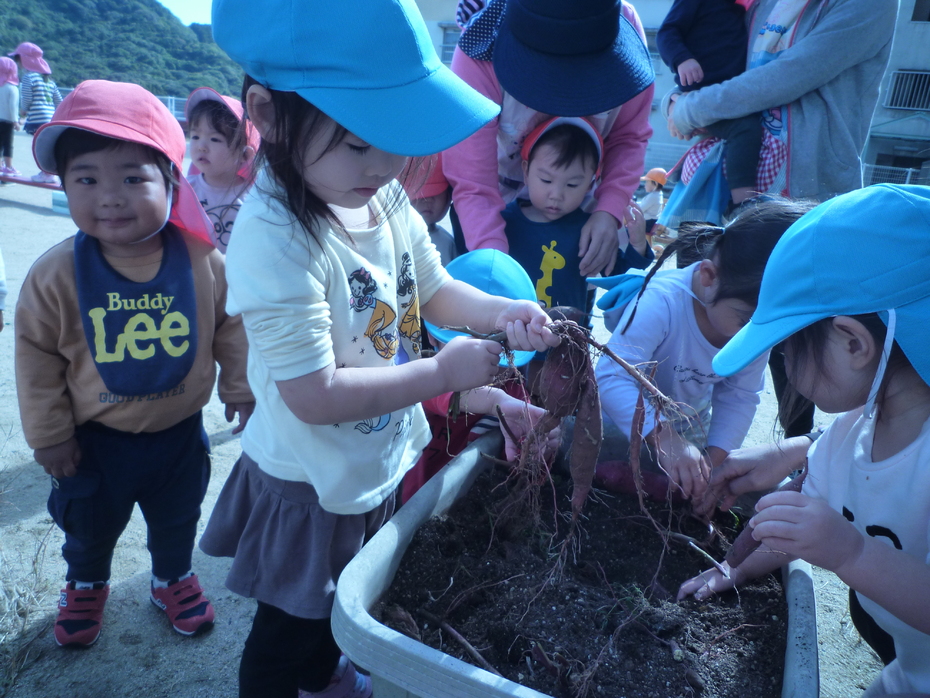 | プランターに植えたさつまいもを収穫しました!始めはそ~っと土の中に手を入れていましたが、さつまいもに気付くといもほり体験を楽しんだ子ども達です♪ | ||