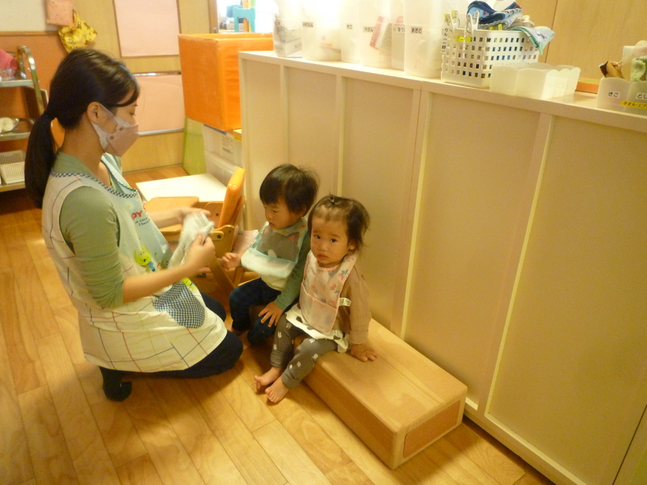 エプロンをつけ、手を拭いてもらっています。 | ||