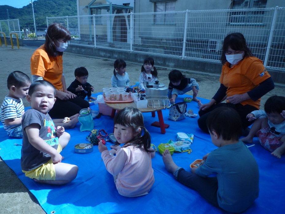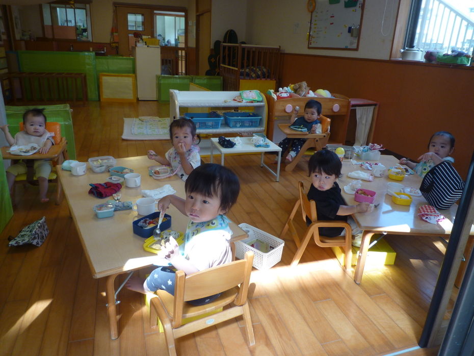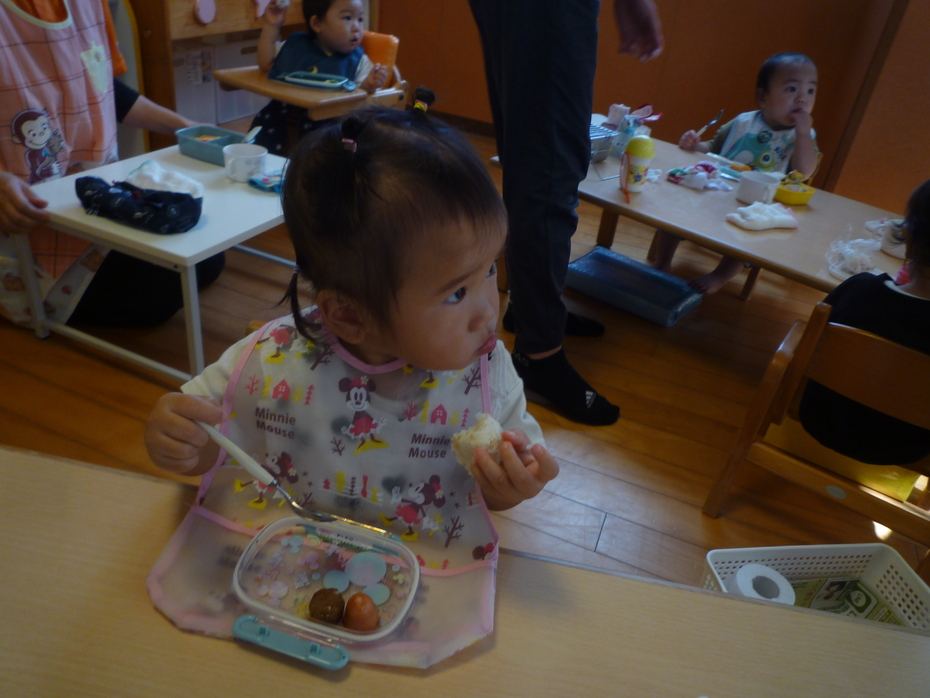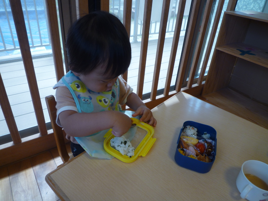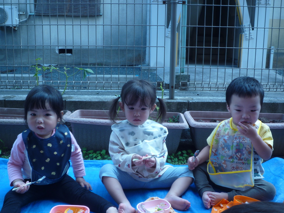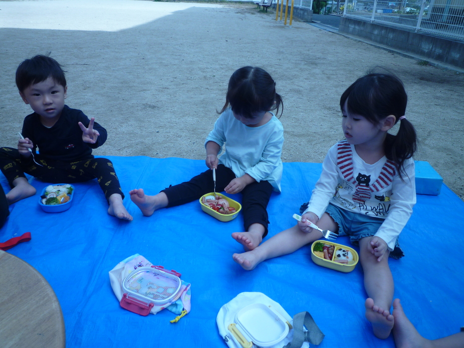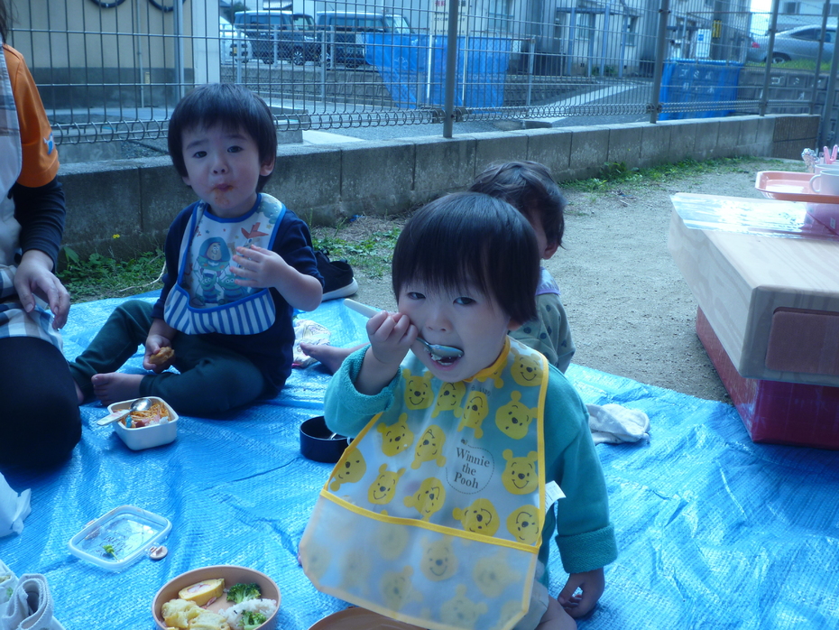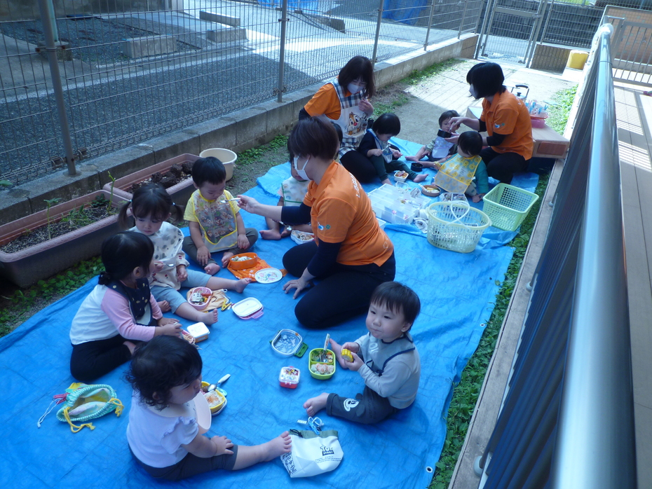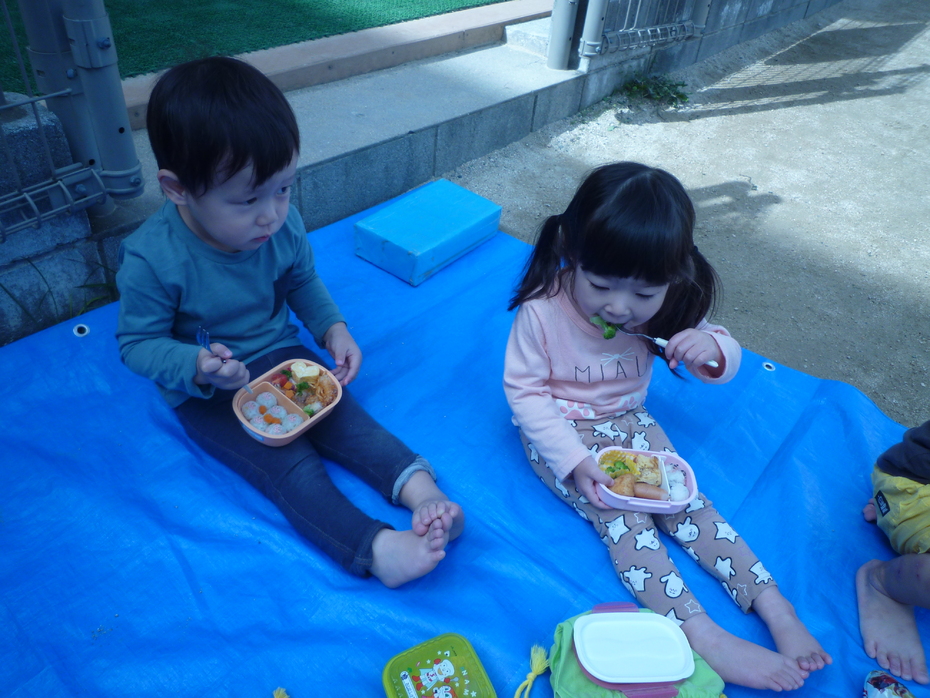 お楽しみのお弁当タイムです!ひよこぐみはお外を見ながら食べました! | ||