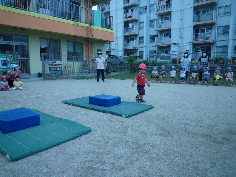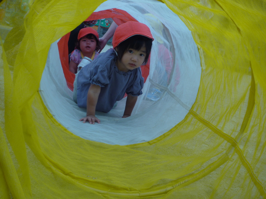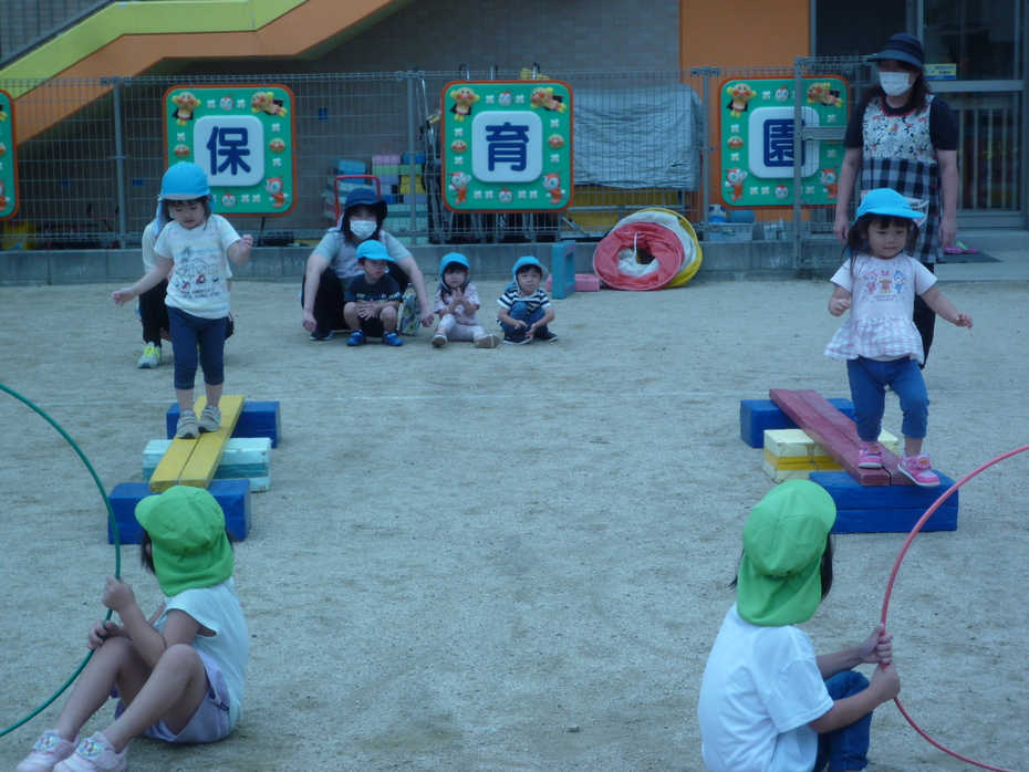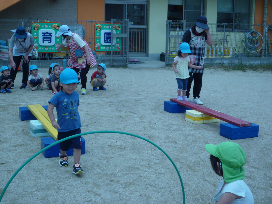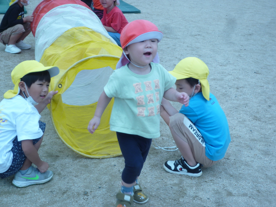 次はりすぐみです。台をよじ登りジャンプ、そしてトンネルくぐりです。泣かずにみんなできました。 | ||