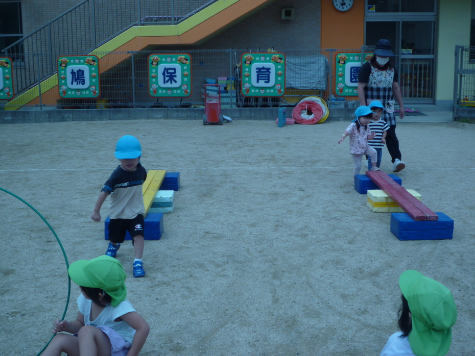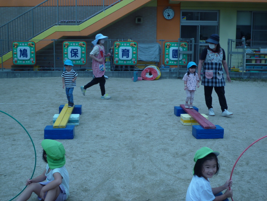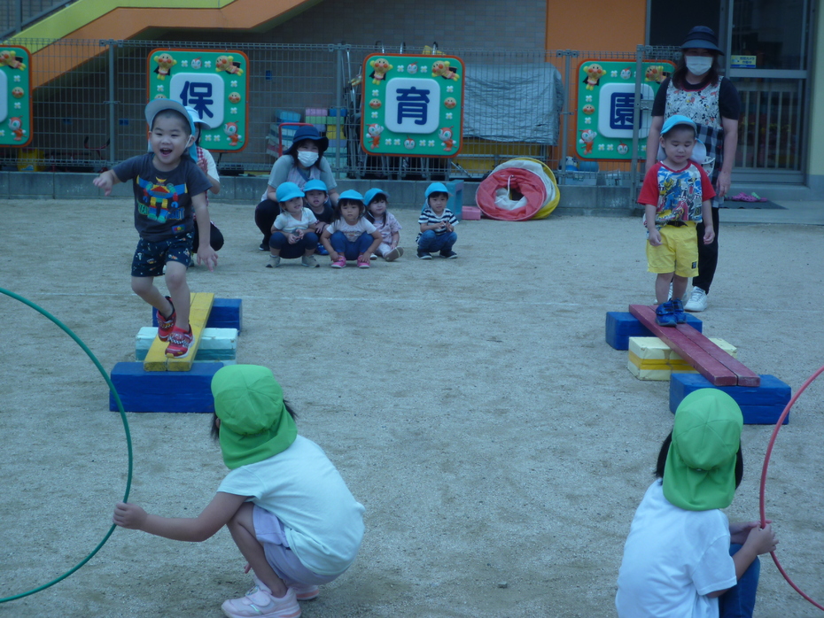 最後はうさぎぐみです。平均台を渡って、フープをくぐりカラーボックスからジャンプです。 | ||