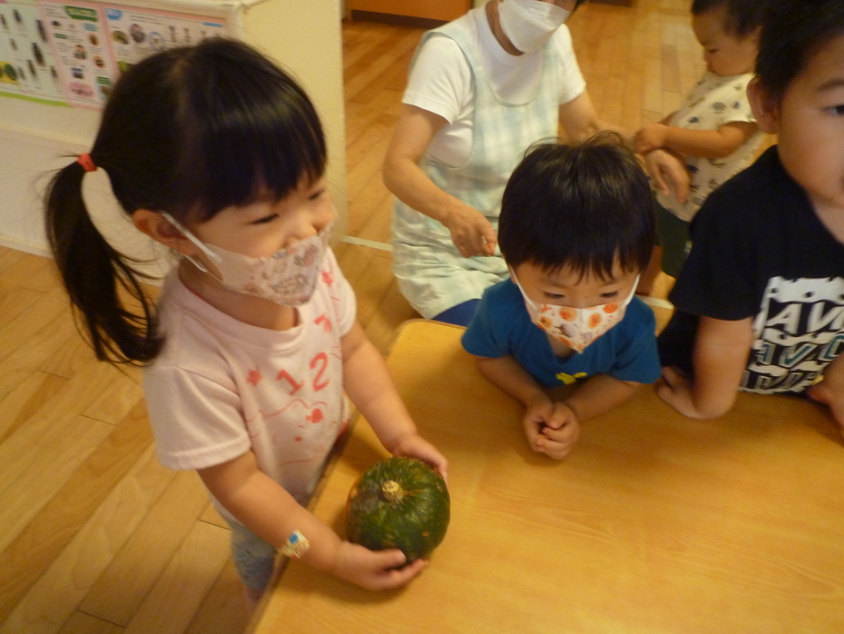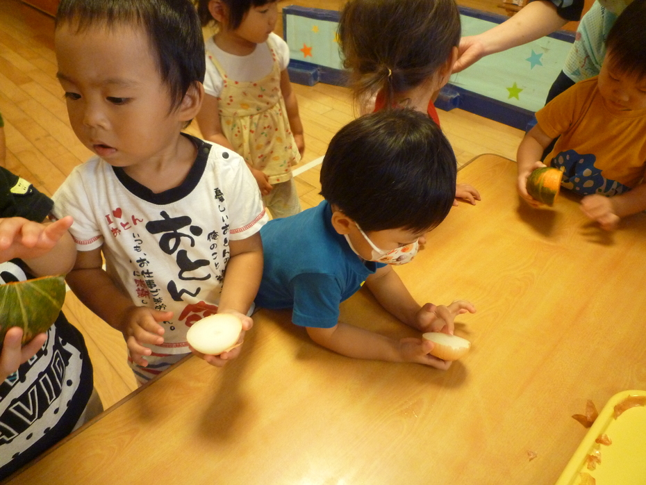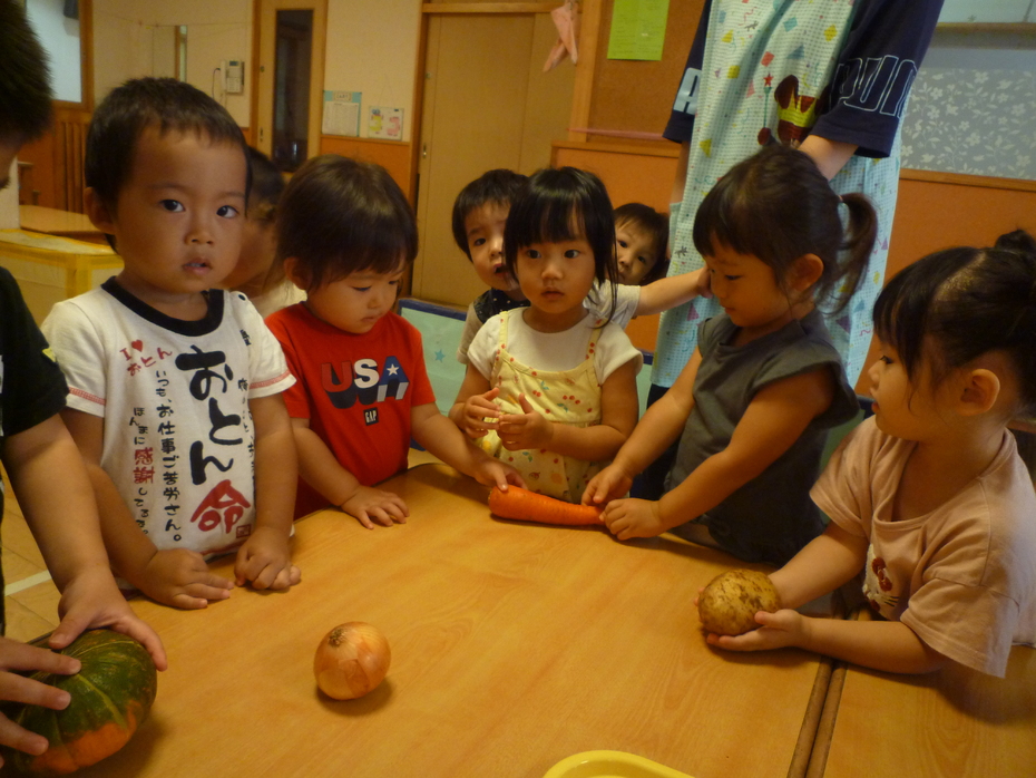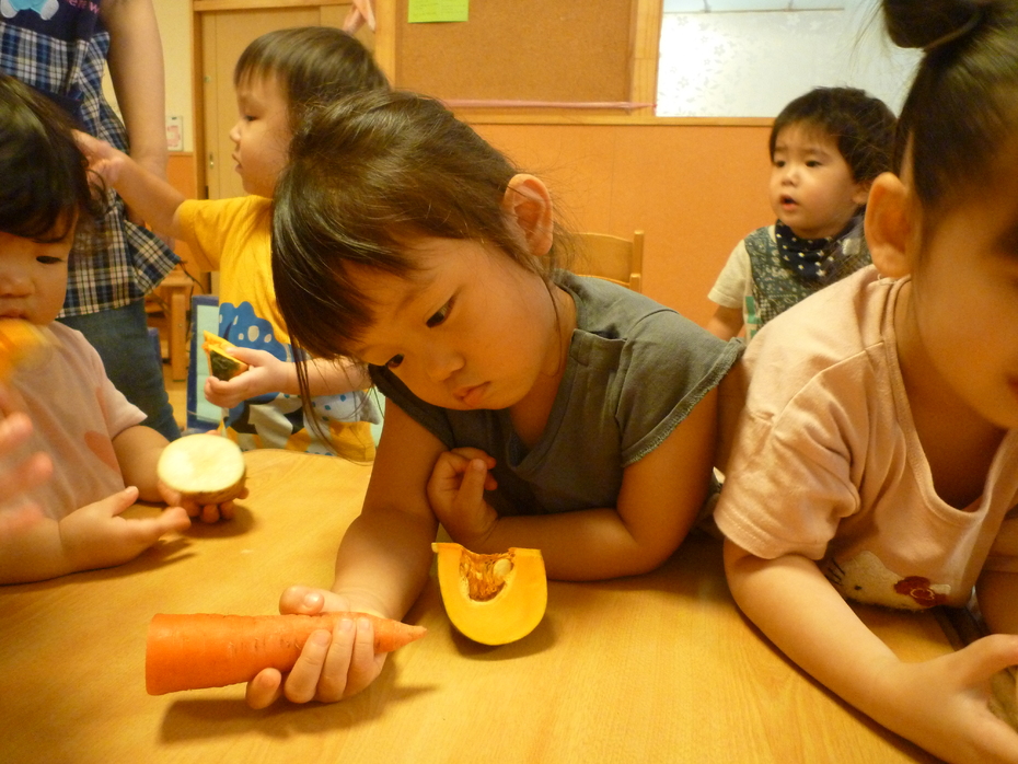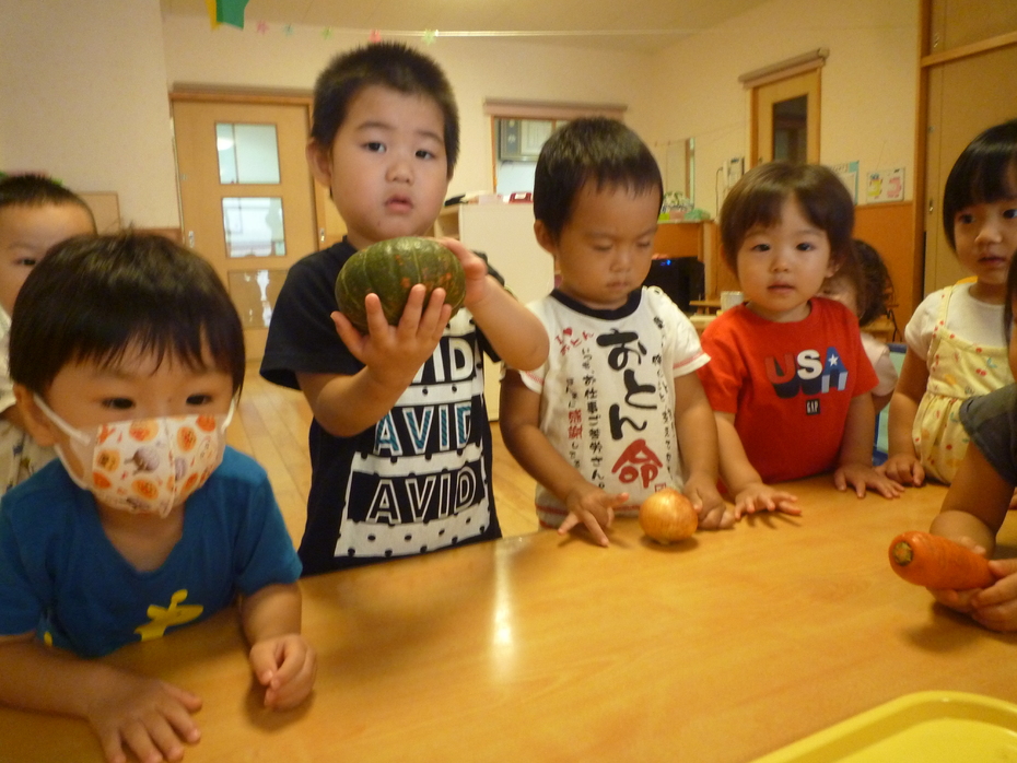 | 「やさいのおなか」という絵本が大好きな子ども達!実際に野菜のお腹を見たり、触れたり、食べたりして食育遊びを楽しみました。様々な野菜に触れて食事に興味や意欲を持ってほしいな~と思います! | ||