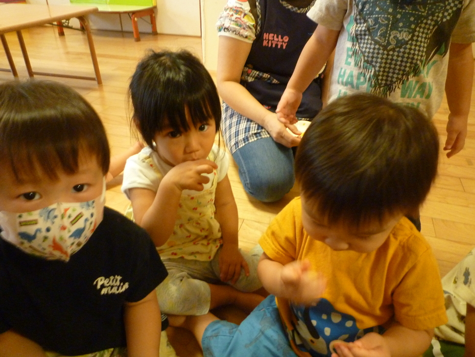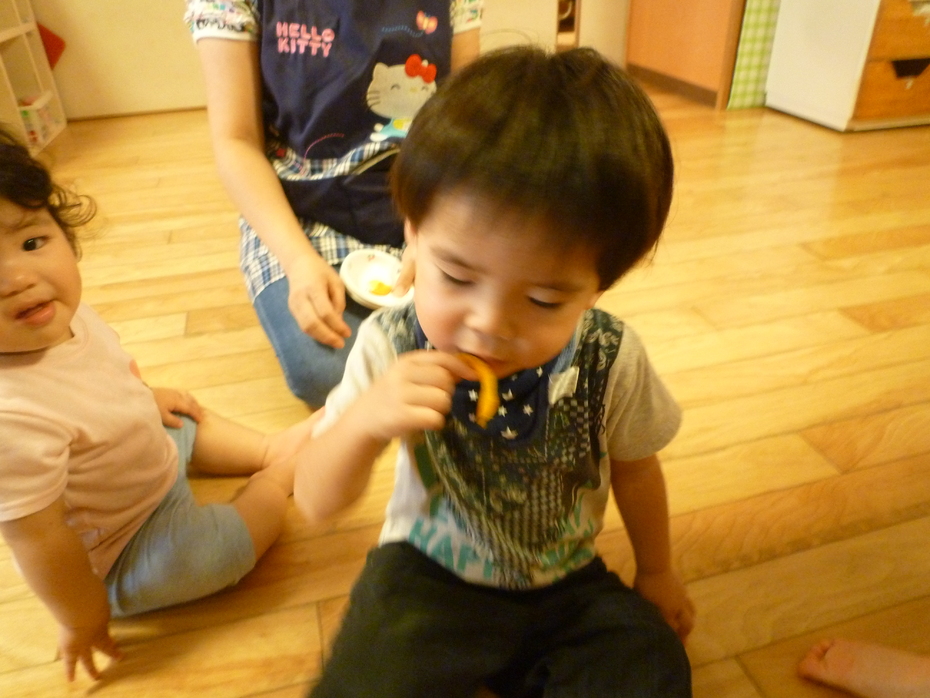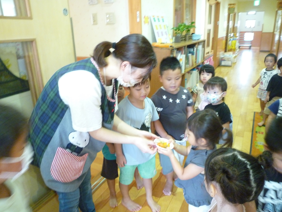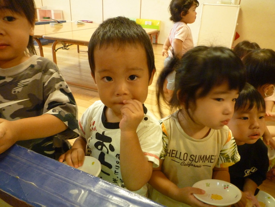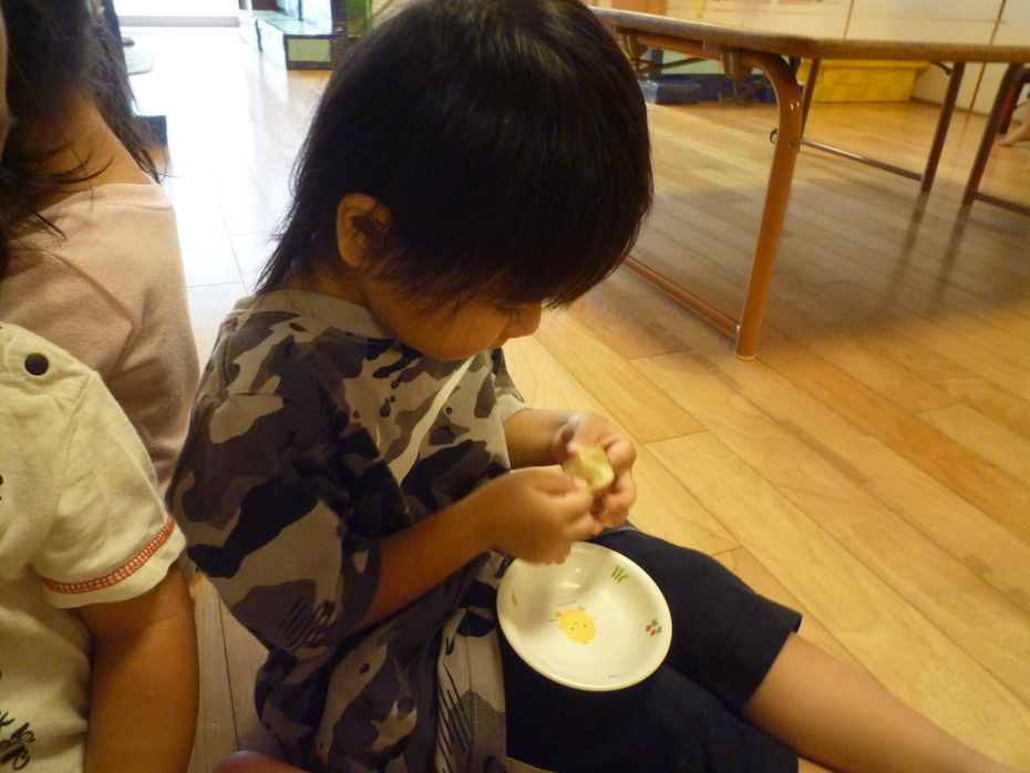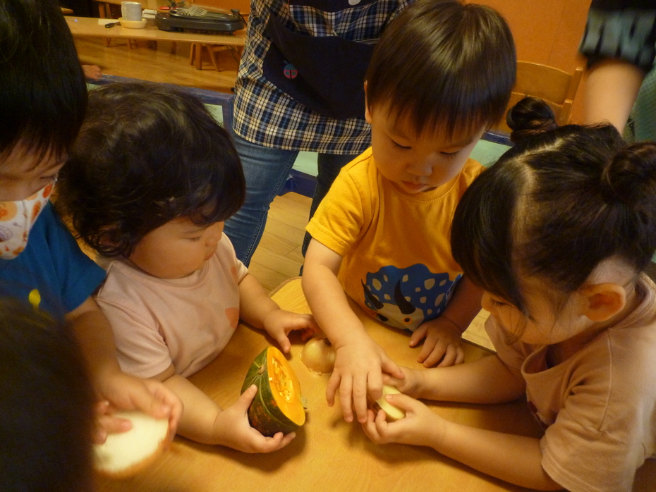 | 「やさいのおなか」という絵本が大好きな子ども達!実際に野菜のお腹を見たり、触れたり、食べたりして食育遊びを楽しみました。様々な野菜に触れて食事に興味や意欲を持ってほしいな~と思います! | ||