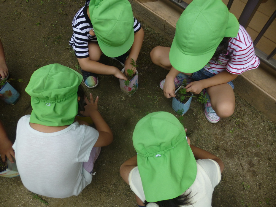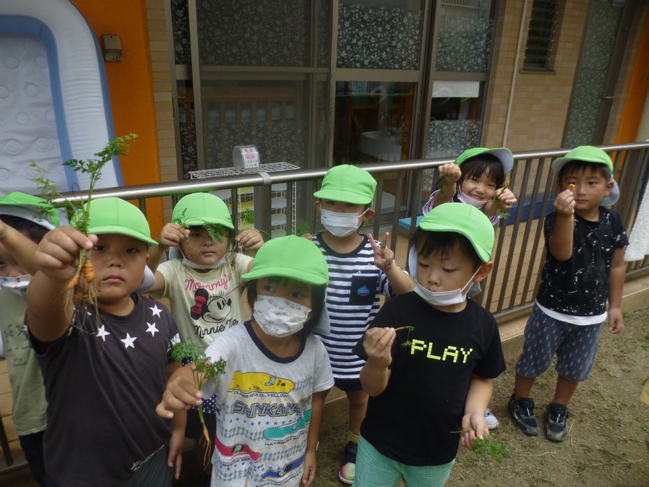 春先に植えた人参(ベビーキャロット)を収穫しました!小さな人参を優しくそ~っとぬきましたよ。とっても小さかったですが、子ども達は収穫した人参を嬉しそうに見せてくれました!お昼にみんなで食べました。「おいしい~!!」と満足そうでしたよ。