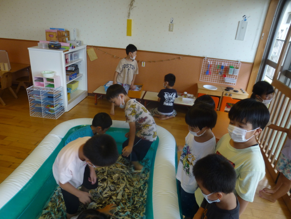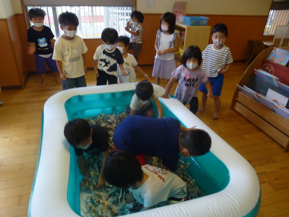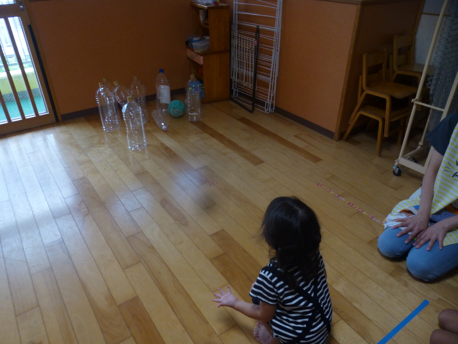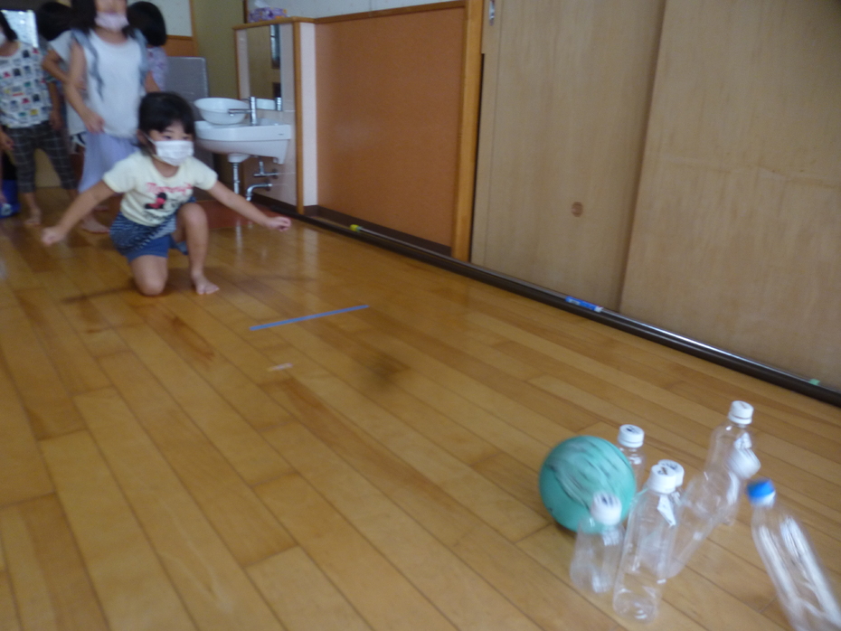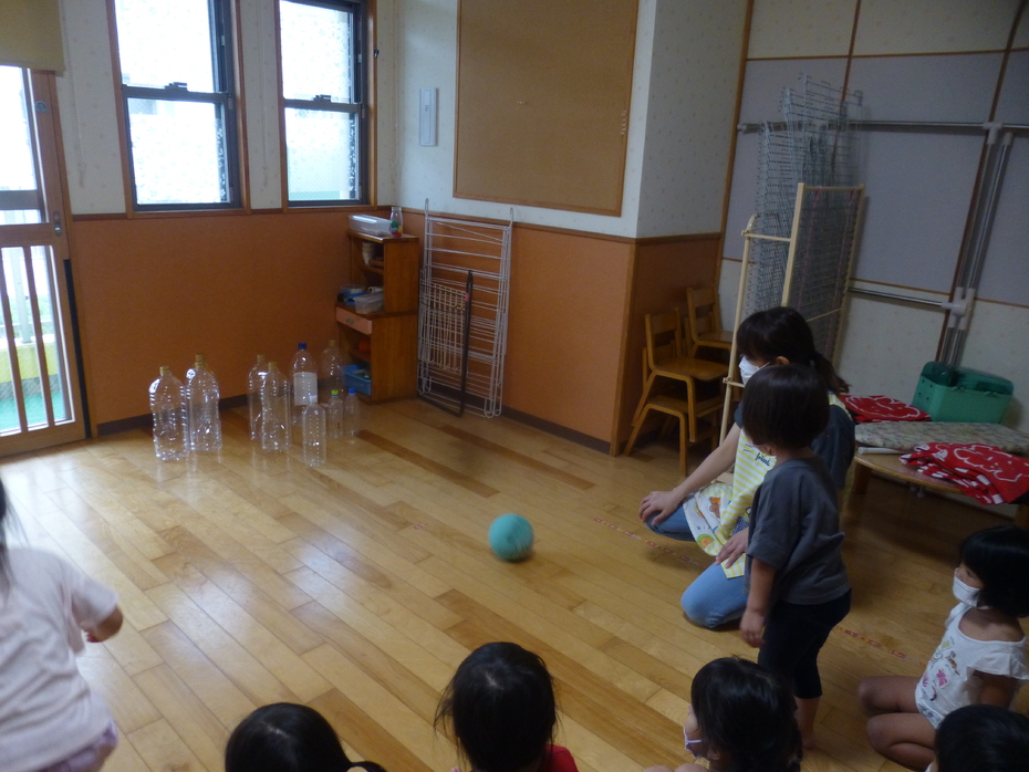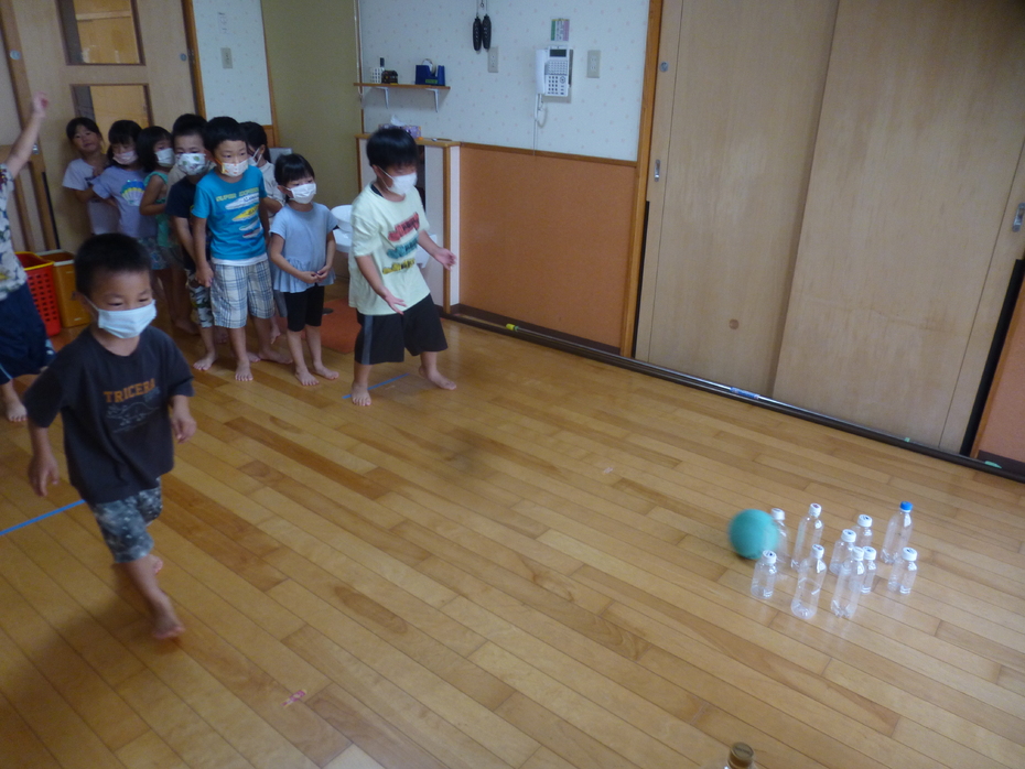 今日は8月の誕生会!誕生者のお祝いをしたり、お話を聞いたり、ゲーム遊びをしたりして過ごしました。ゲーム遊びは、3つのお部屋に分かれて、ボーリング・宝探し・リズム遊びを楽しみましたよ。