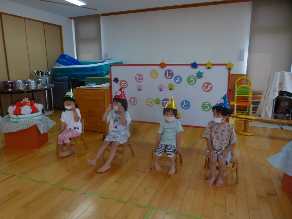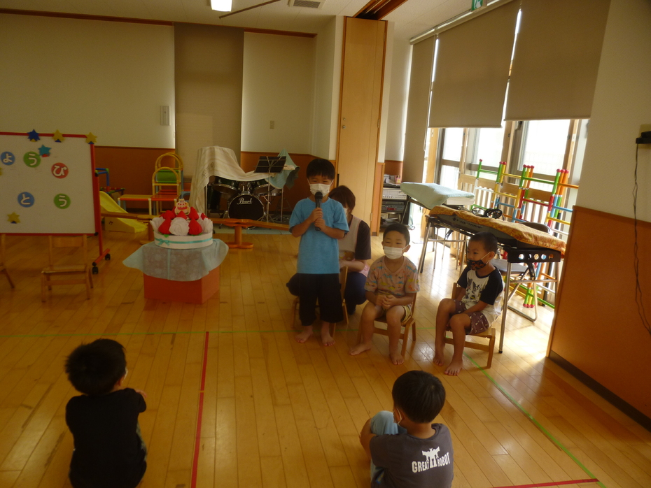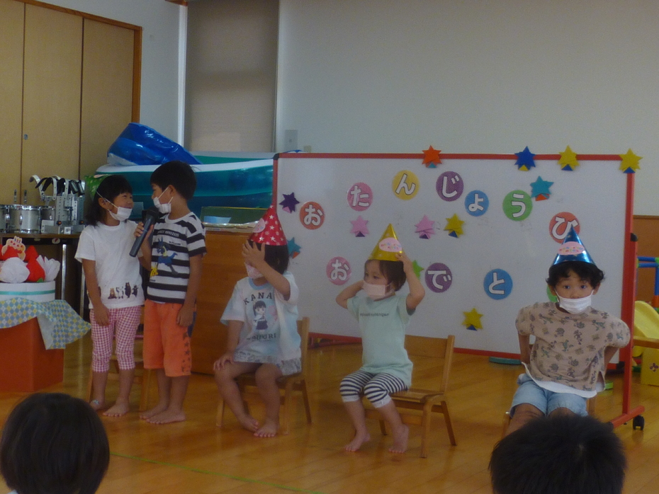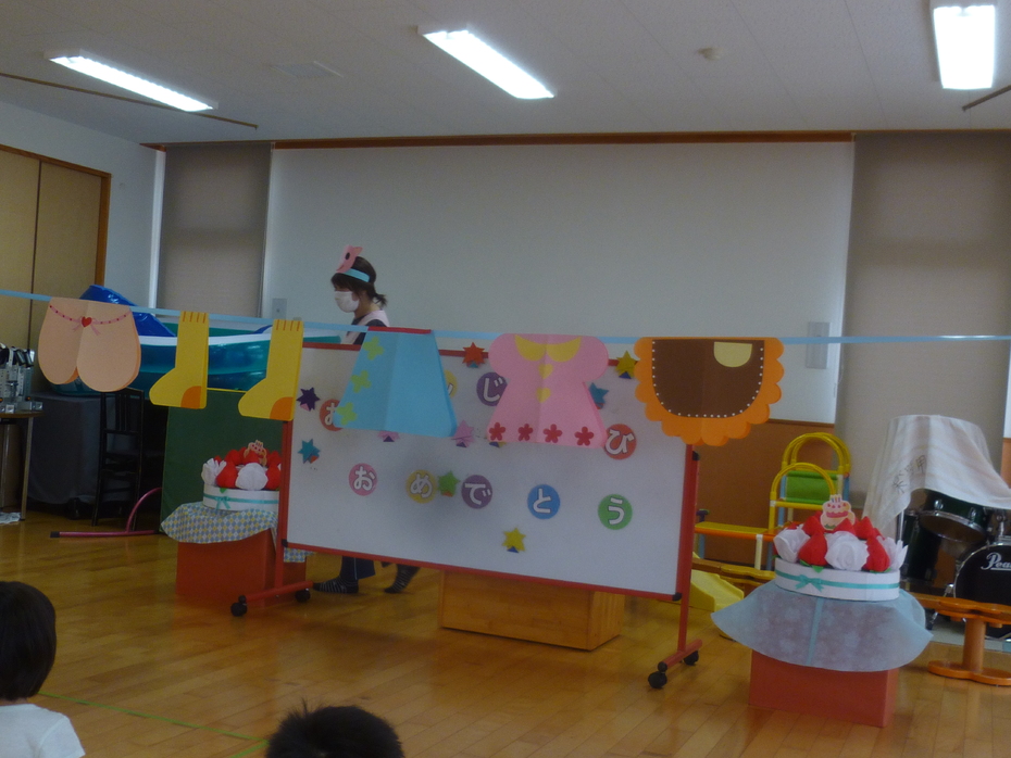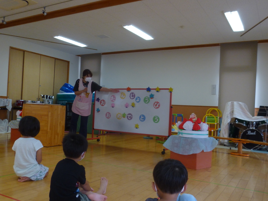 | 誕生者をお祝いしたり、大型絵本を見たり、動物しりとりゲームをみんなで楽しんだりしました。 | ||