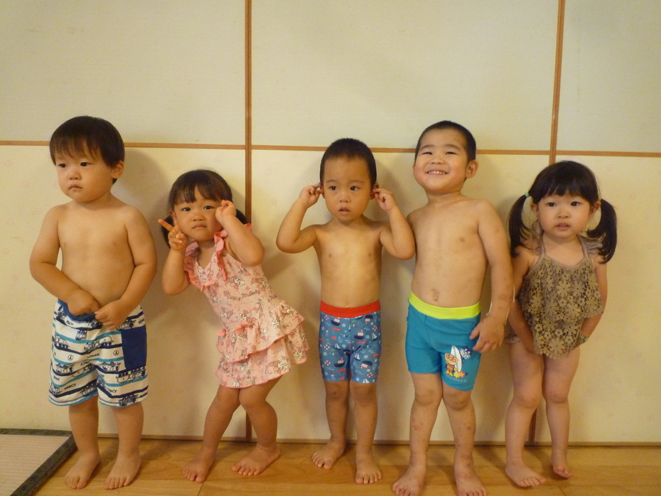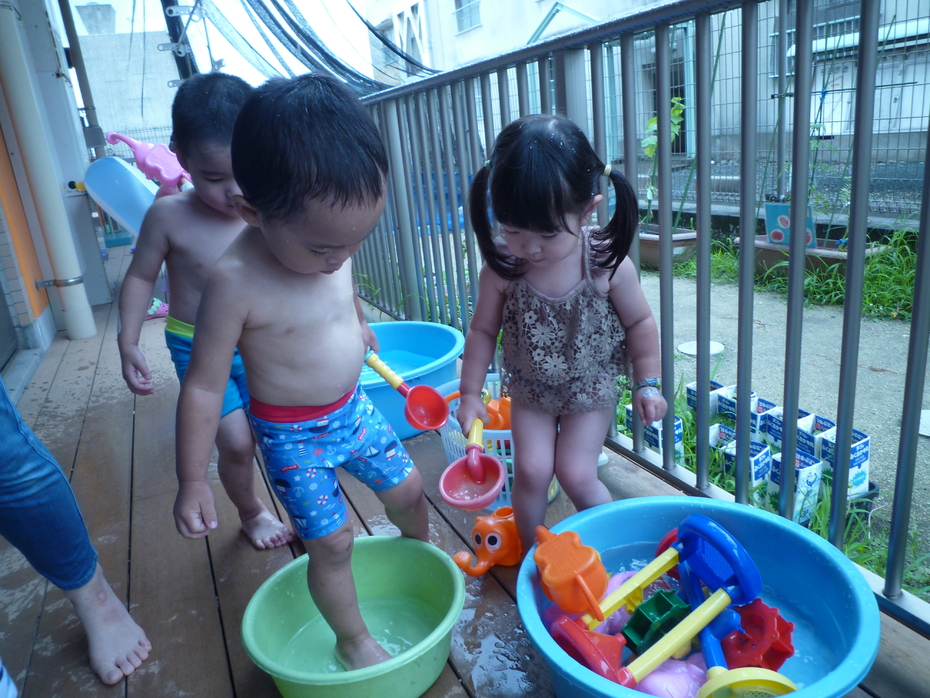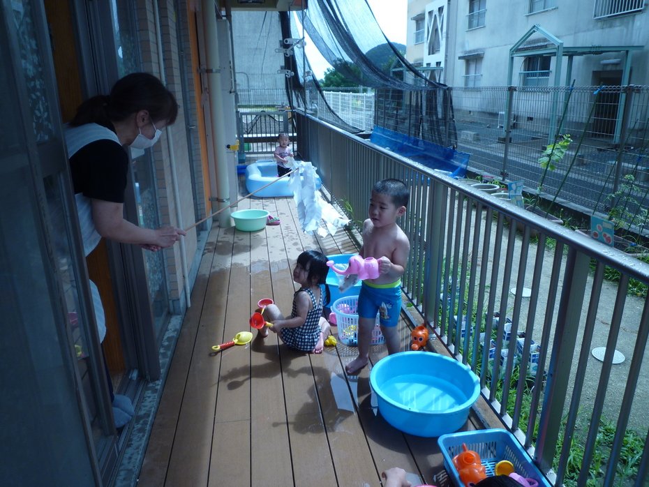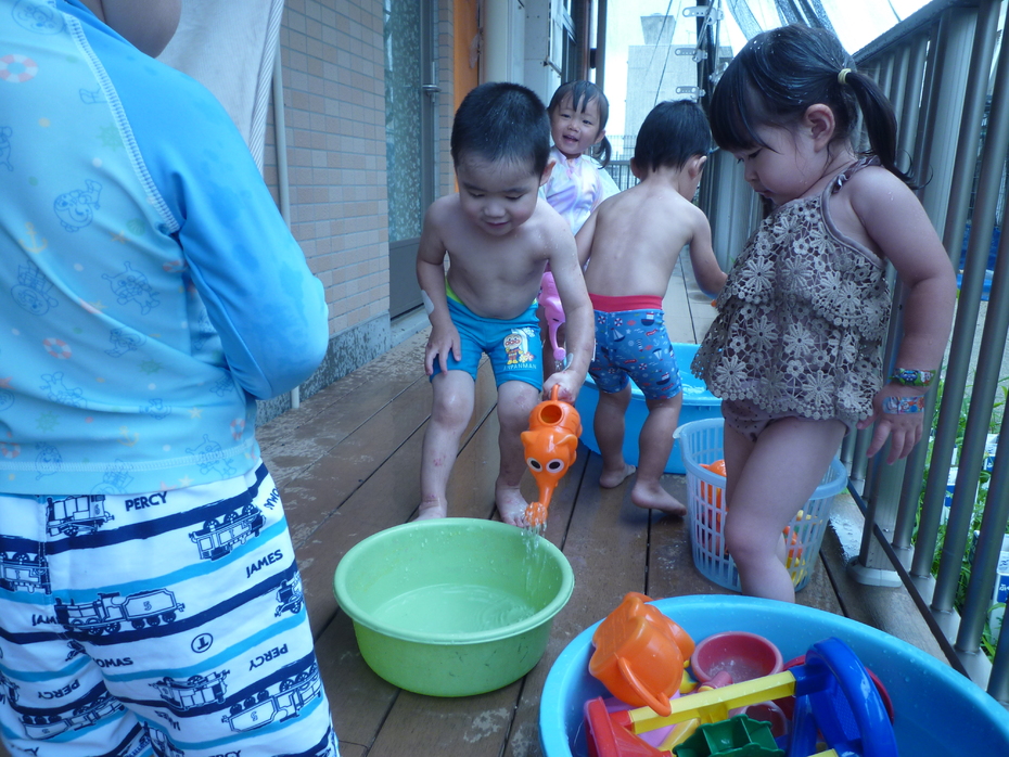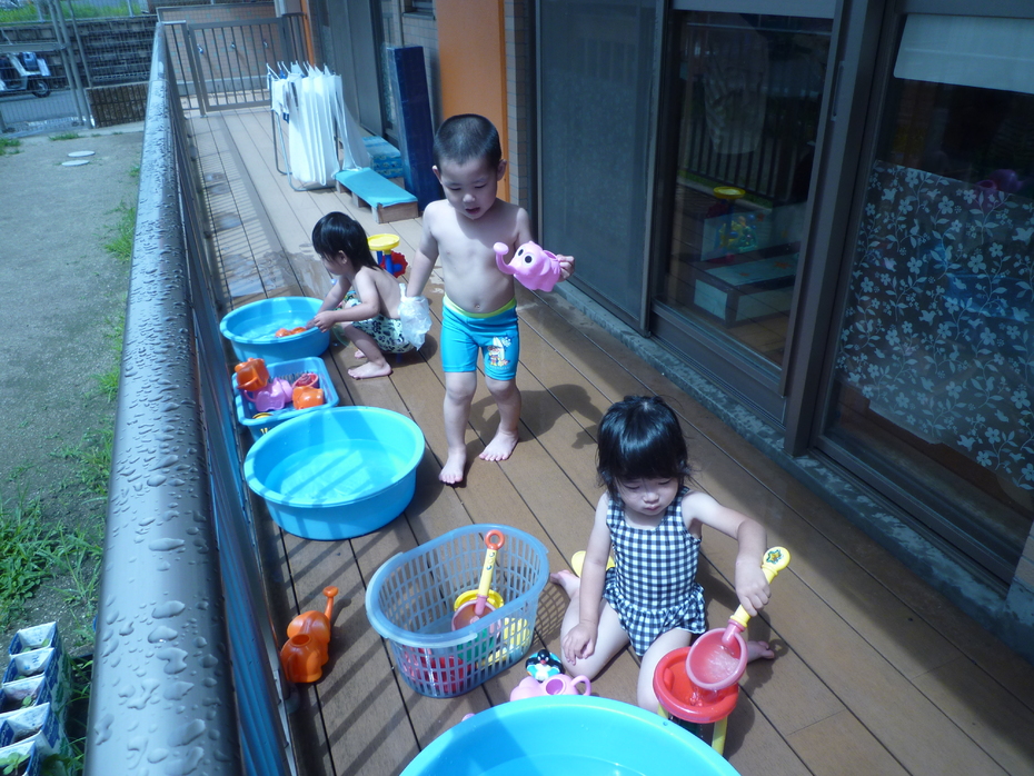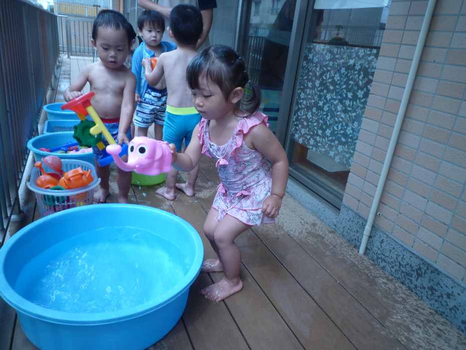 今日は待ちに待ったプール開き!お天気がいまいちだったのでテラスで水遊びを楽しみました♪2グループに分かれて水遊びを体験したうさぎぐみです!