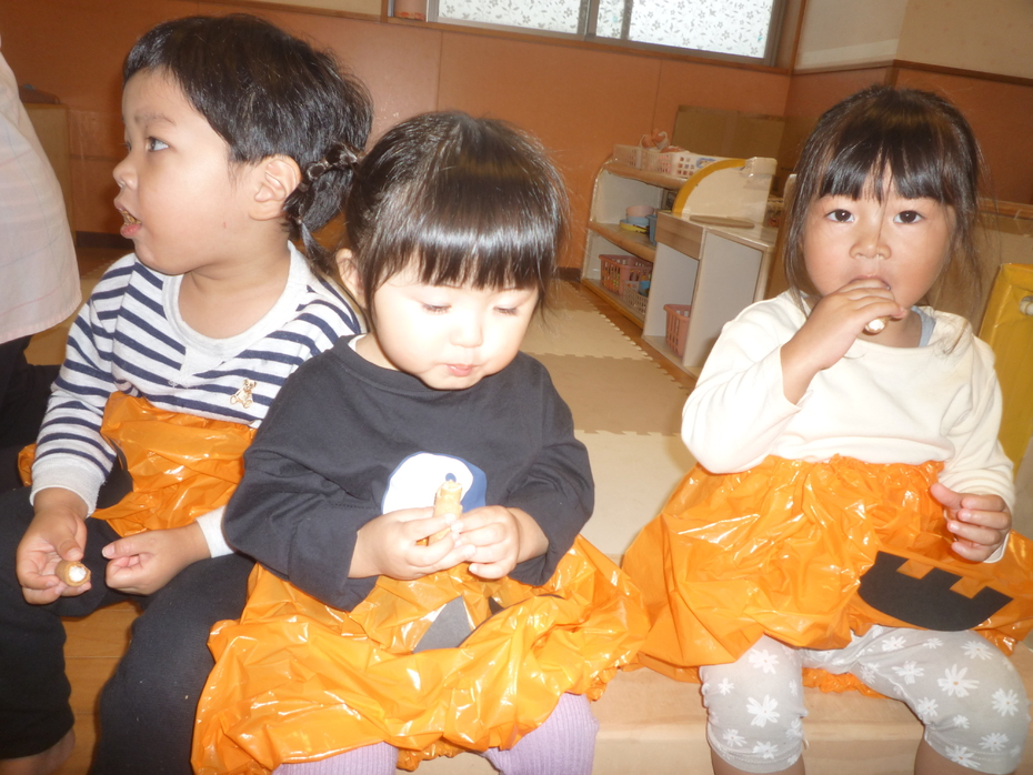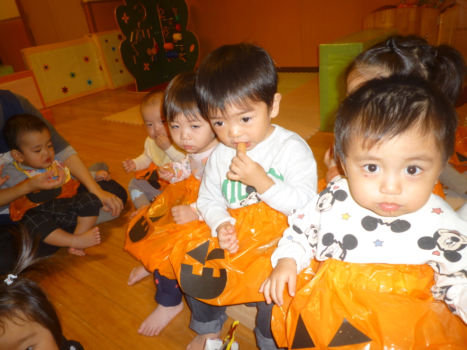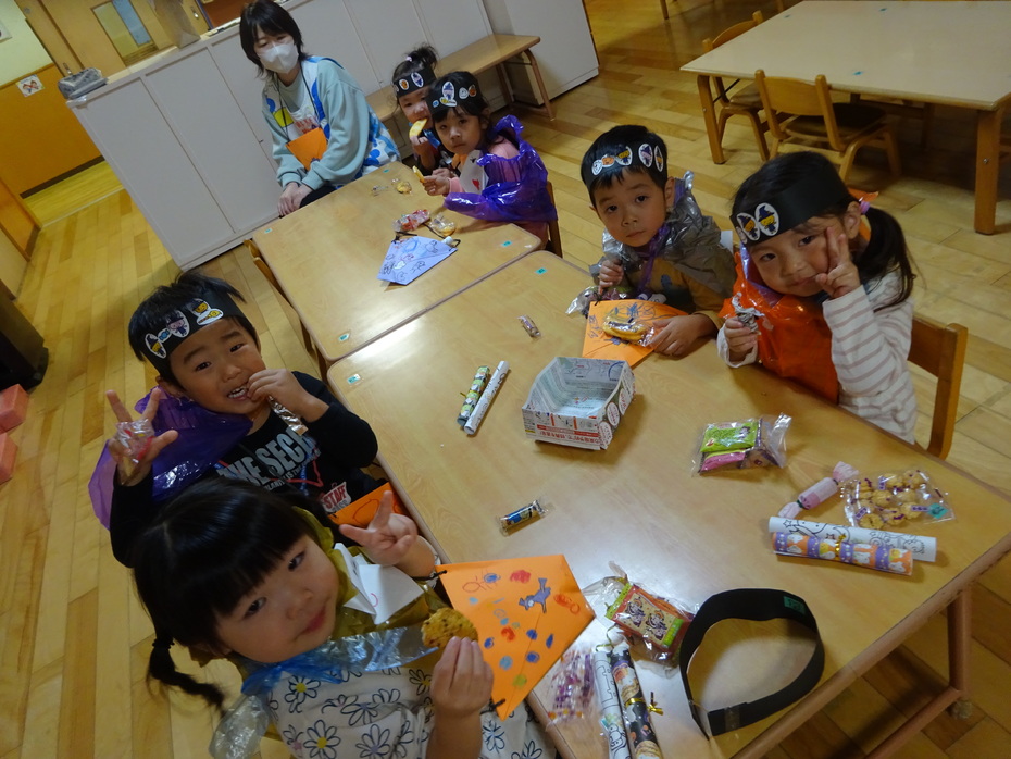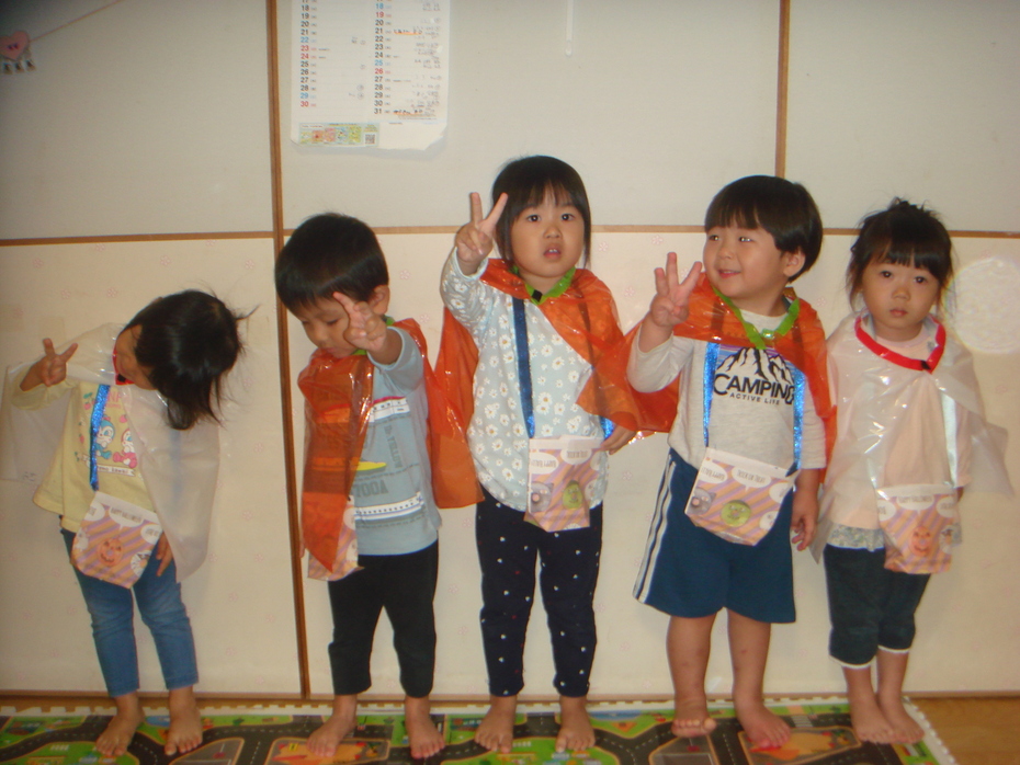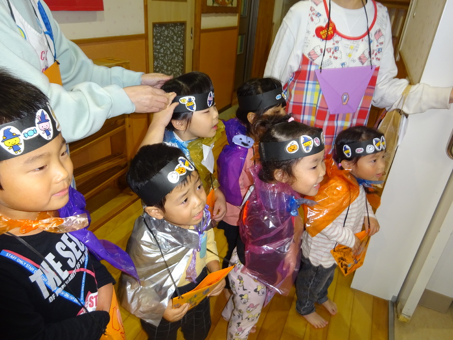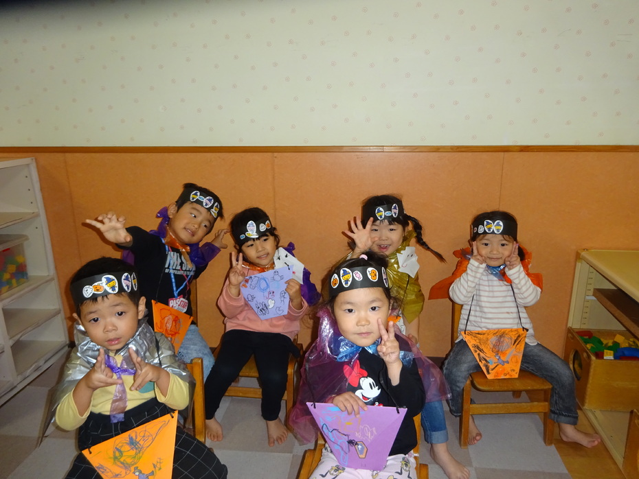 | 今日はハロウィンですね~!園では、自分たちで作った衣装を身に付け、園内を回りましたよ。「トリック オア トリート!!」と大きな声で言う子もいましたが、友達の後ろに隠れている子もいました!いろんなクラスを回り、みんなでハロウィンを楽しみました! | ||