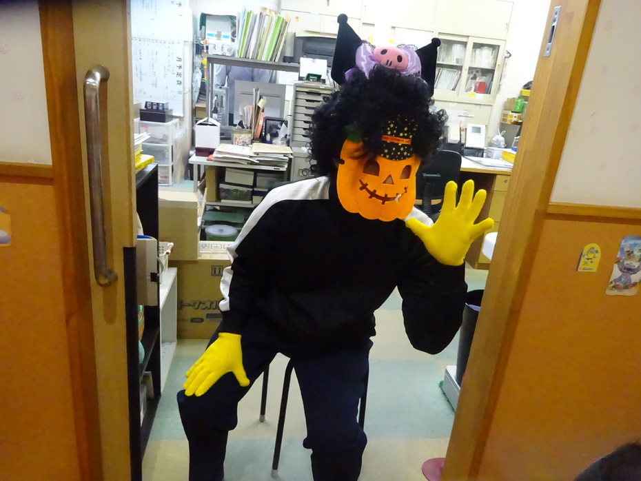 事務室では、こんな仮装でお出迎えです! | ||