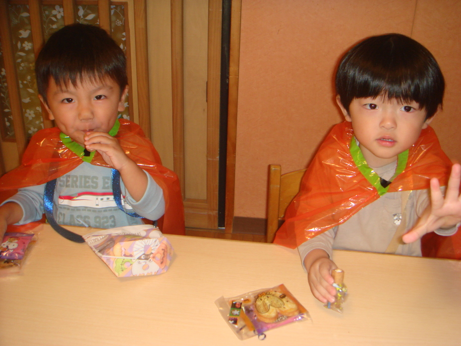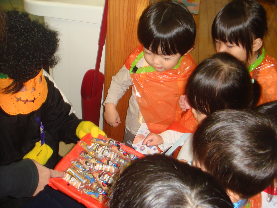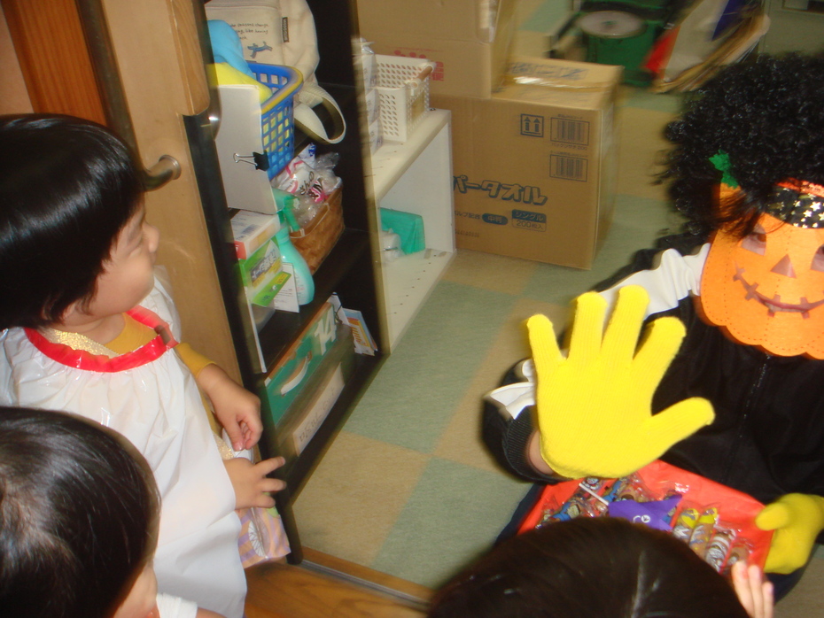 園長先生の仮装にビックリしたけれど、お菓子をもらったよ! | ||