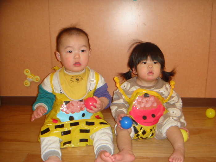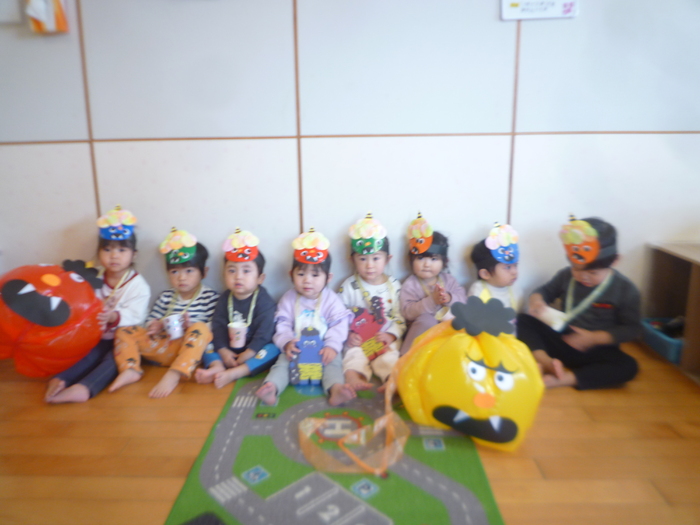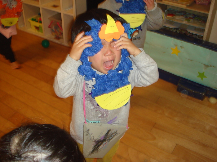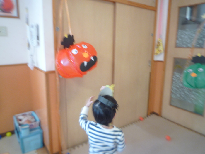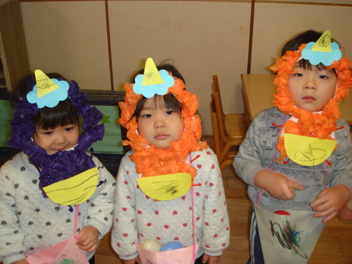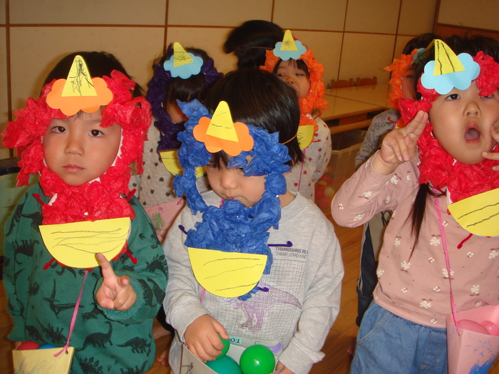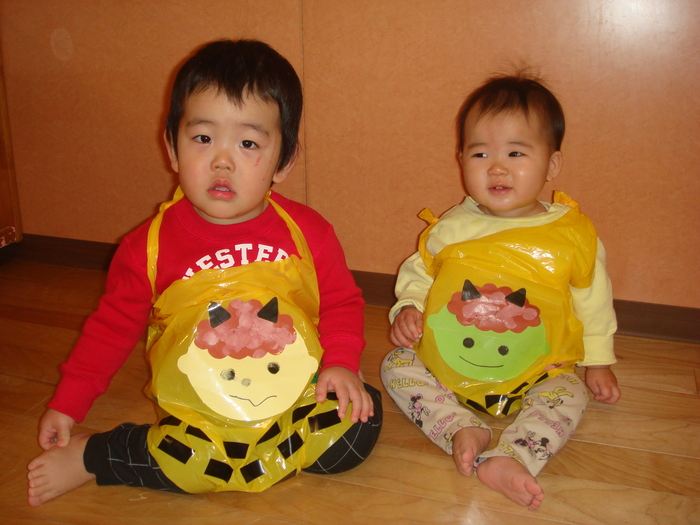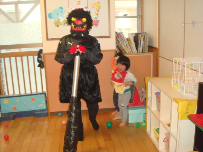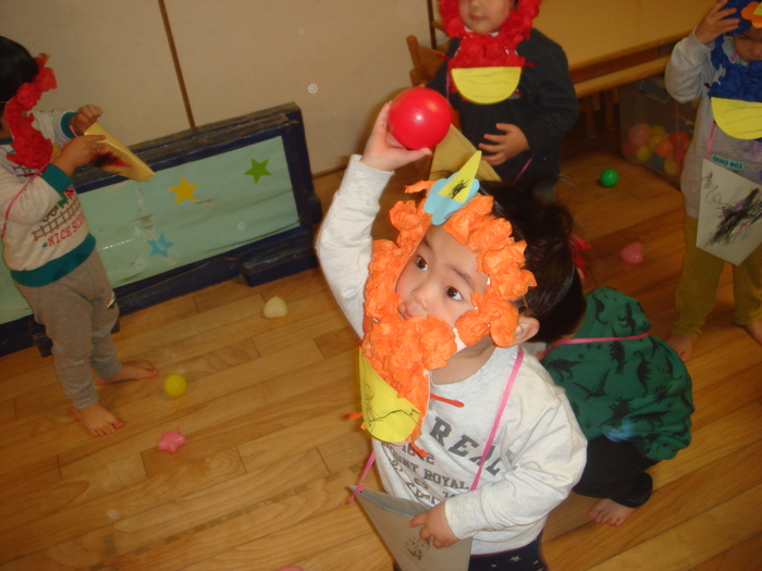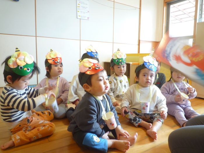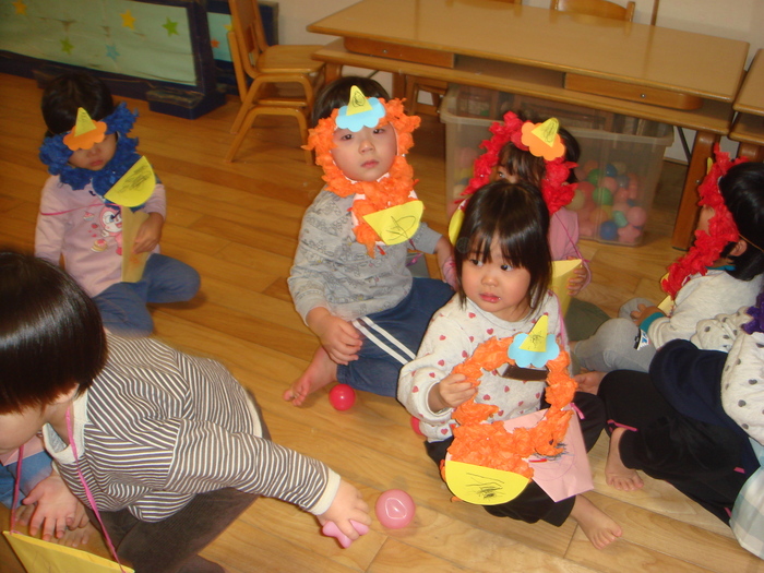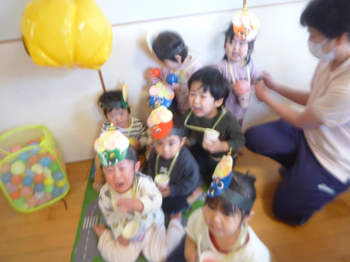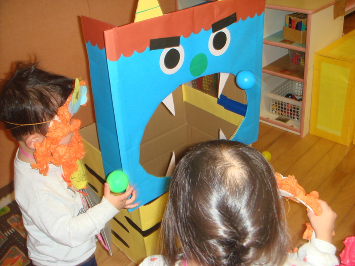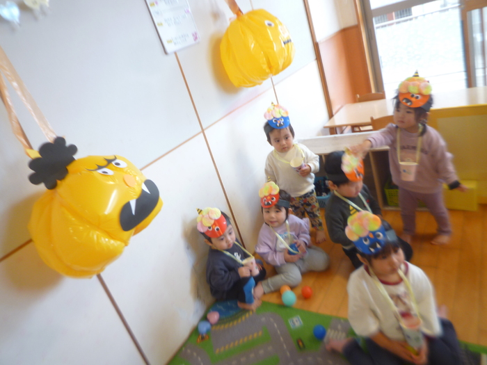 鬼のお面や服を着て豆まき遊びをしました。とても可愛い鬼でしたよ♪鬼の姿が見えると怖がったり、『おにはそと!!』と言ったりしてボールを投げていました。