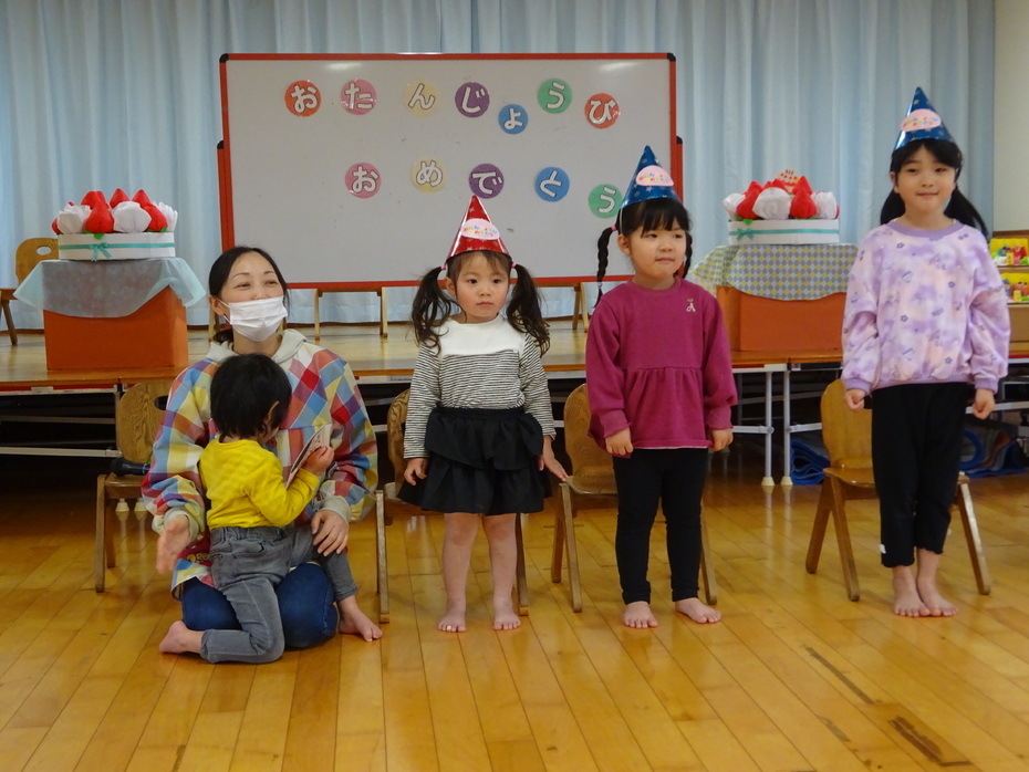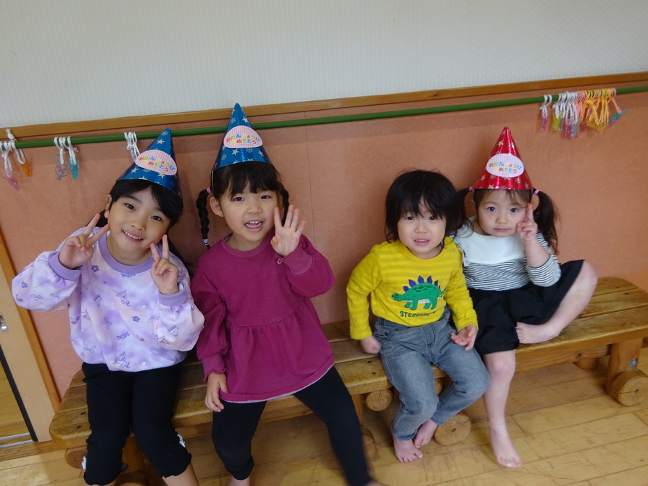 | 今日は3月3日!誕生会とひなまつり集会をしました。今月もうさぎ組さんも参加しました。 | ||