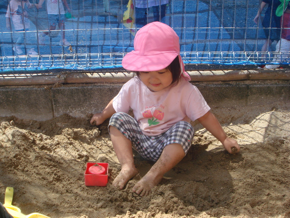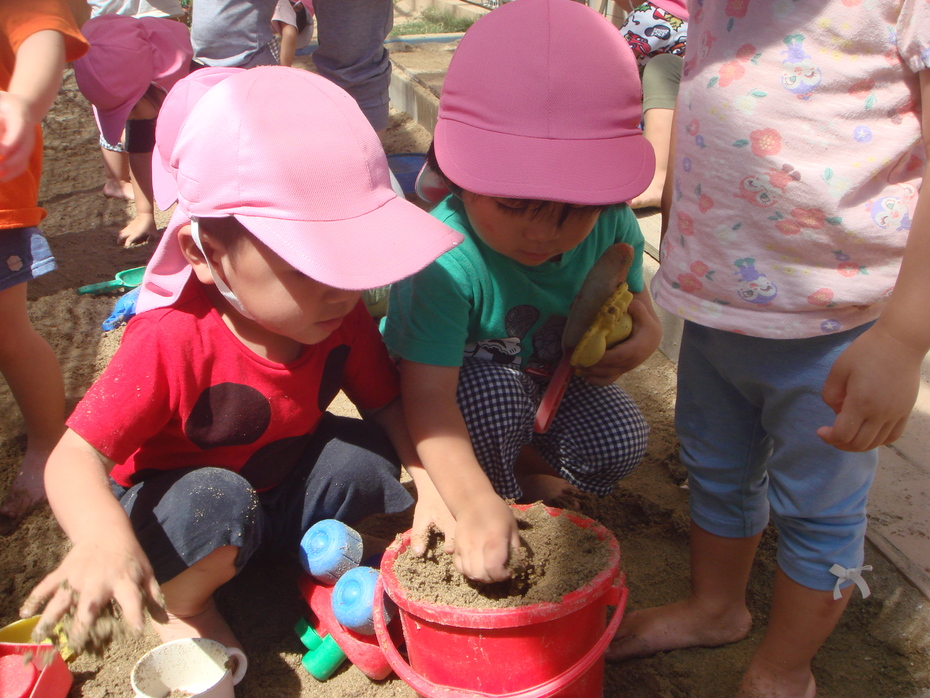 砂場あそび、水も入れてドロドロ~。気持ちいいな~。