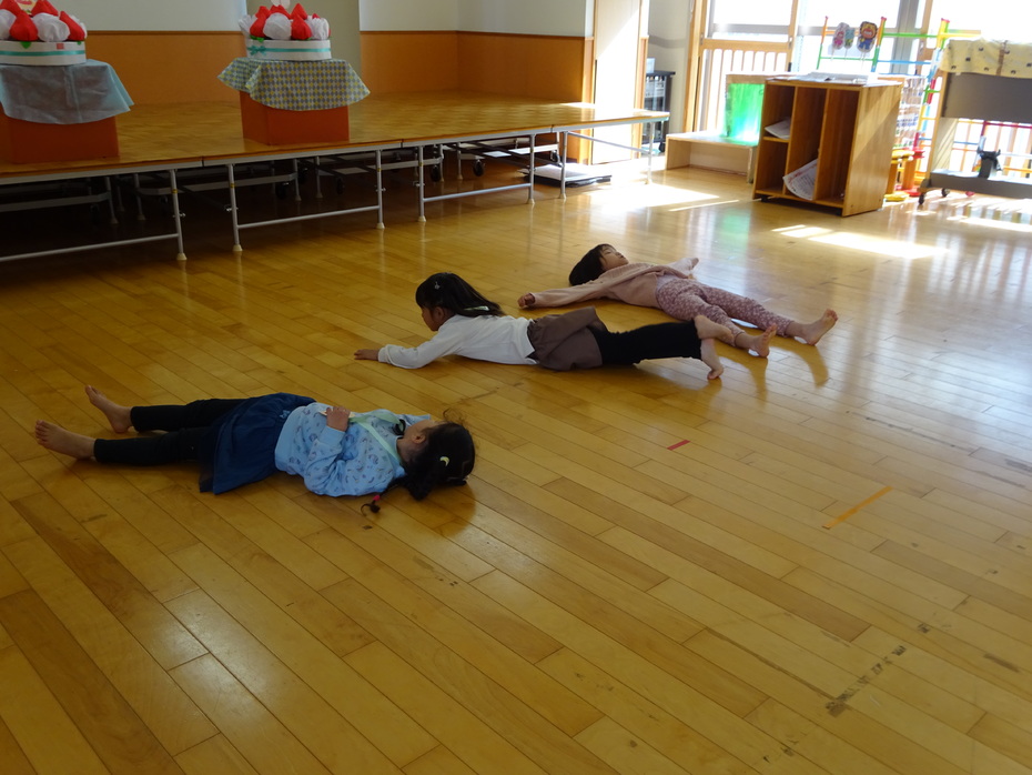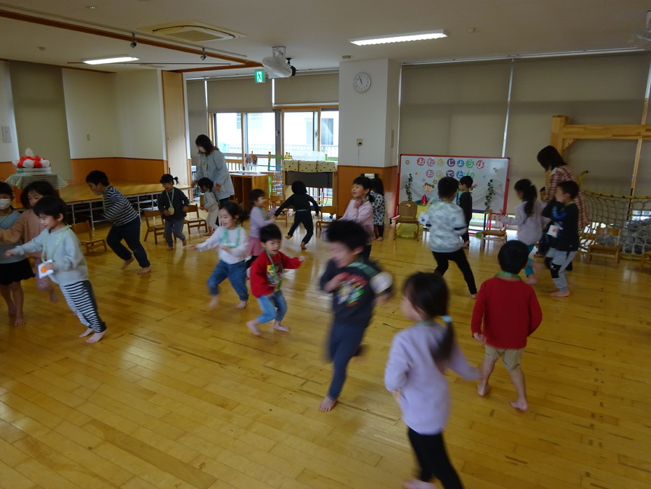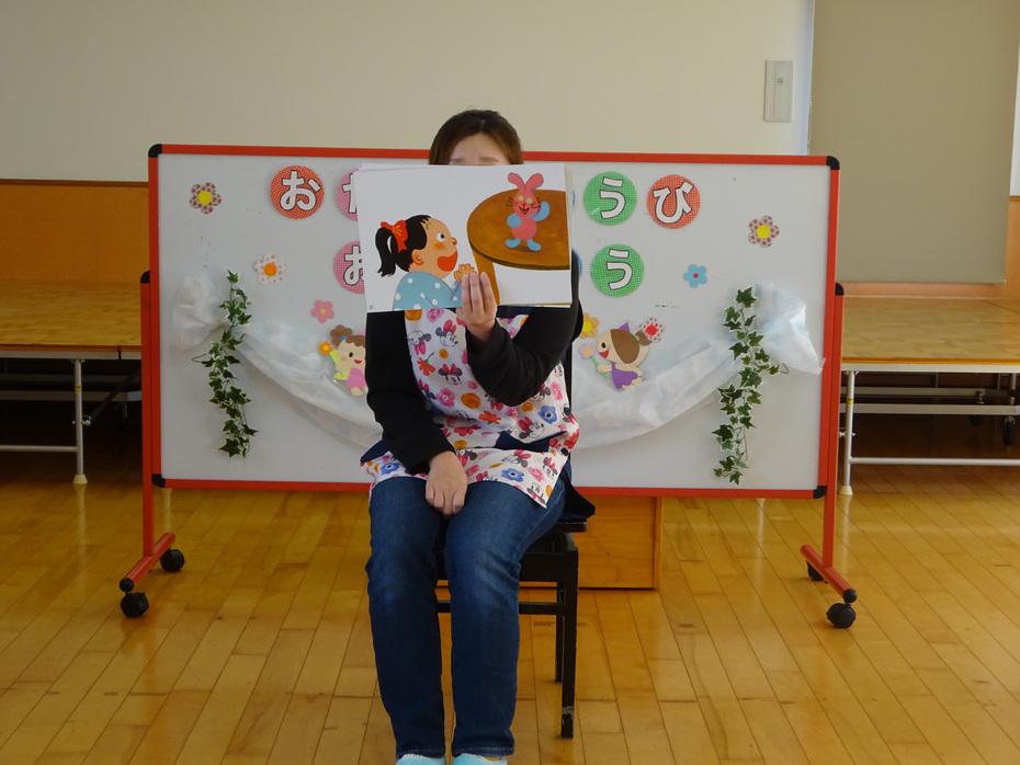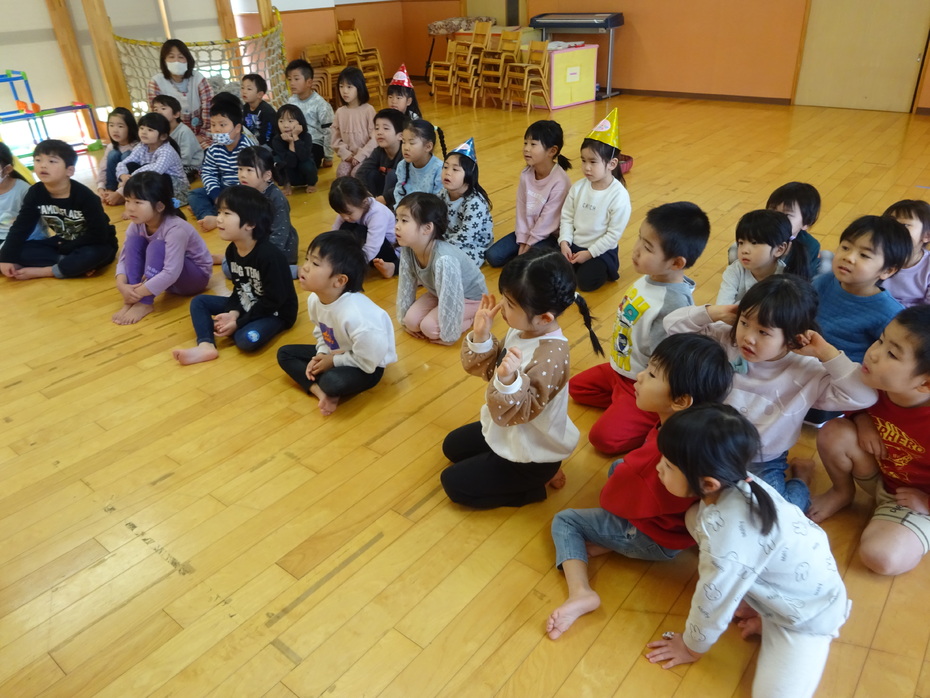 2月の誕生児は4人でした。『きょうはおたんじょうびかい』の紙芝居や『そとであそんだあとは』のペープサートをみたり、フルーツバスケットをしたりしました。