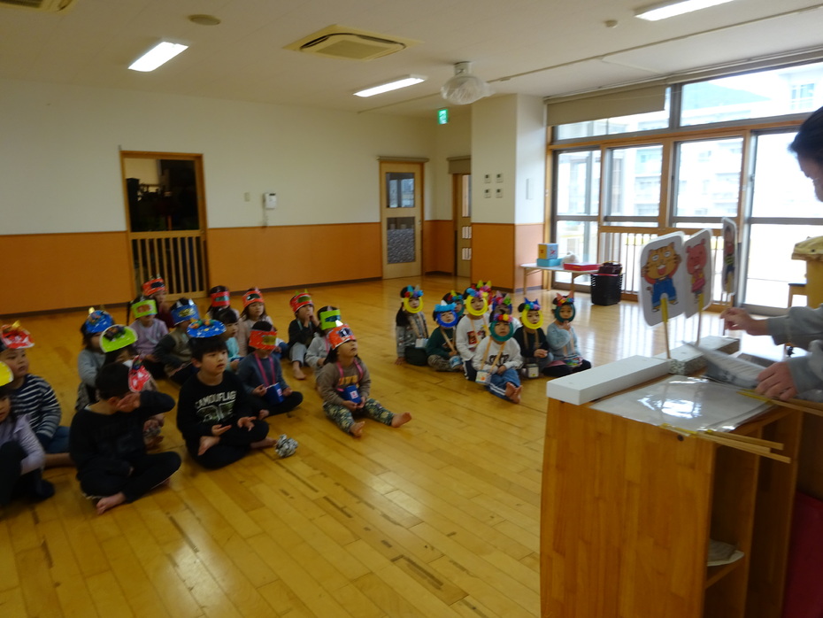 節分集会をしました。みんなで『まめまき』の歌を歌ったり、鬼のパンツの手遊びをしたりしました。そのあと、ペープサートや紙芝居もみました。
