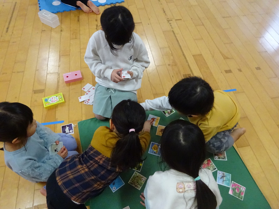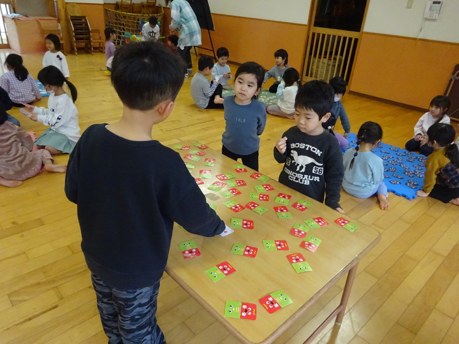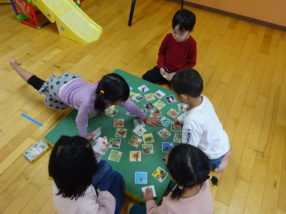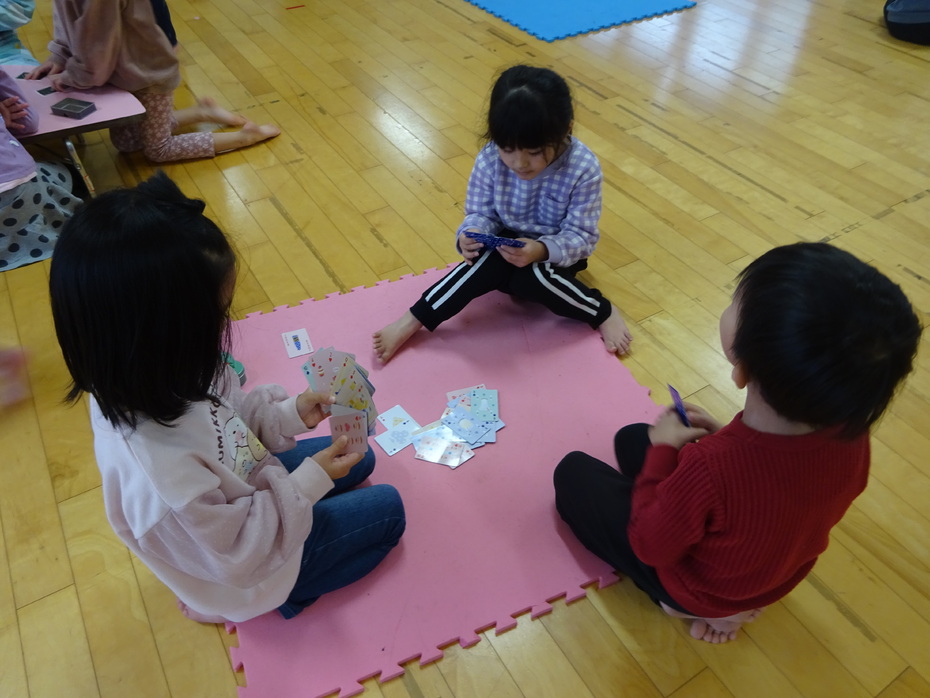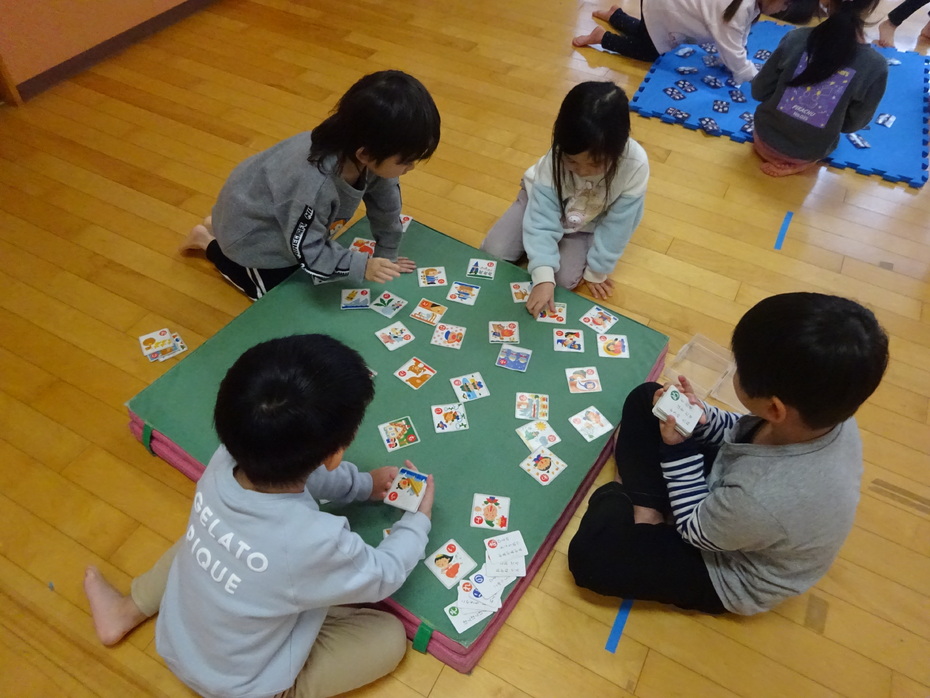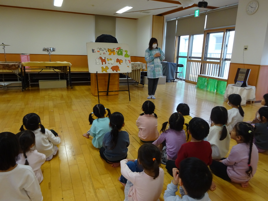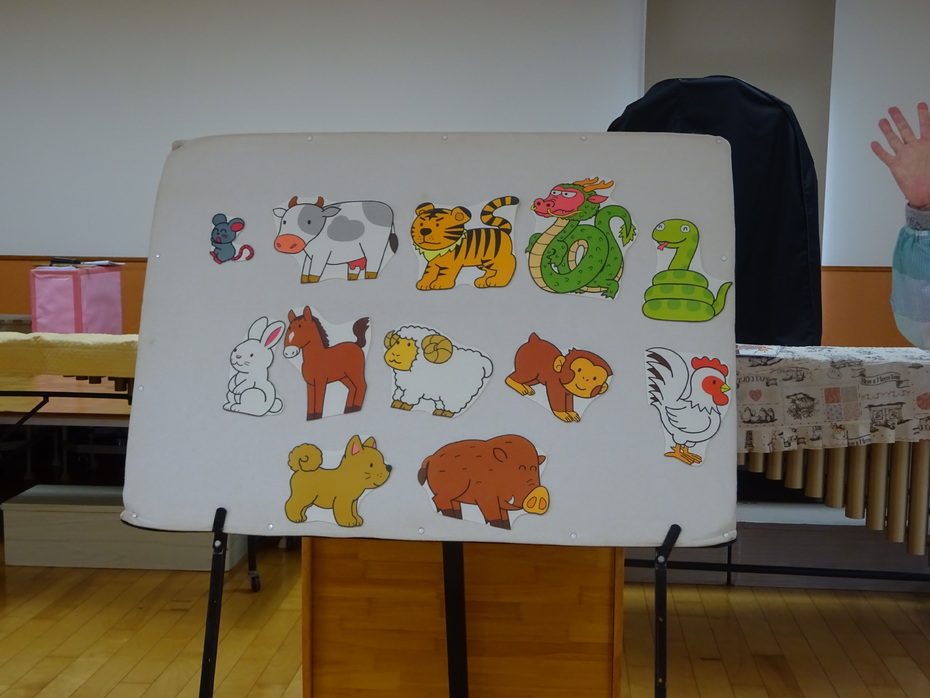 | 誕生会に参加しました。今月も誕生児のお友達がいませんでした。しかし、園長先生の誕生日が今月で、歌のプレゼントと質問タイムを作りました。 「十二支のはじまり」のパネルシアターを見て、カード遊びを楽しみました。 | ||