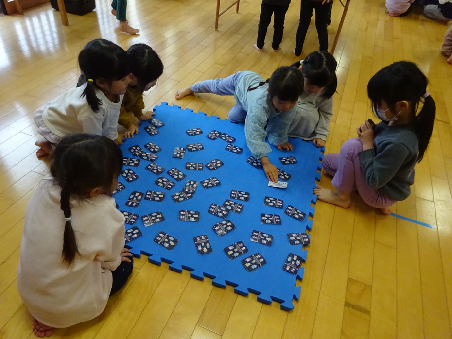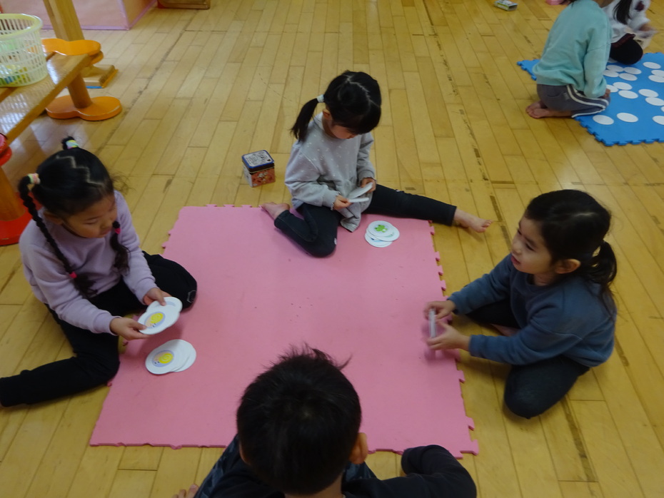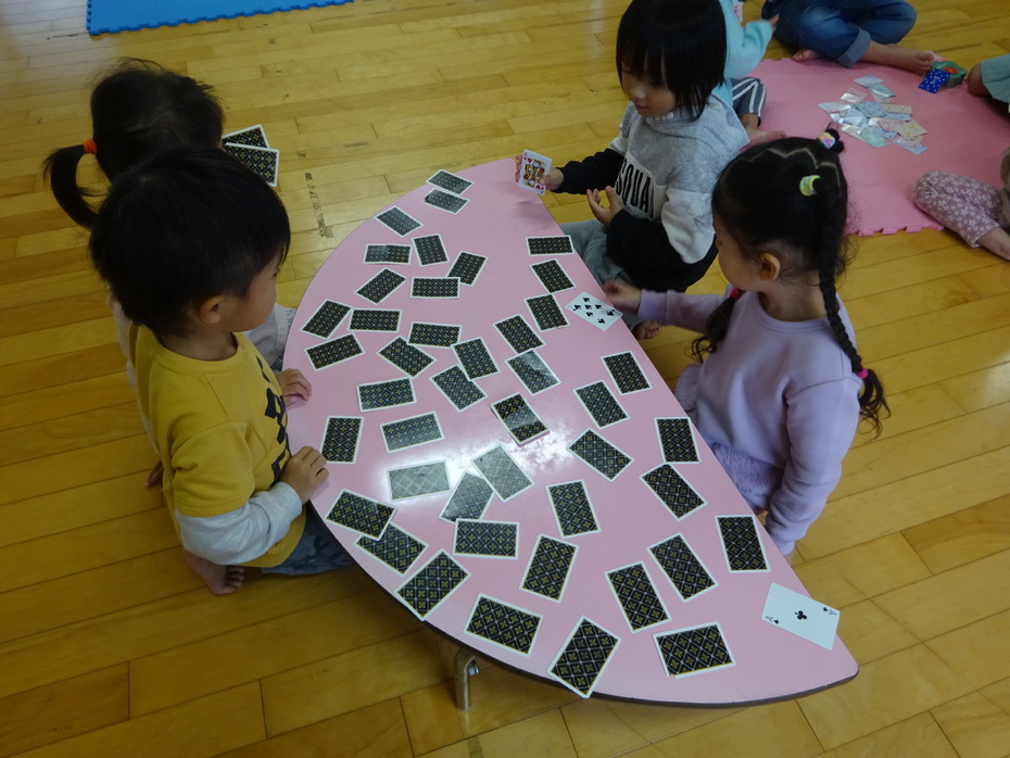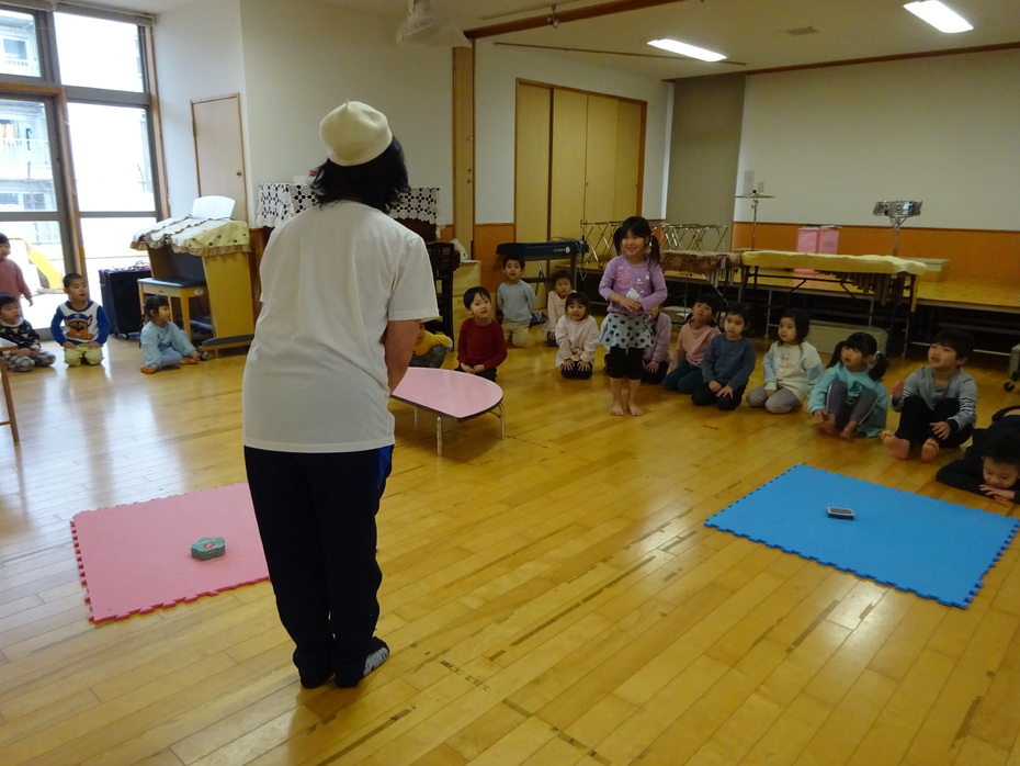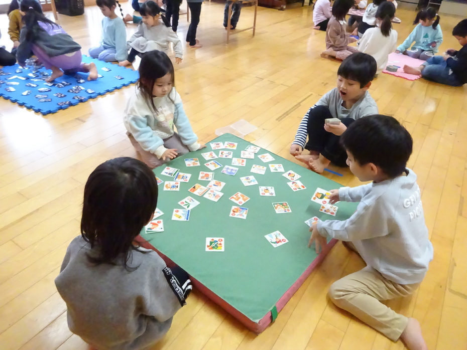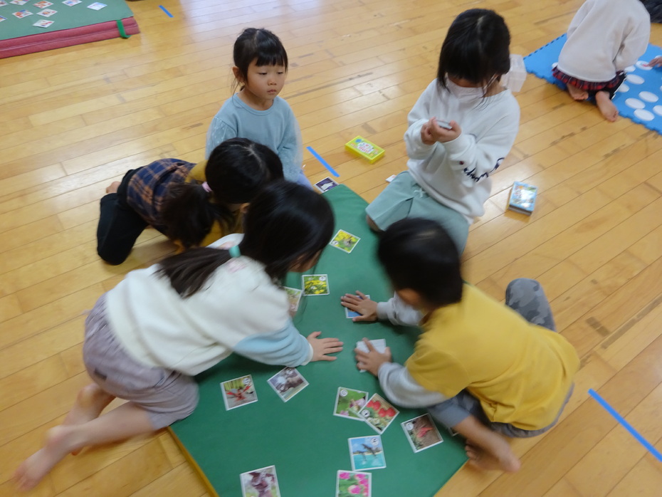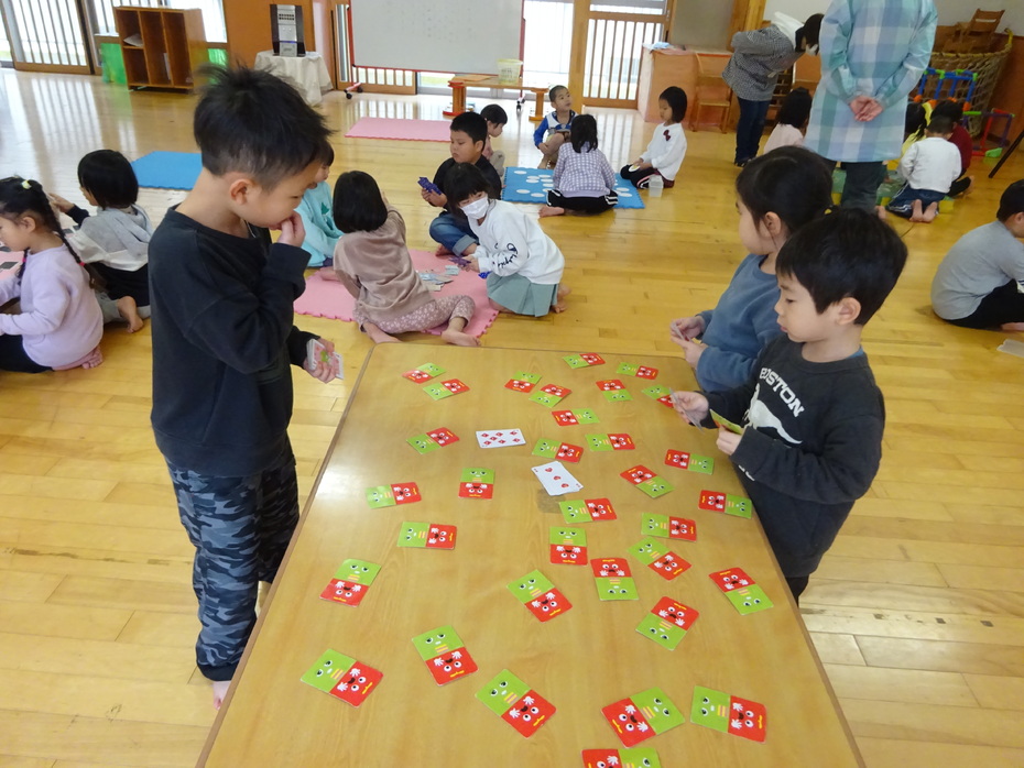 | 誕生会に参加しました。今月も誕生児のお友達がいませんでした。しかし、園長先生の誕生日が今月で、歌のプレゼントと質問タイムを作りました。 「十二支のはじまり」のパネルシアターを見て、カード遊びを楽しみました。 | ||