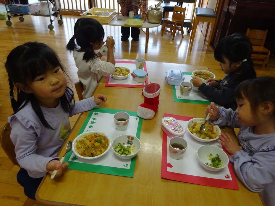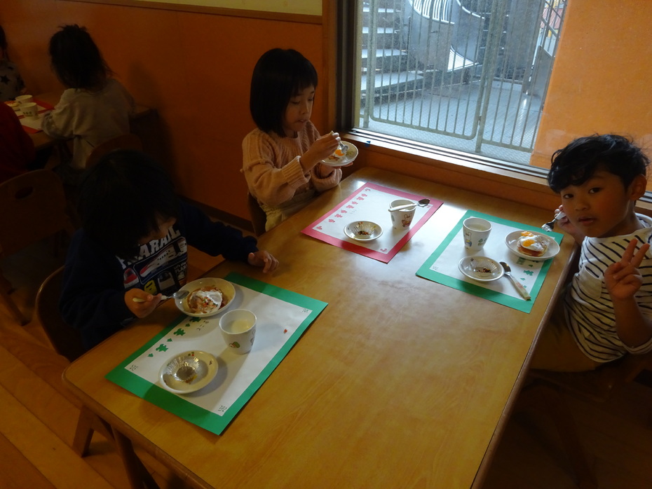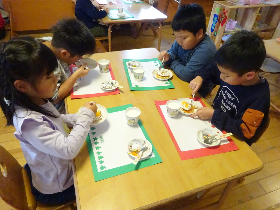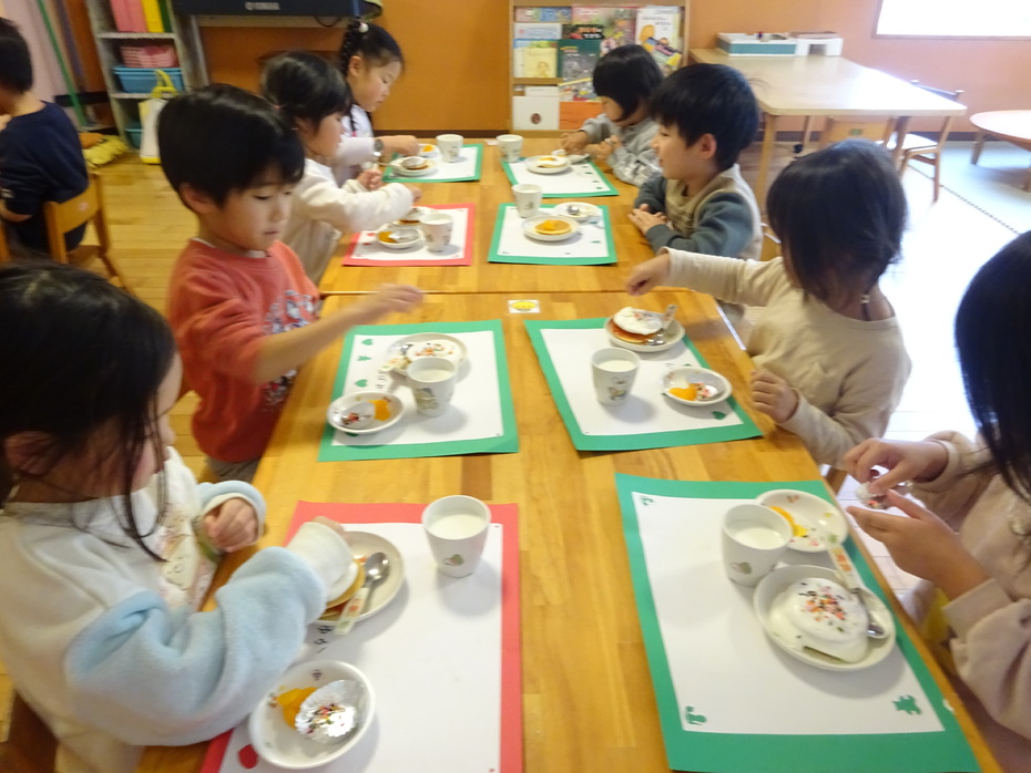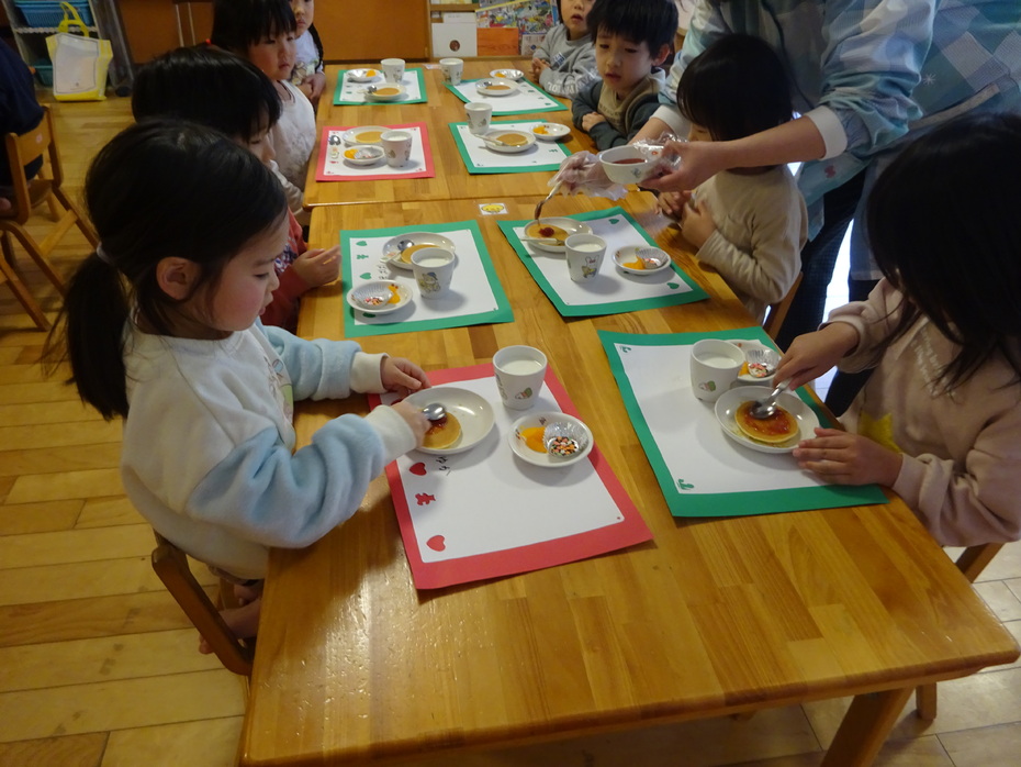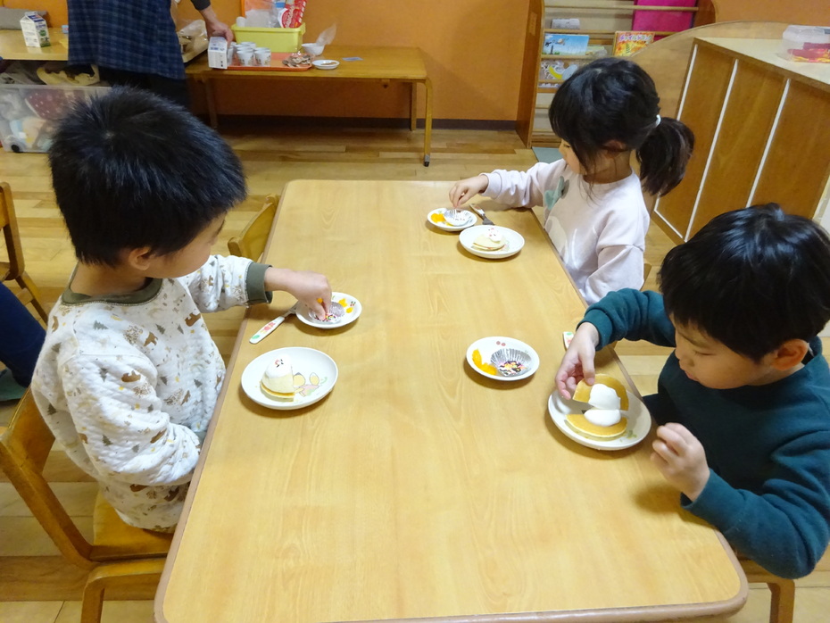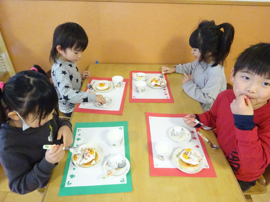 給食もみんなで食べました♪ランチョンマット敷いたり、飾りを置いたりいつもと違う雰囲気に喜んでいました。おやつでパンケーキ♪自分たちでシジャムを塗り、みかんとチョコをトッピングしました。生クリームも美味しかったようです。