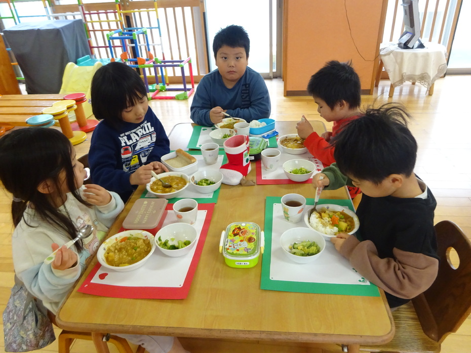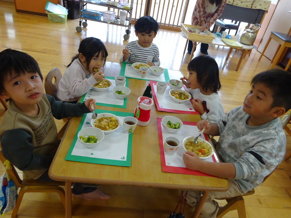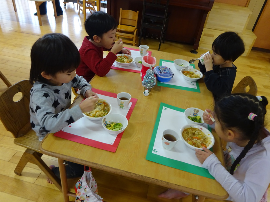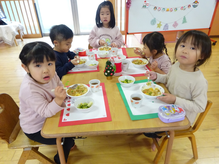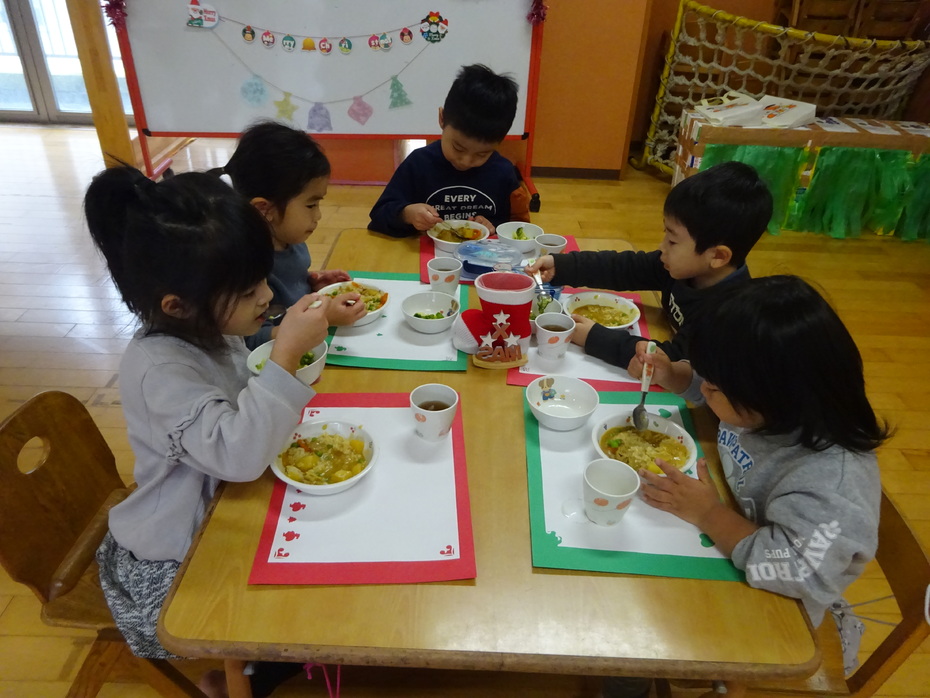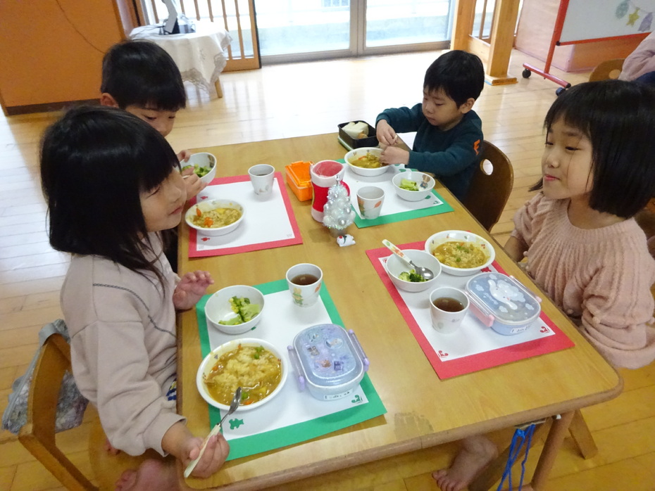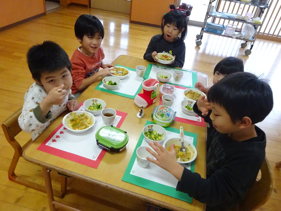 給食もみんなで食べました♪ランチョンマット敷いたり、飾りを置いたりいつもと違う雰囲気に喜んでいました。おやつでパンケーキ♪自分たちでシジャムを塗り、みかんとチョコをトッピングしました。生クリームも美味しかったようです。