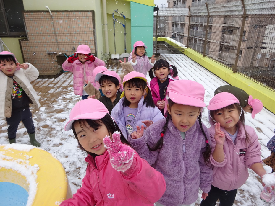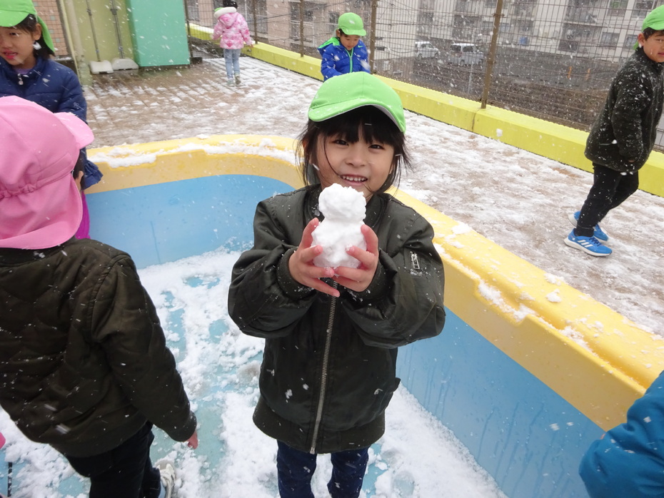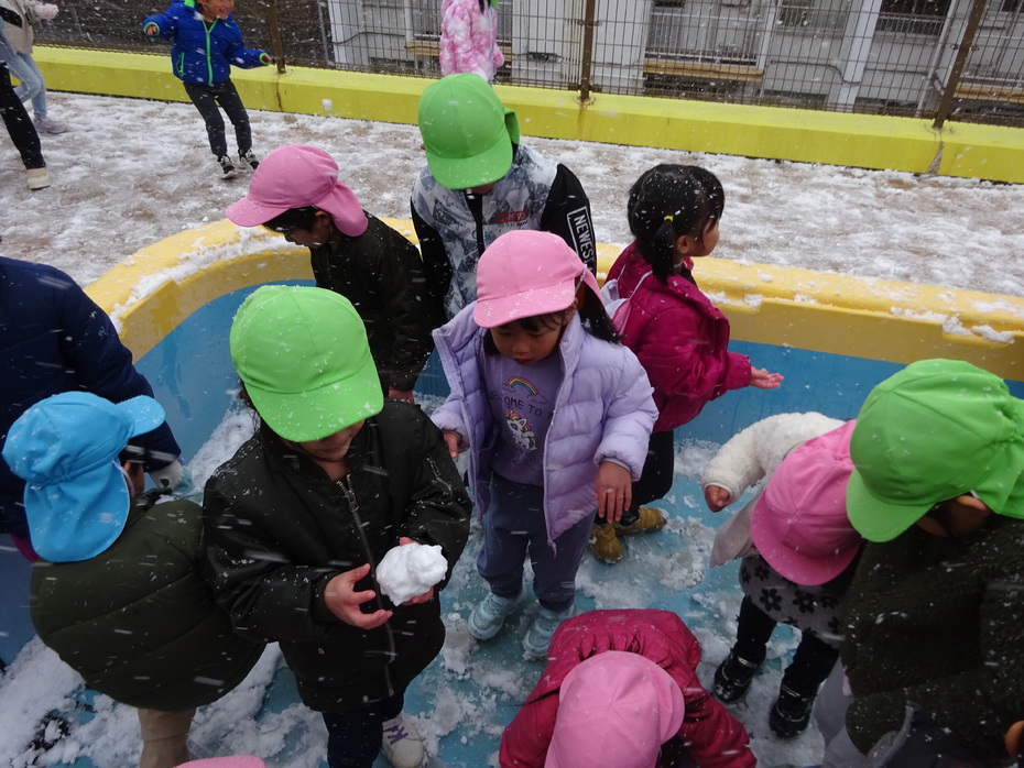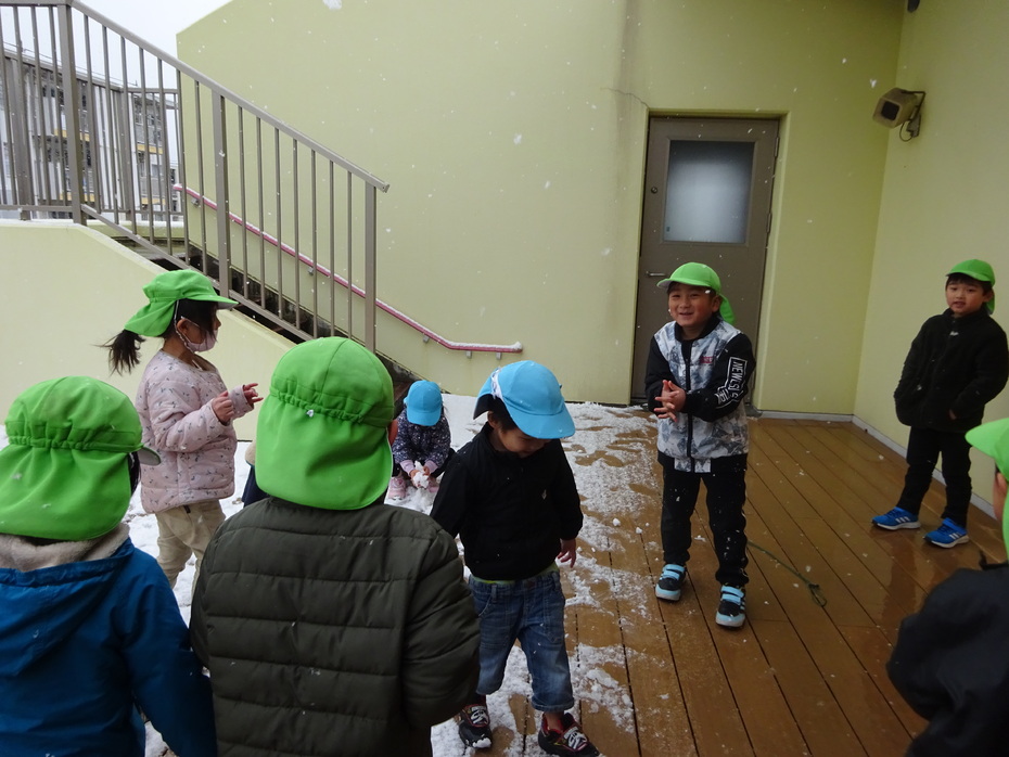 今日は雪が降っていたので……誕生会のあと3Fテラスで雪遊びをしました。『さむーい!!』『つめたーい!』『楽しい!』と3クラスで楽しみました♪今の時期ならではの遊びができました。