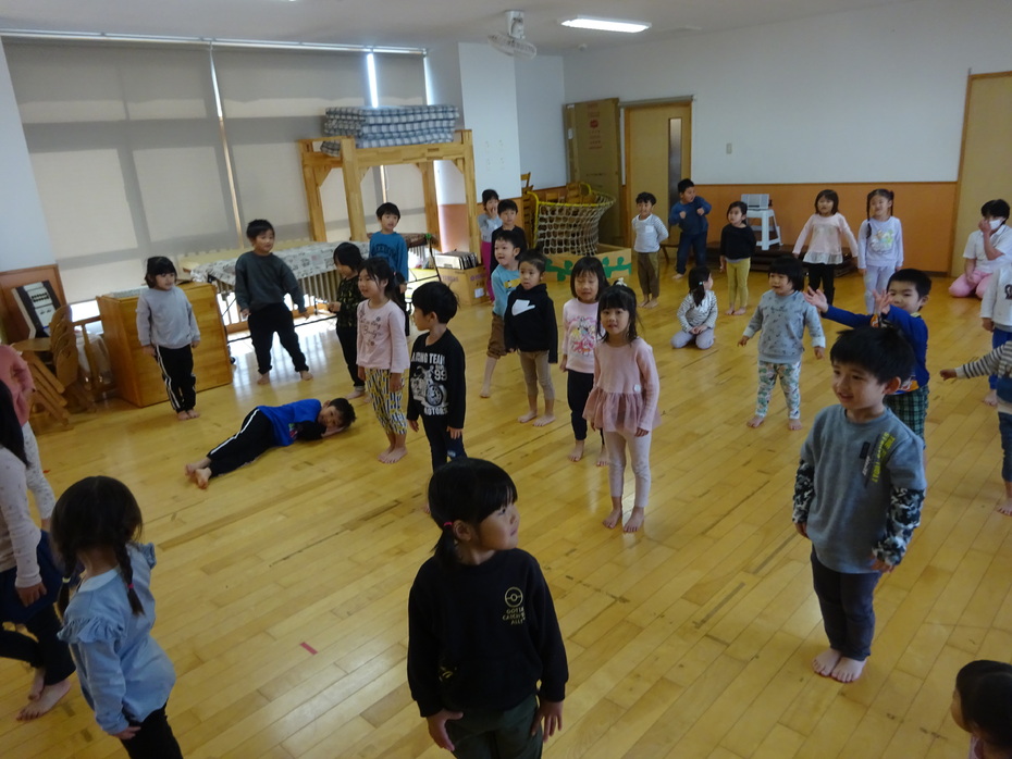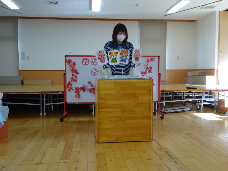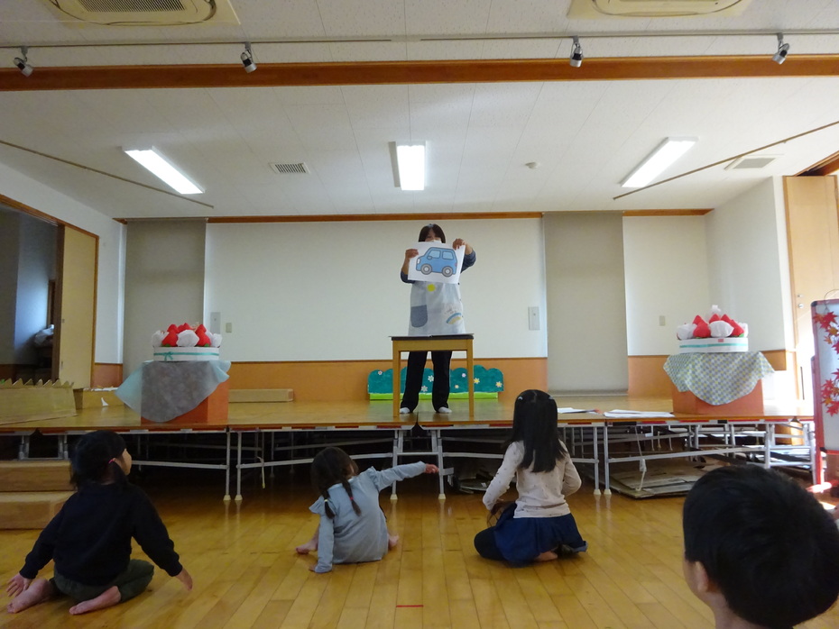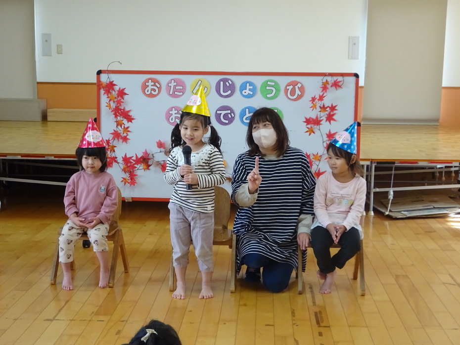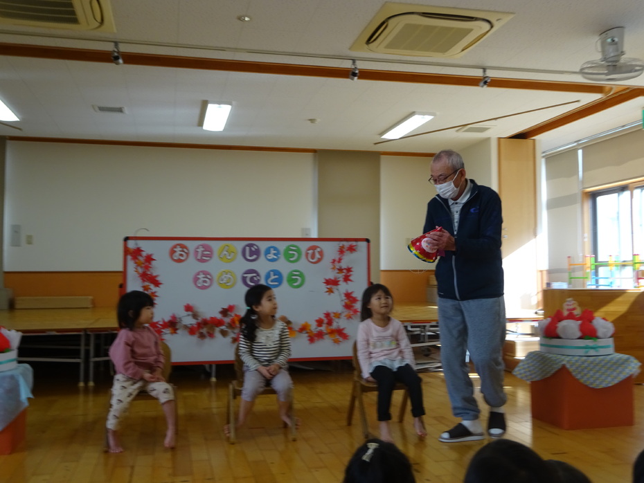 11月の誕生児は3人でした。『あいさつするっていい気持ち』のペープサートをみたり、絵カードを見て身体で表現をしたりする遊びをしました☆