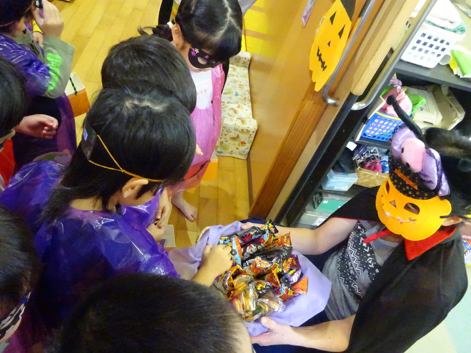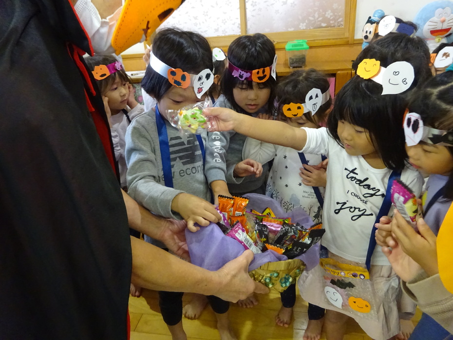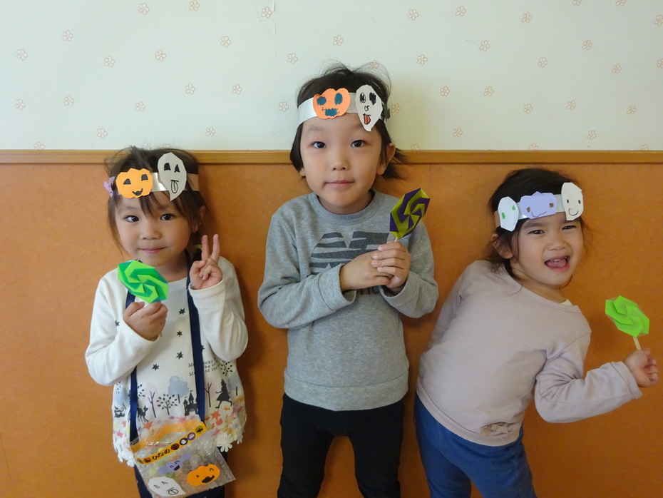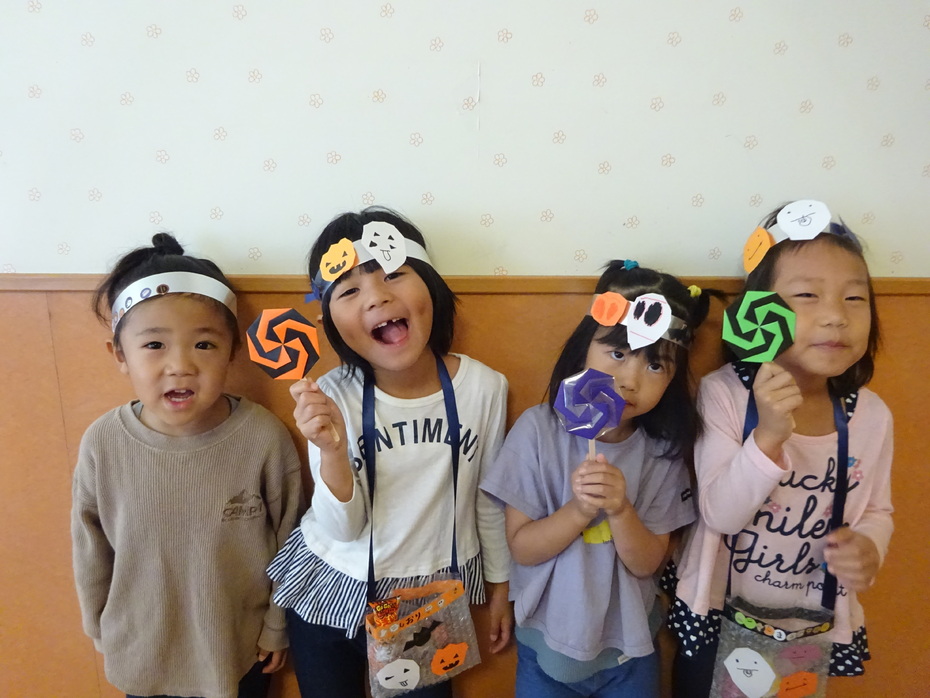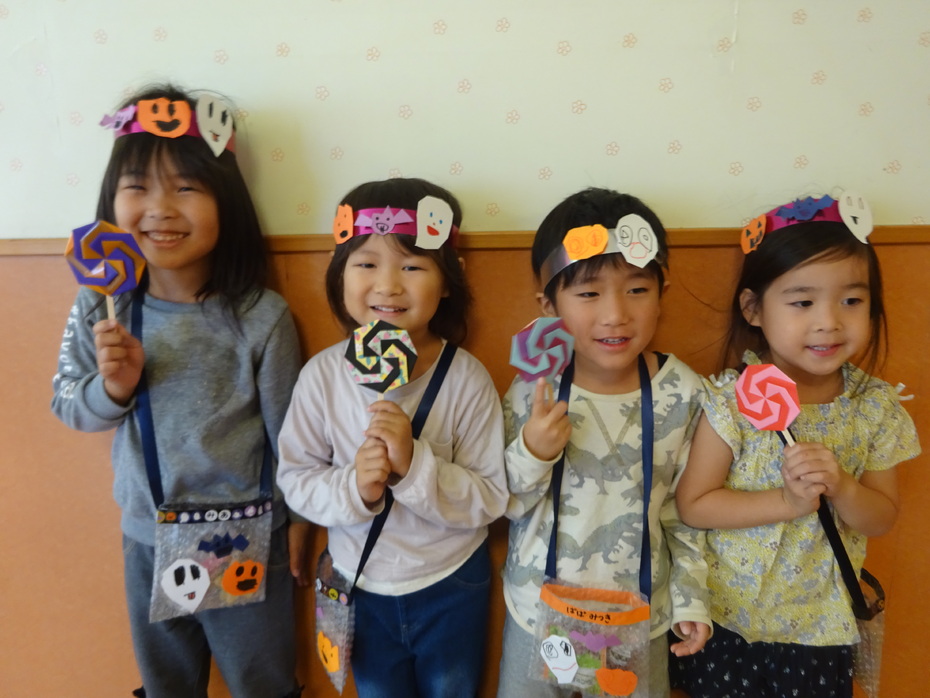 それぞれ自分たちで作った装飾品を身に付け、「ハッピーハロウィン」「お菓子をくれないといたずらしちゃうぞ」と言いながら、各クラスを回って行きました。