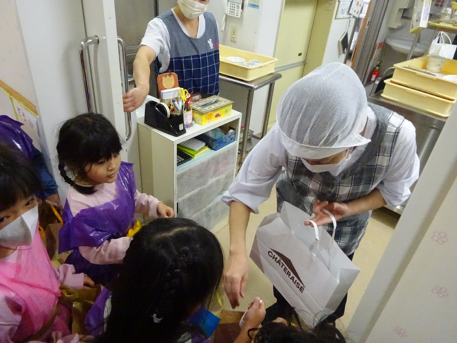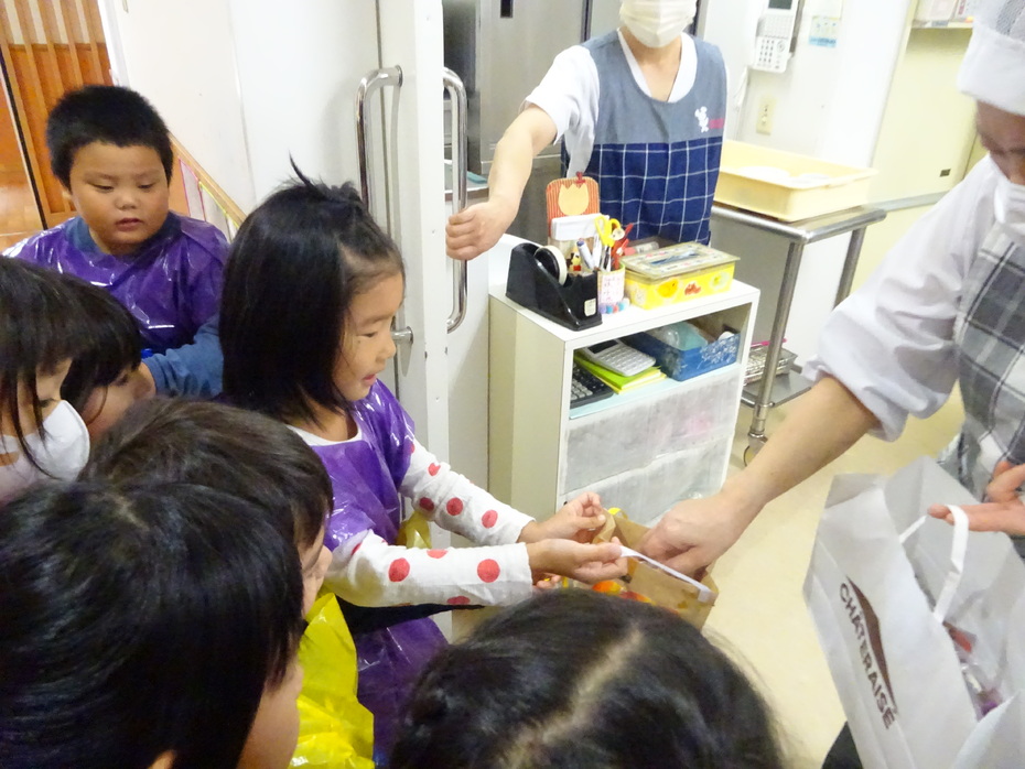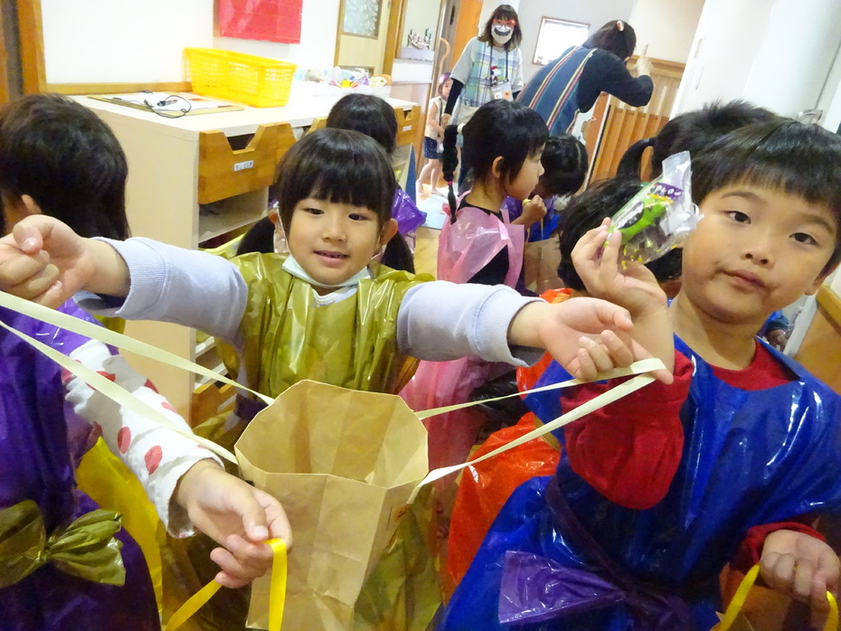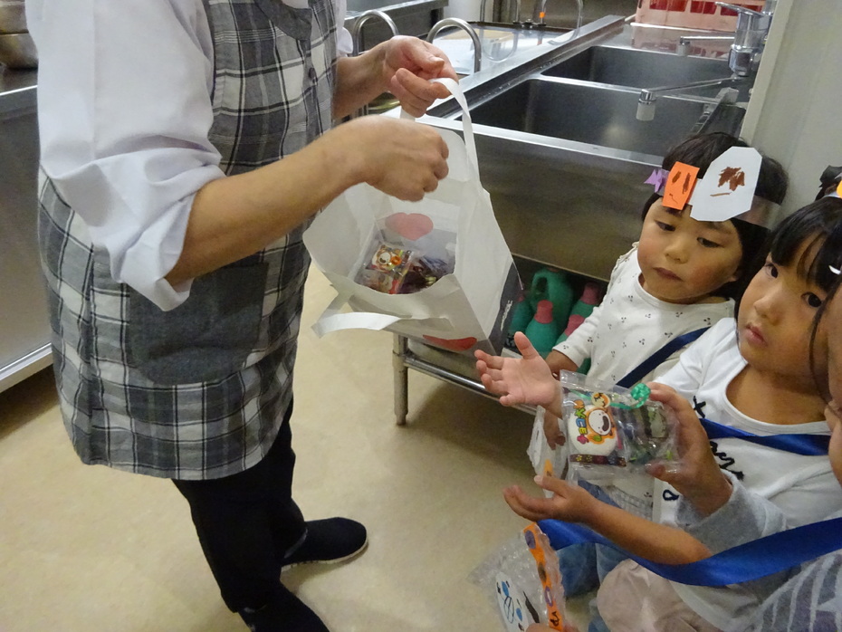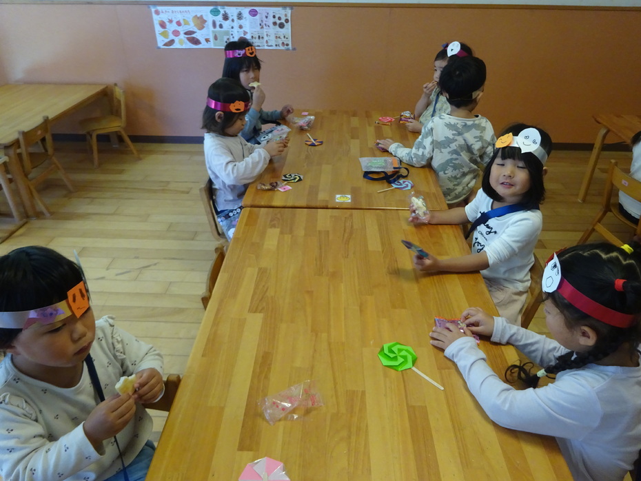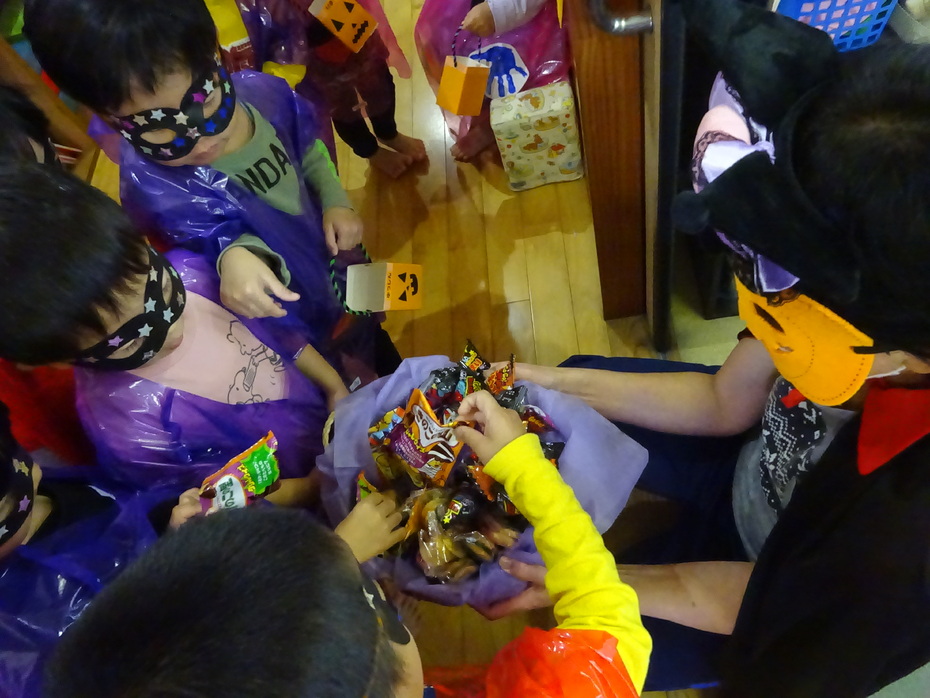 それぞれ自分たちで作った装飾品を身に付け、「ハッピーハロウィン」「お菓子をくれないといたずらしちゃうぞ」と言いながら、各クラスを回って行きました。