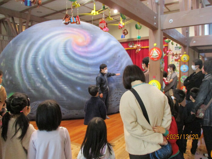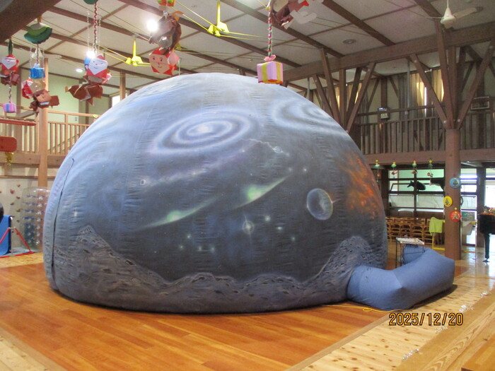 令和7年12月19日(金)と12月20日(土)の2日間にわたって、 『家族でプラネタリウムを楽しもう!』をテーマに、 遊戯室でプラネタリウムを観ました。 北陸モバイルプラネタリウムさんに6メートルあるドームを 設置していただき、遊戯室があっという間にプラネタリウムに大変身! 大きなドームが膨らんでいくのを子どもたちは興味津々にみていました。 | ||