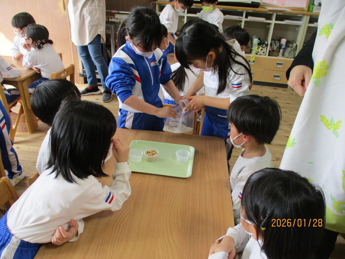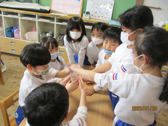 昨年みそ作りをした年長児たちに今年も年中さんがみそ作りをすることを伝えたところ、 「名前だけ聞いてわかるかな?」 「米こうじは本物見んとわからんと思う。」 「全部本物見せてあげたらいんじゃない?」 「入れる順番も近くで見せて見せてあげたらいいと思う。」と、 自分たちの経験をもとに、より分かりやすくするためにはどうしたらいいか たくさんアドバイスをくれました。 | ||