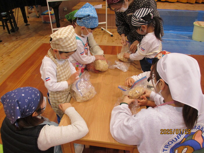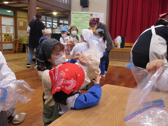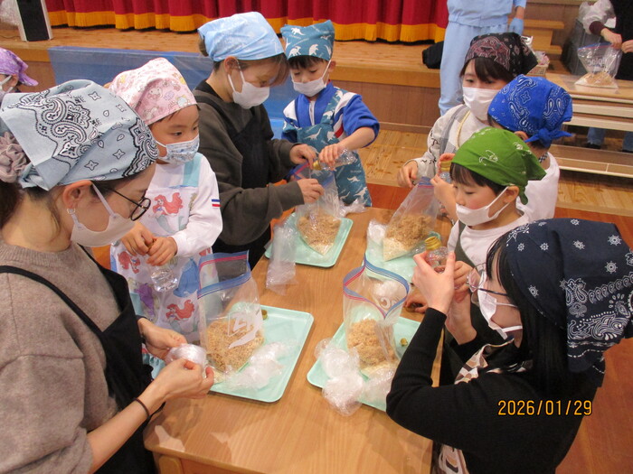 ・なかなかできない経験を親子でできてうれしかったです。 きぐみさんから引き継いだみそ作り。 教えてもらったことも、気持ちも大切にしていってほしいです。 ・事前学習のおかげで材料の名前や作り方を子どもが教えてくれてとてもスムーズでした。 ・とても貴重な体験をさせていただいて、家で何回も「楽しかったね」と言っていました。 ・パパにみそ作りの楽しかった出来事をたくさんお話していました。 | ||