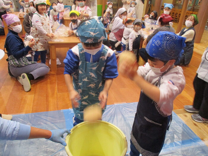 みそ作り教室当日の給食の味噌汁は、年長児が昨年作ったみそだったため、 「ぼくたちのみそも給食で食べれるかな?」と年中児のわくわく感もより高まり、 いざ本番。 山元醸造さんに教えてもらいながら、みそ作りがいよいよスタートです。 事前に年長さんに教えてもらったことを思い出しながら、 「材料は大豆と塩と米こうじと水なんやよ」 「これ、袋に入れるんやよ」と おうちの方とやりとりしながら作る姿がありました。 手だけでなく、全身を使ってダイナミックに混ぜていました。 最後には、みそ団子を樽に投げ入れるのですが、 自分の両手よりも大きなみそ団子を 大事に大事に袋から取り出し、樽に入れていました。 | ||