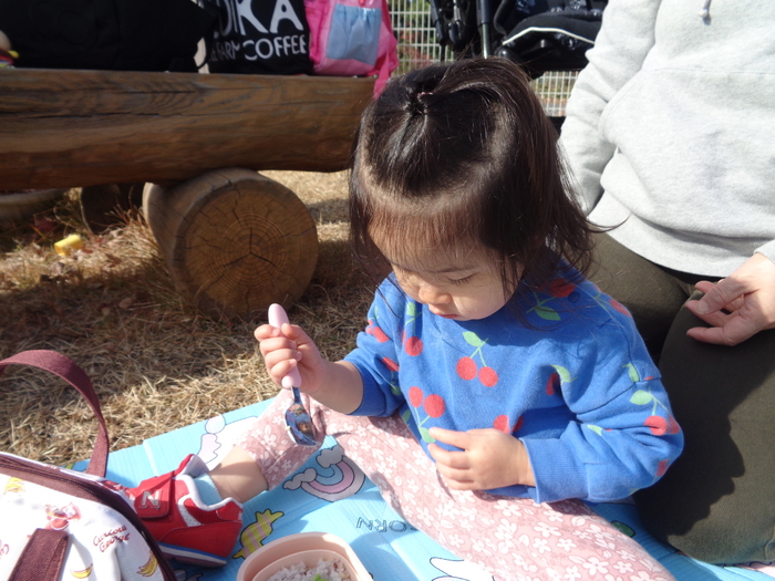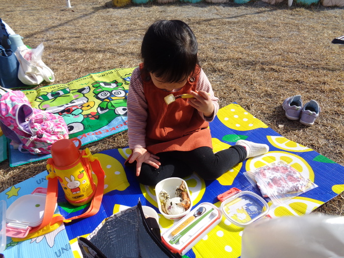 保育園の園庭で手作りお弁当を、嬉しそうにパクパク食べていました。