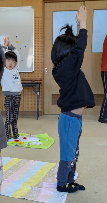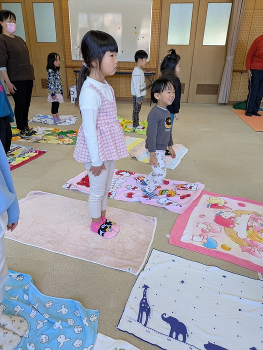 ヨガ体験 今日は近くの公民館で開催したヨガ教室に参加しました 3歳4歳5歳のお友だちが参加しました ほとんどの子ども達がヨガ初体験で、ドキドキ、わくわくの連続でした 保護者のお迎えの時、嬉しそうにヨガ体験について話をする姿も見られましたよ とてもいい体験ができました | ||