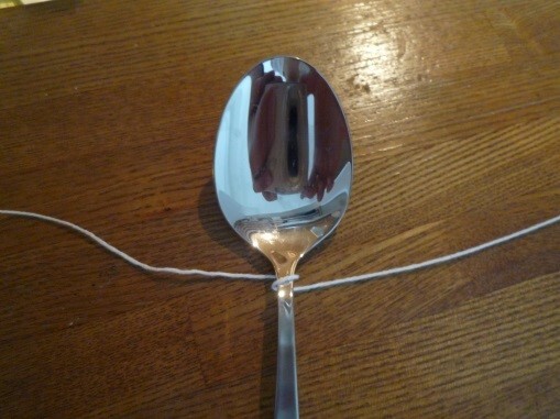 『 スプーンの音』 ステンレスのスプーンのすくう部分と取っ手部分の境に糸を結びます。両手の人差し指に2重ほど糸を巻きつけ指を耳に入れます。スプーンを固い部分にぶつけると振動が糸を伝わり耳に届き、きれいな音が聞こえます。ぶつけるものによって音色は変わるので、いろいろなものに当ててみましょう。 | ||