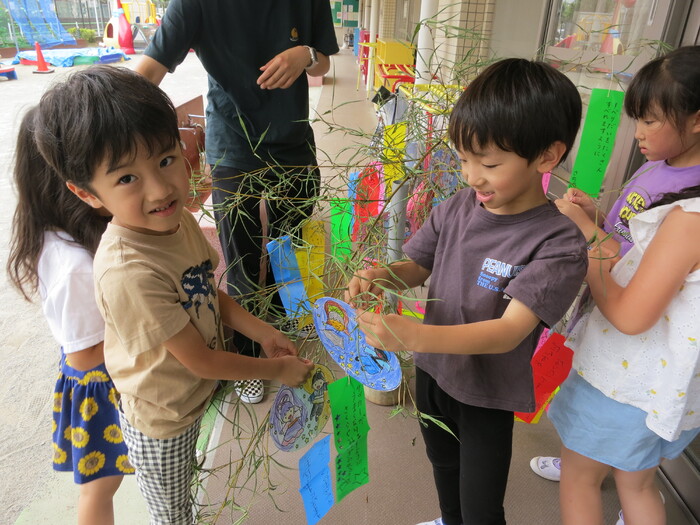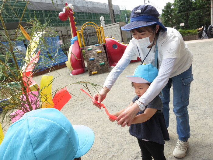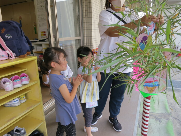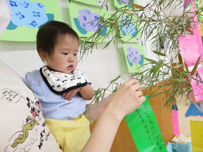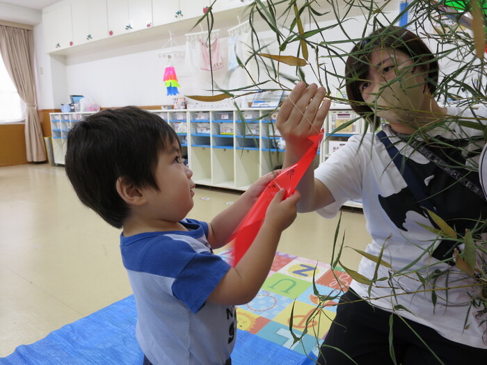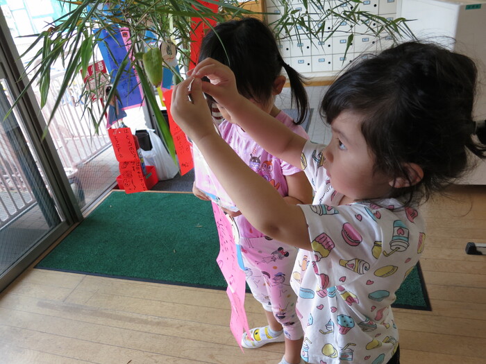 今年も七夕の季節がやってきました。先日、子ども達と一緒に笹の葉に短冊の飾りつけをしました。 「〇〇になりたい」「○○を沢山食べたい」など、それぞれの思いを込めて書いた 短冊を「どこに掛けたら願いが叶うかな?」「ここなら良いかな」と子どもたちなりに一生懸命考えながら飾っていました。 お友だちの短冊も見ながら「願いが叶うと良いね」ととても楽しそうでした。 今年もみんなの願いが届き叶いますように・・・・・・ | ||