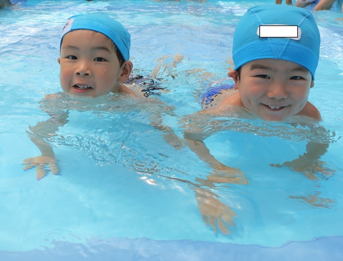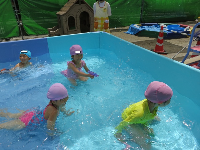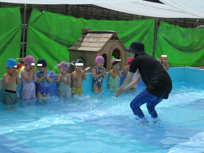 例年にない暑い日が続きプールには子供たちの元気な歓声と水しぶきが飛び交いました。地域の方も子供たちの元気な声に足を止め、夏のひと時を感じているようでした。 冷たい水の感触に初めはおそるおそるプールに入っていた子も徐々に水になれ、ワニさん歩きや水鉄砲などたくさん体を動かし、水の刺激や感触を楽しみました。まだまだ続く暑い日。たくさん遊んで、しっかり休息を取り、体調管理に気を付けながら元気に暑さの残る日を楽しみ秋を迎えたいですね。 | ||